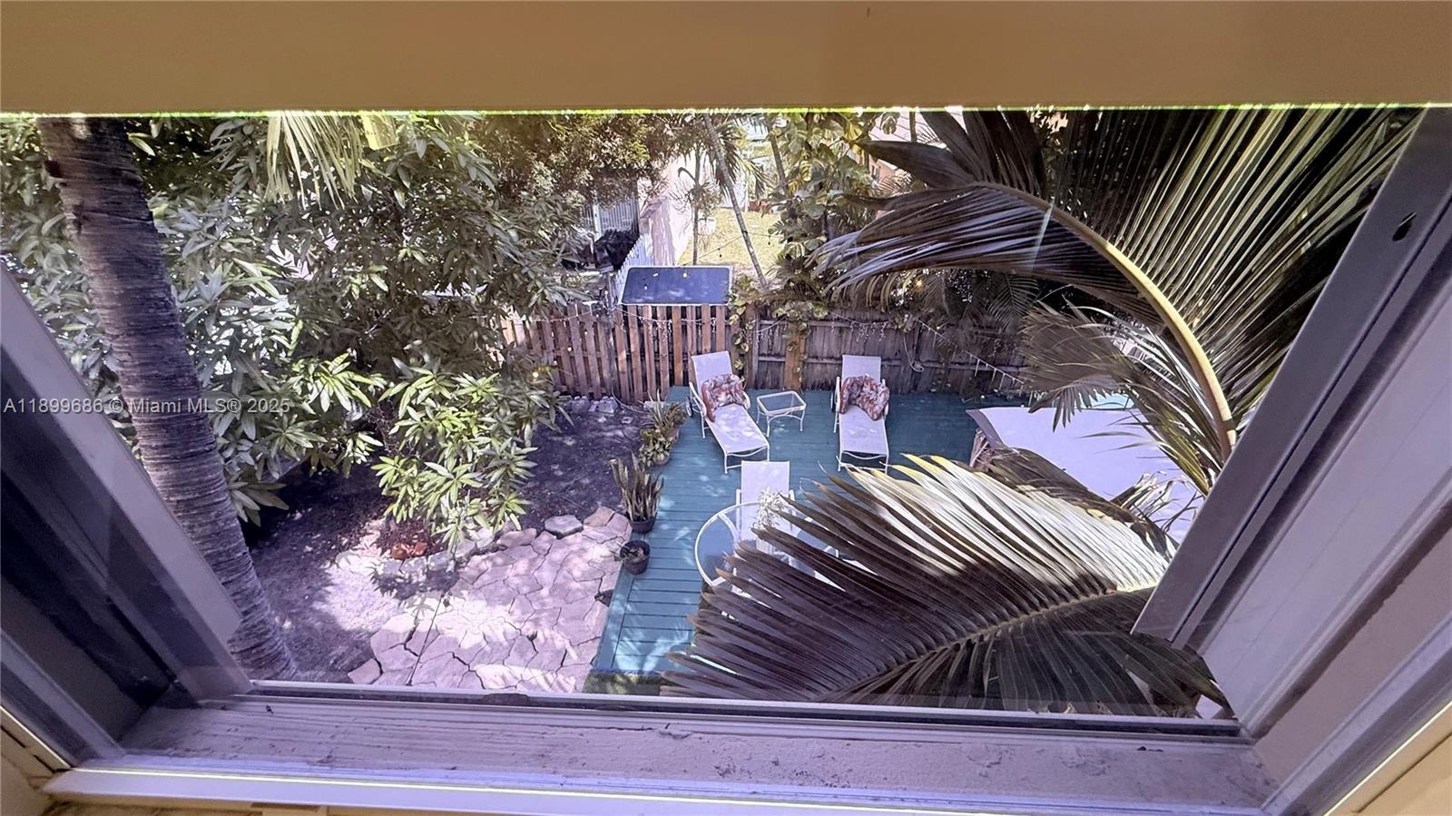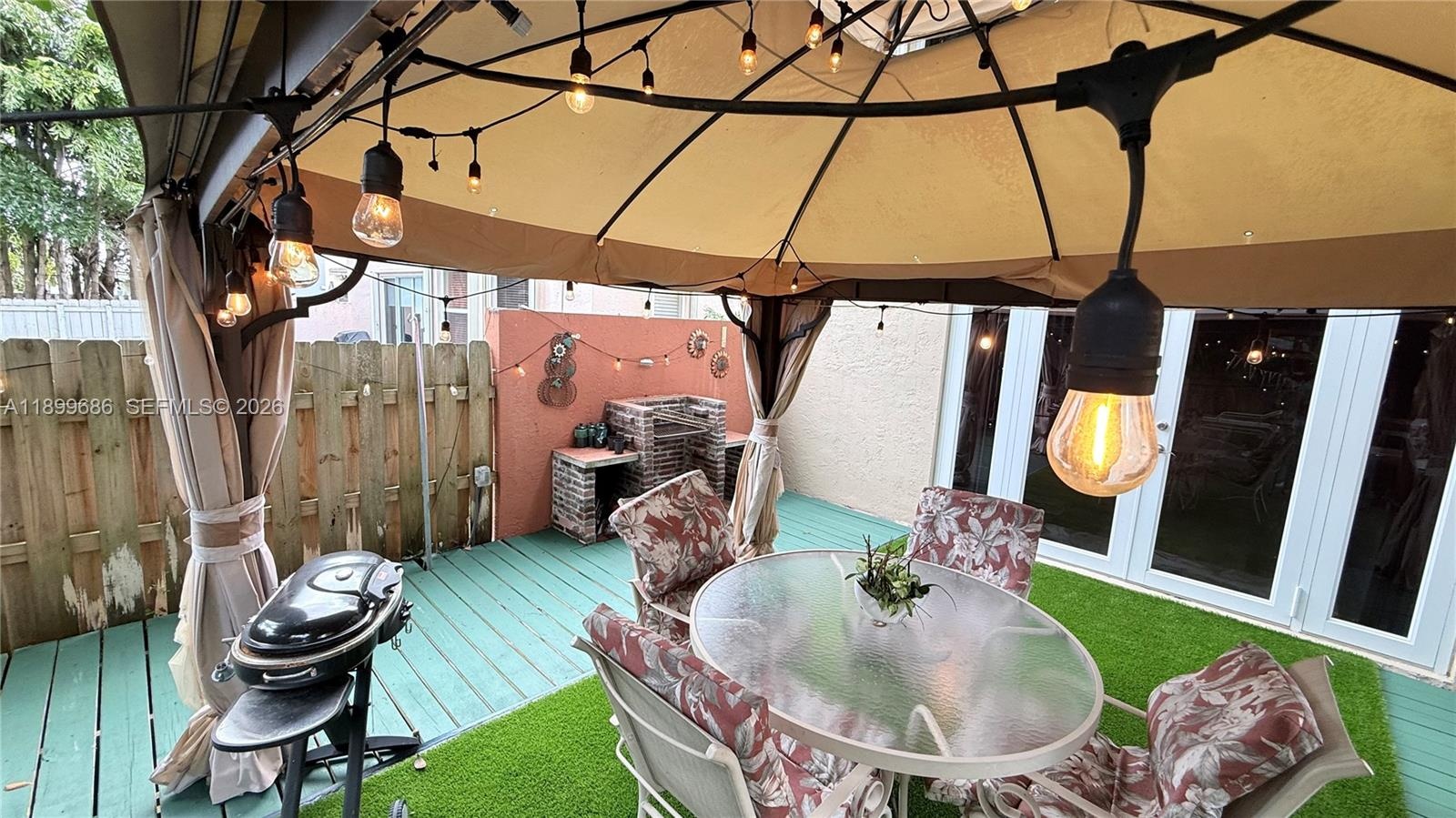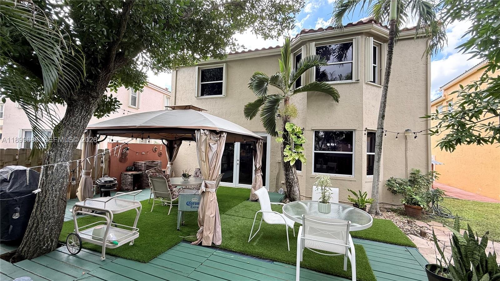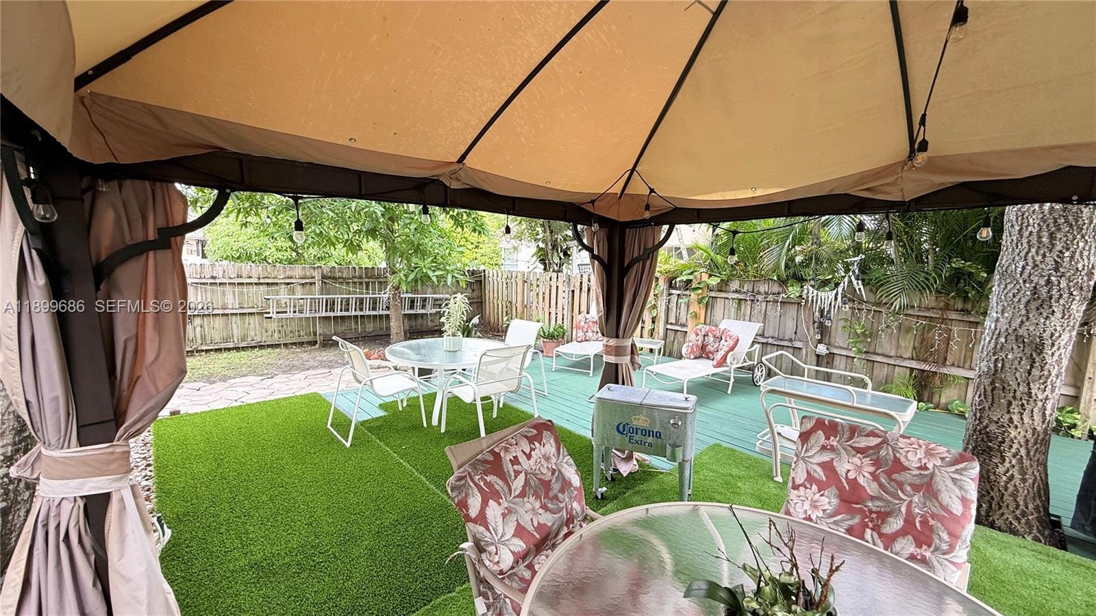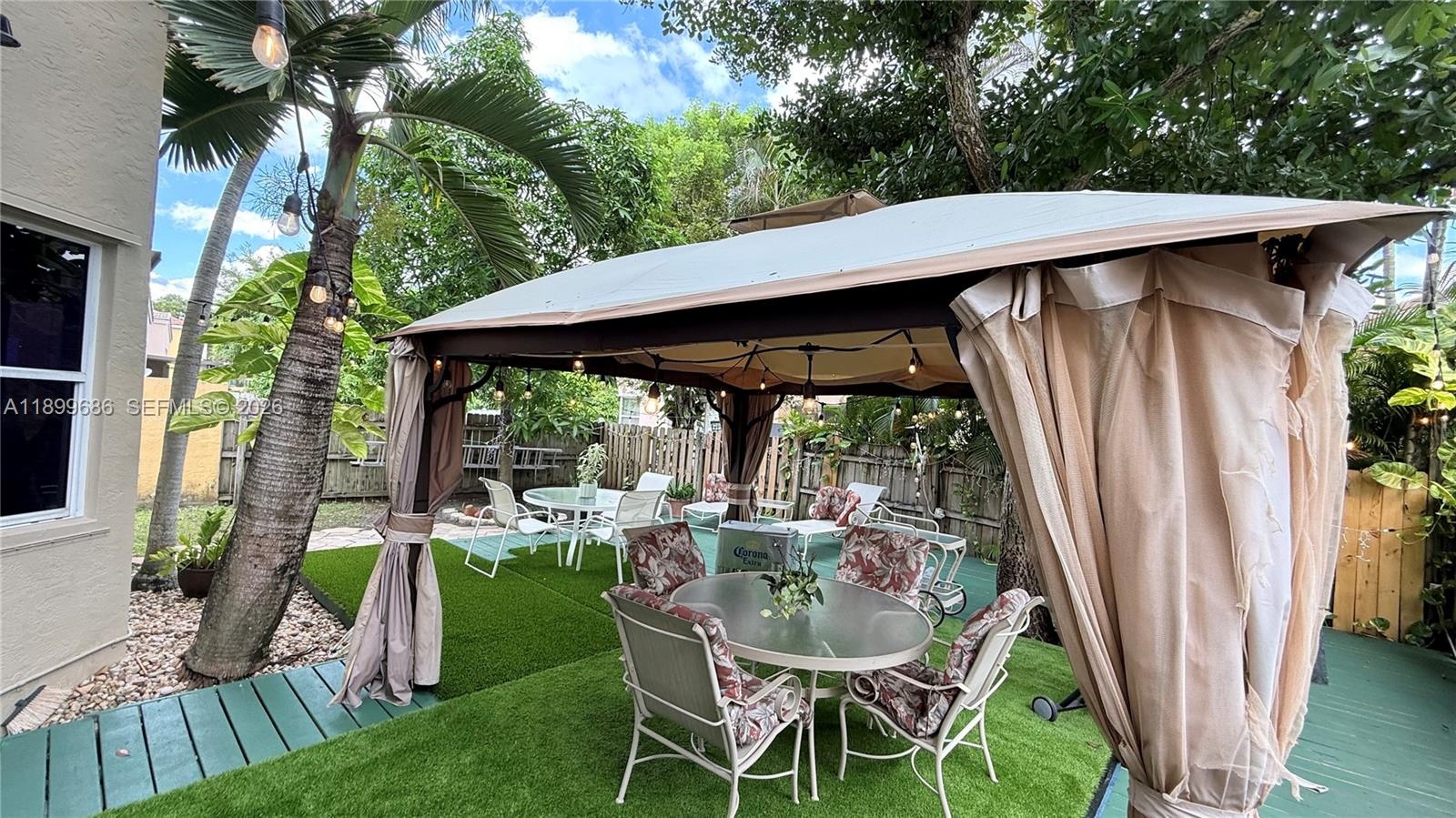 Enjoy your private fenced backyard oasis with a wood deck, gazebo, BBQ area, lush landscaping, and a mango tree—perfect for entertaining.