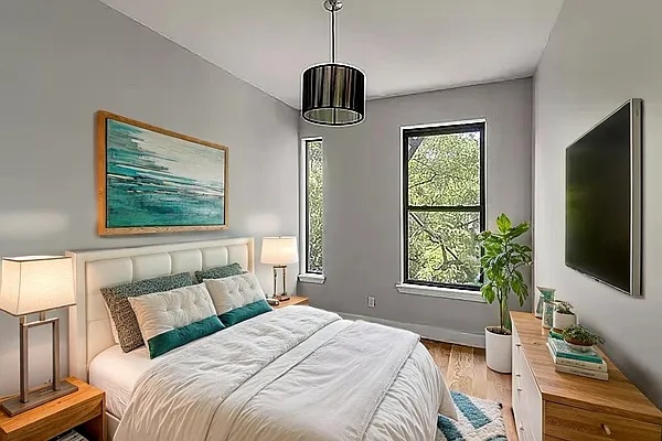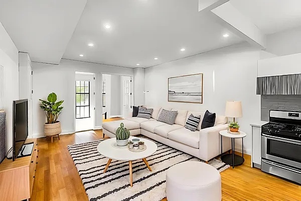 This 4BD / 2BTH apartment enjoys tremendous natural light, a renovated kitchen, and an open plan living/dining area. A fully updated kitchen with white countertops, white cabinetry, and stainless steel appliances is directly next to the living/dining space. All bedrooms feature a designated closet. Two full baths are located off the kitchen, both with a shower/soaking tub.