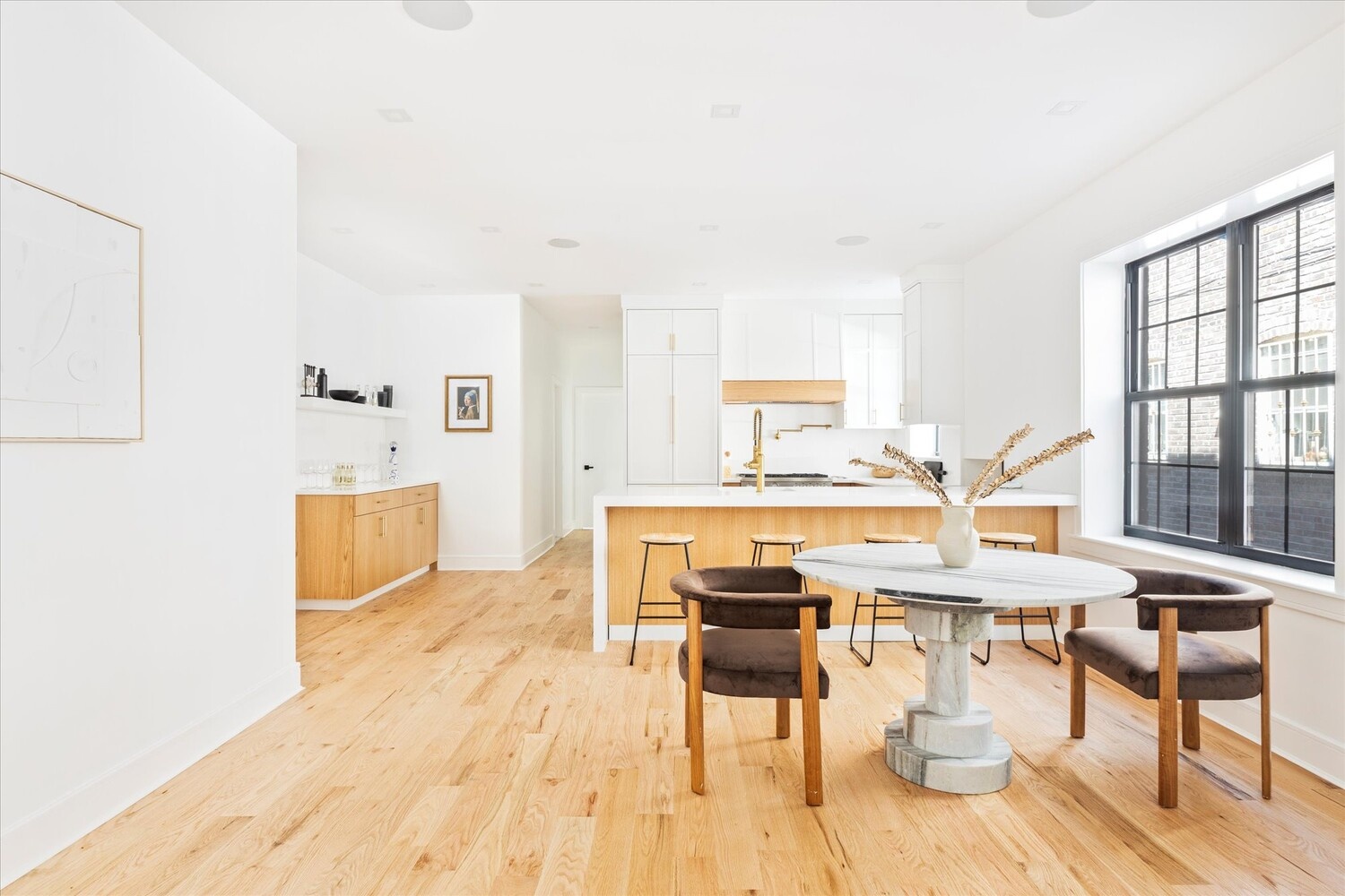 The owner's duplex is bright and airy, featuring warm white oak flooring and an open-concept layout that seamlessly connects living, dining, and kitchen spaces. The oversized chef's kitchen is a true showstopper-crafted with custom cabinetry, quartzite countertops and backsplash, and premium Bertazzoni appliances, blending beauty and practicality for everyday living and entertaining.