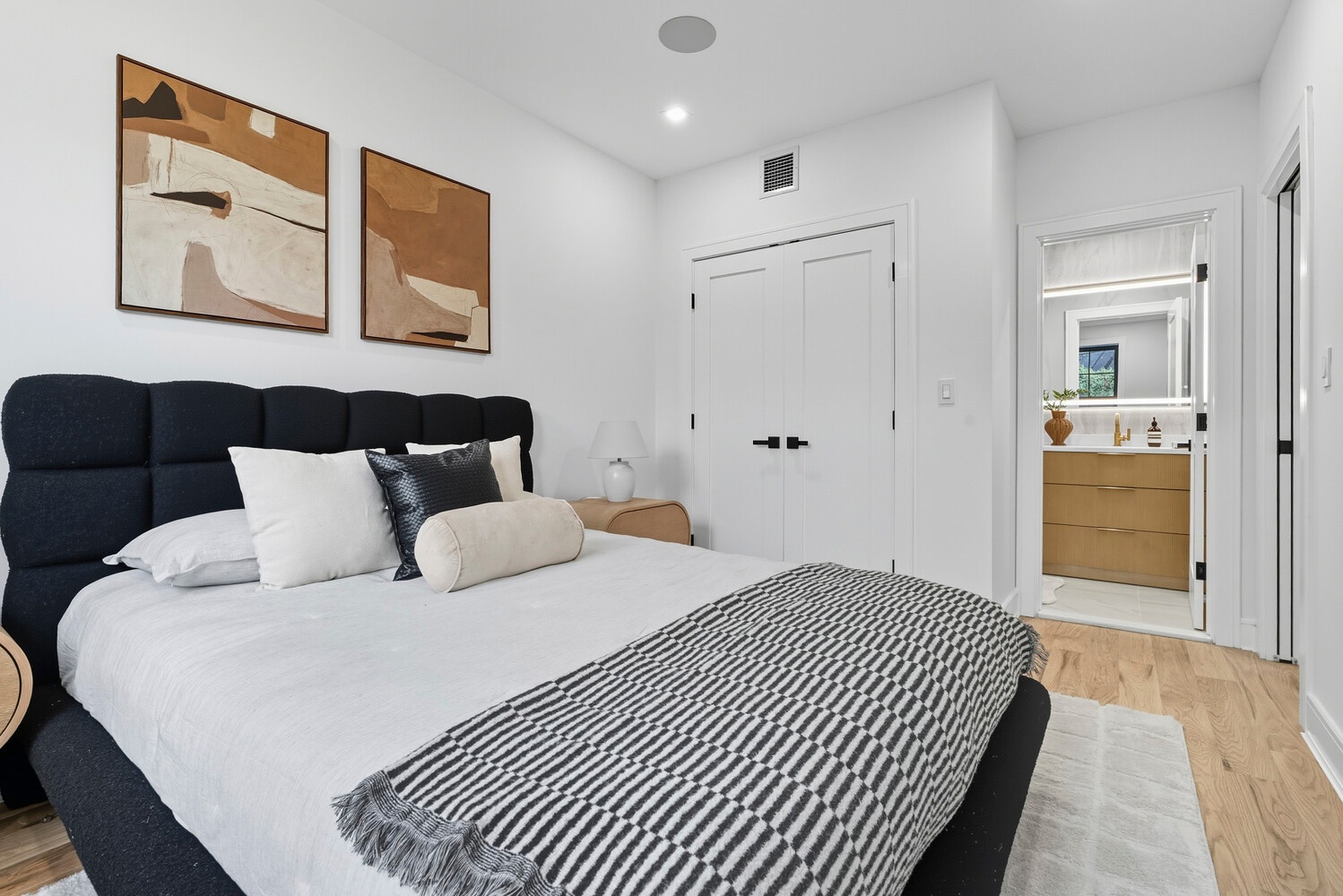The primary suite feels like a private retreat with a spa-style bath featuring a rain shower and custom vanity. Two additional bedrooms receive beautiful light and share a sleek full bath. The finished basement adds tremendous value with high ceilings, a full bath, a recreation room, a separate exterior entrance, and multiple daylight windows that make the space feel like a true extension of the home-perfect for a gym, media space, office, or guest suite.