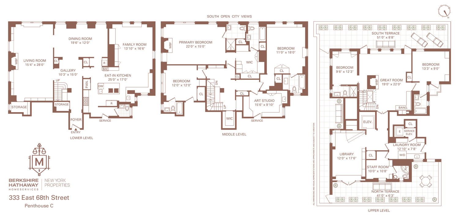The upper floor opens into a spectacular glass-wrapped great room with soaring ceilings and access to a sweeping 1,600-square-foot terrace. Surrounded by open city views, this outdoor space easily accommodates lounging, dining, and gardening. Two additional bedroom suites, a cleverly concealed library hidden behind a bookcase, a staff room with bath, and a windowed laundry and utility area make up the remainder of this level. Both passenger and service elevators reach the penthouse floor for convenience.