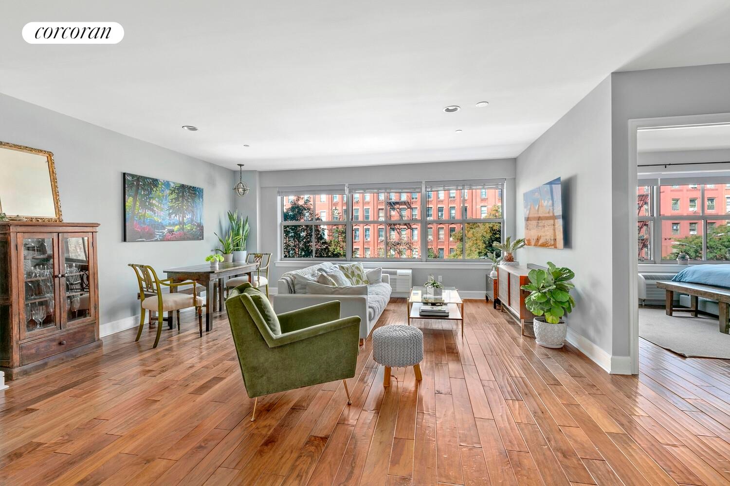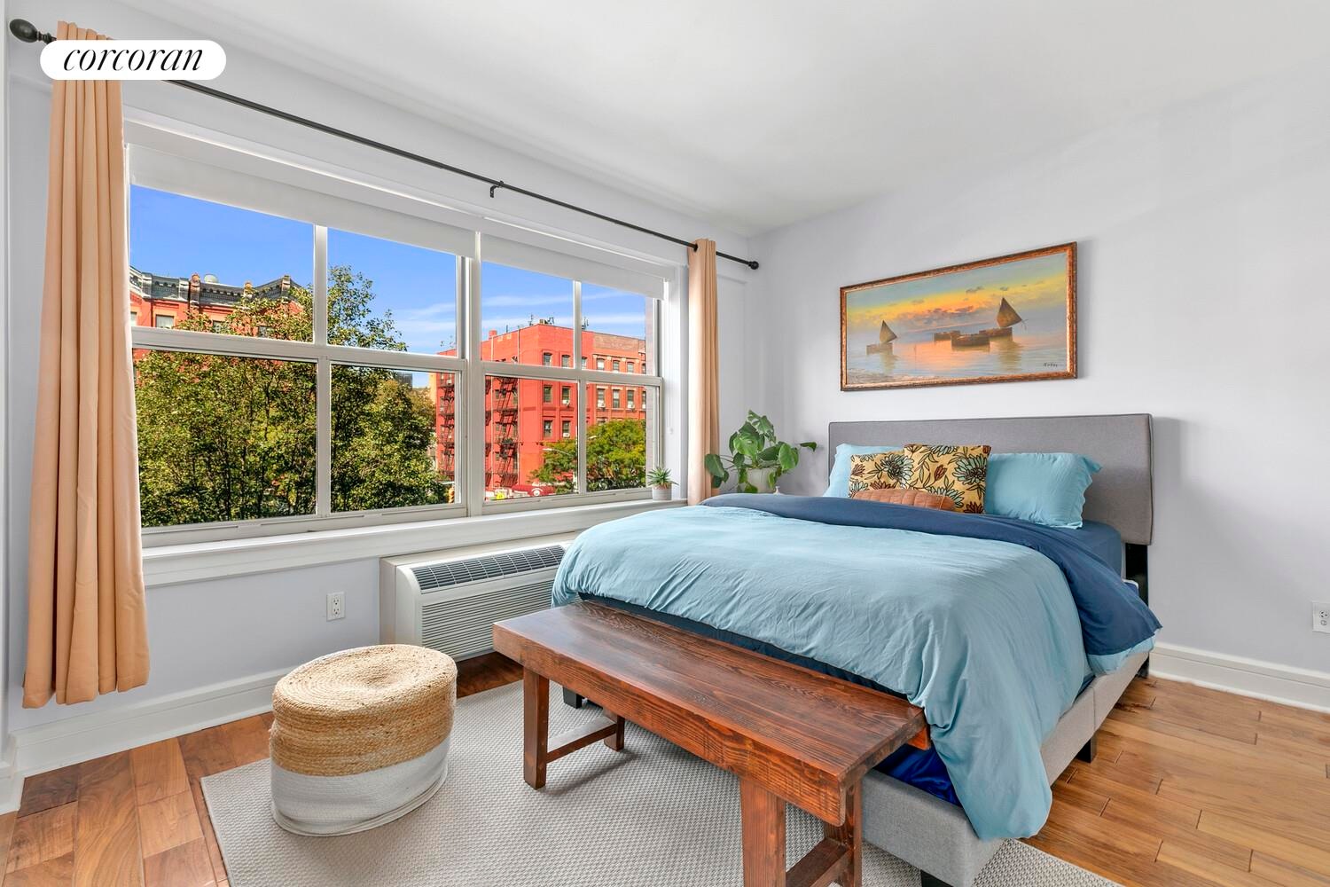 The primary bedroom is an oasis all it's on, easily accommodating a king size bed and a separate seating area. There is a large walk-in closet and a massive en-suite bathroom with double vanity, artesian tiles and a glass enclosed shower. The second bedroom also easily fits a king size bed and has two double door closets. Both bedrooms offer a number of home office options. There is new wide plank, white oak wood flooring throughout and an in-unit washer/dryer. Tax abatement extends through 2034.