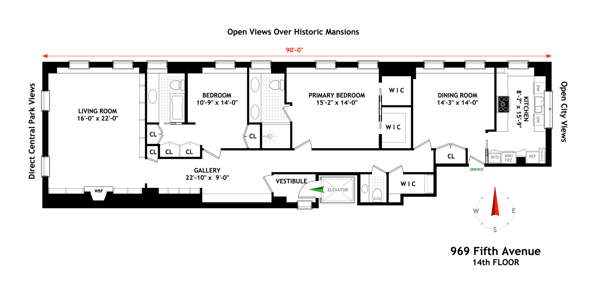 The apartment has been fully updated in the contemporary style, perfect for large format works of art to bolster the big views. The primary bedroom is spacious with a jaw dropping bath anchored by a fantastic view up Fifth Avenue. With a perfectly devised layout, the 14th Floor is a dramatic and comfortable home. There is central air conditioning throughout, wonderful hardwood flooring, a wood burning fireplace, numerous built-ins and induction stove in the windowed and up-to-date kitchen. There is also a washer and dryer in the unit.