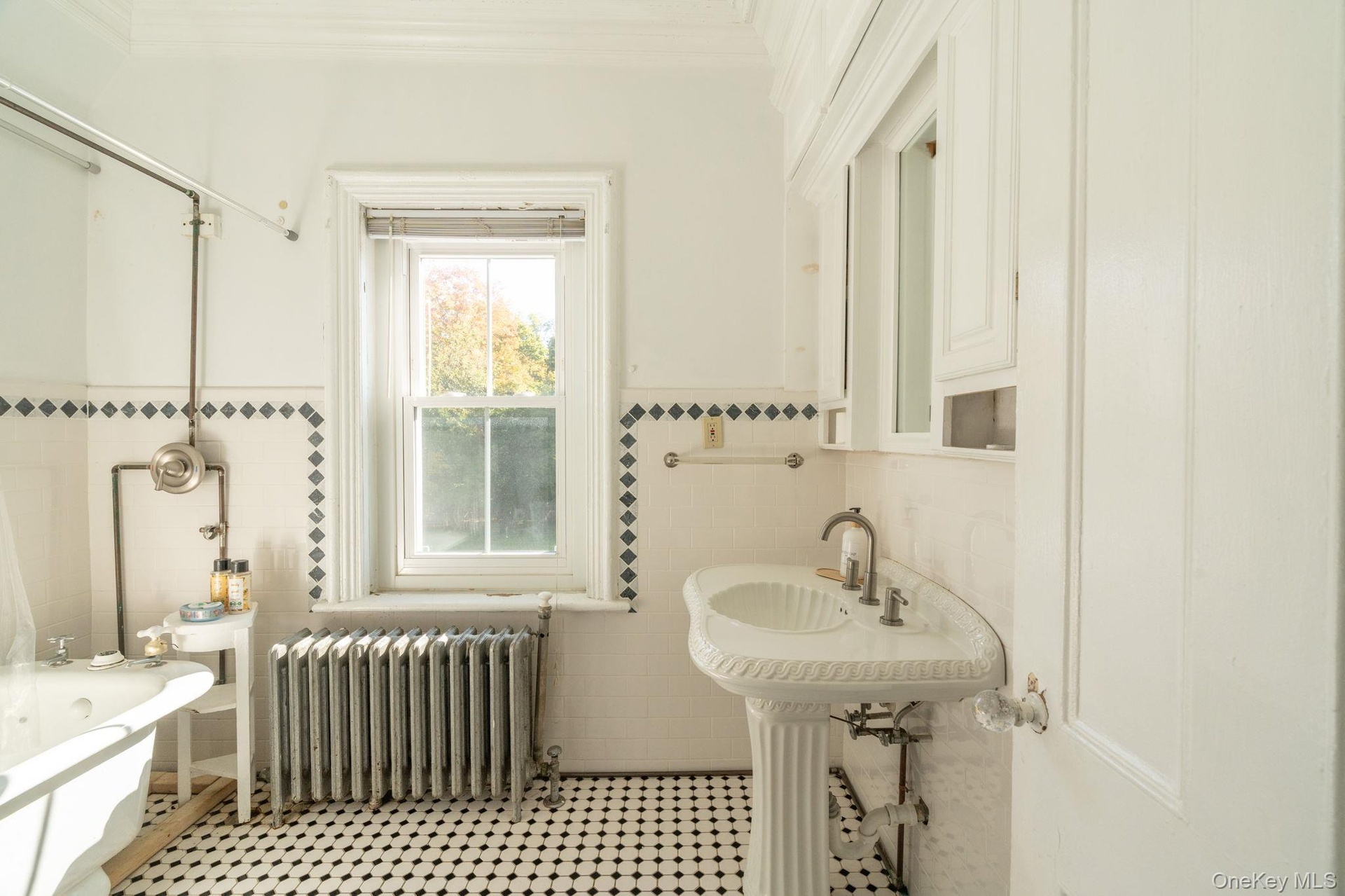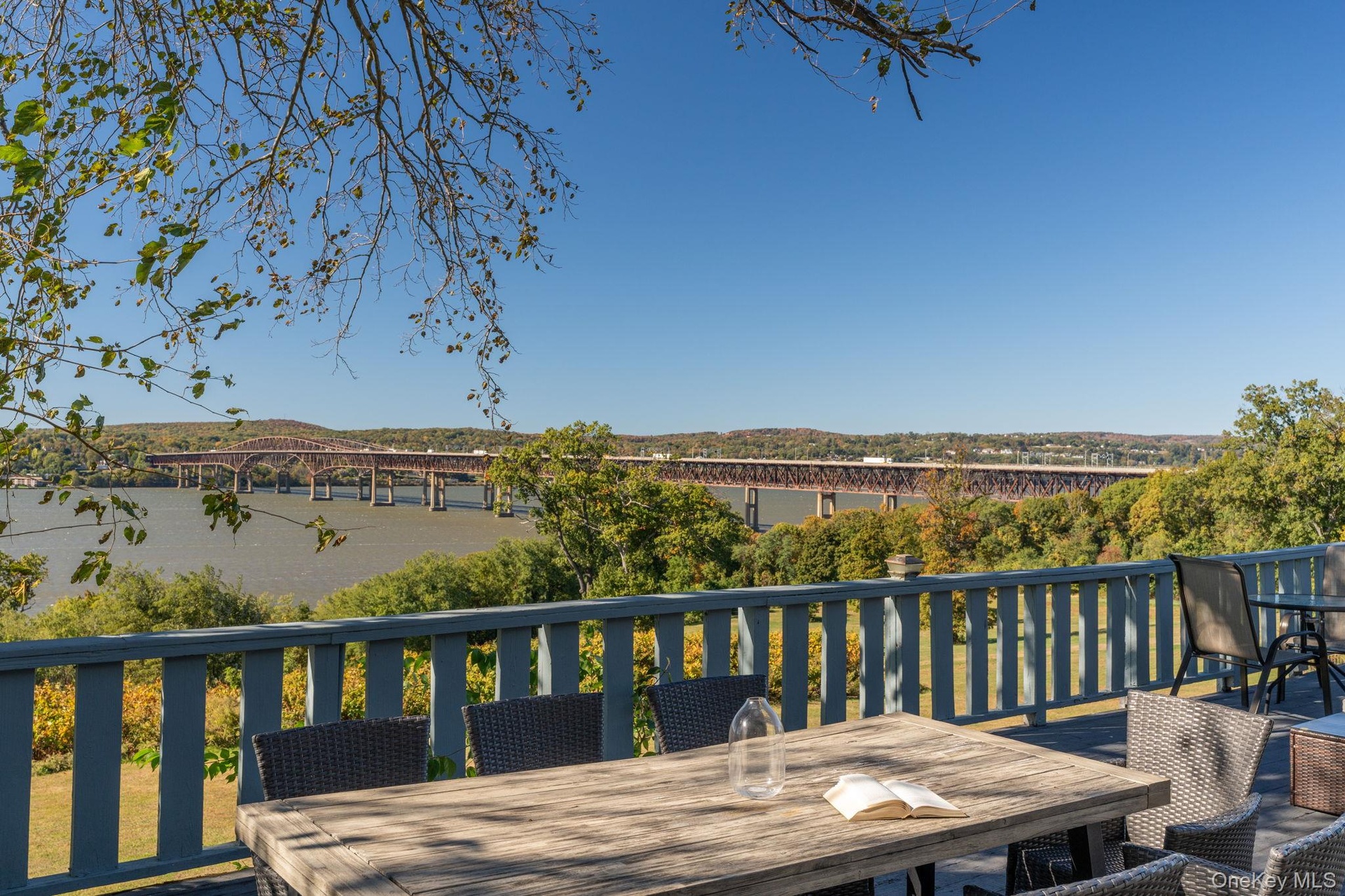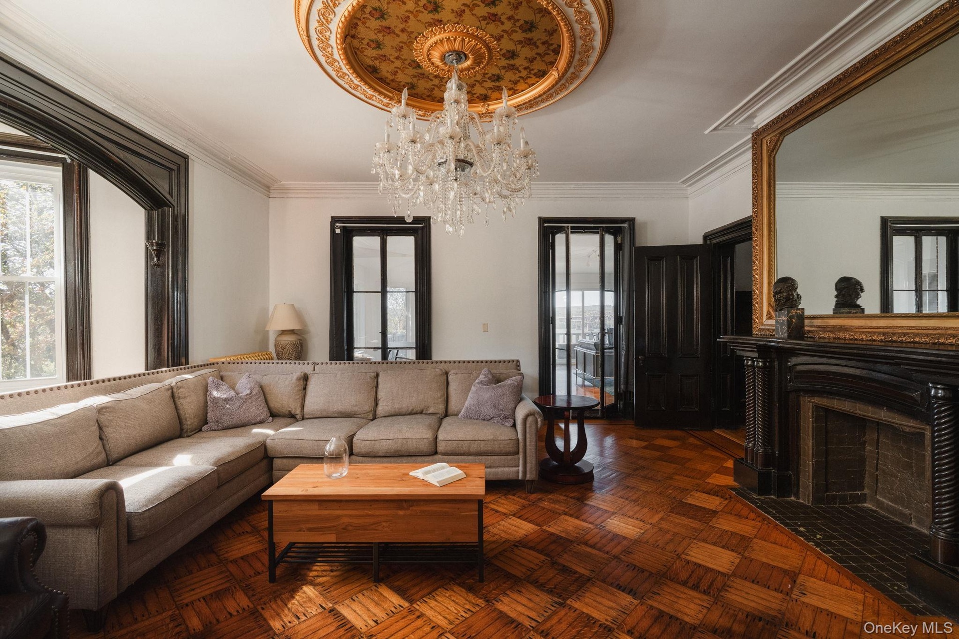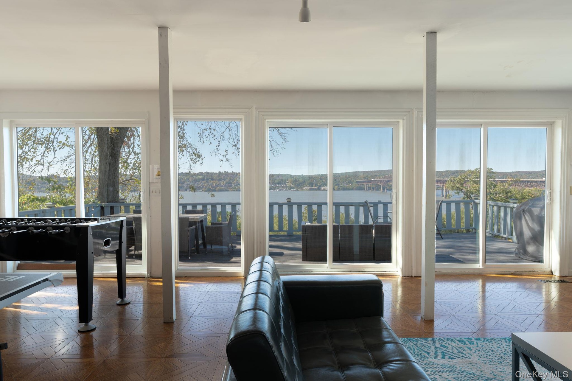 The main level features formal entertaining rooms with tall bay windows and French doors that once opened to a sweeping veranda — now leading to an enclosed family room and deck with panoramic Hudson River views. A large main-floor bedroom offers flexibility for guests or single-level living. The living room flows seamlessly into a billiard room and library, creating a sophisticated setting for intimate gatherings or grand celebrations.