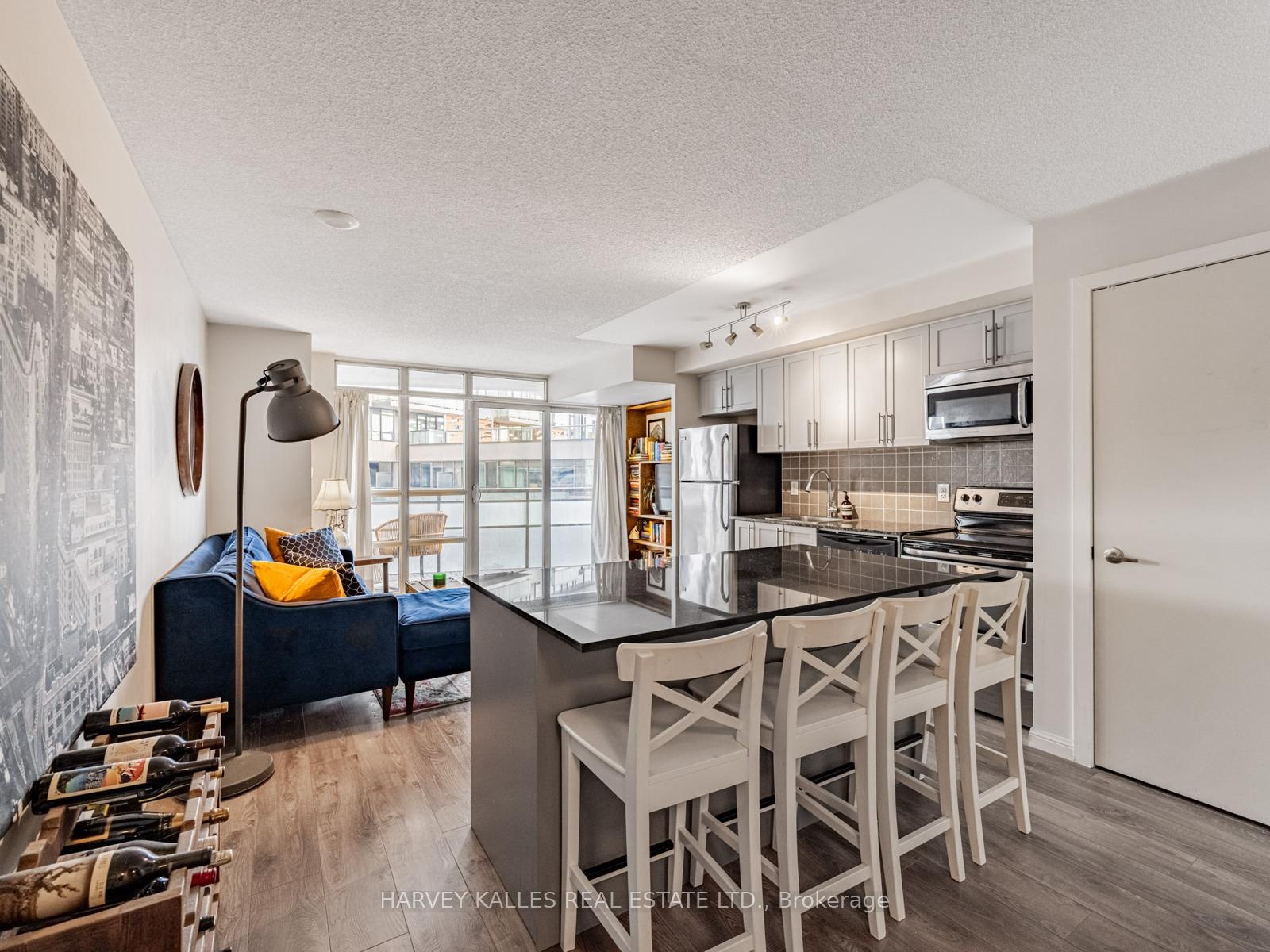 Beautifully renovated and thoughtfully designed, this suite features a gourmet kitchen with updated cabinetry, stainless steel appliances, granite counters, and a unique extra-large movable centre island with built-in storage and seating for four. New laminate flooring throughout and a balcony with stunning city and lake views. The spacious primary bedroom offers a 4-piece ensuite and mirrored storage cabinet. Approximately 625 sq. ft. of perfectly laid-out space with excellent flow. Enjoy amazing amenities including access to a dog run. Located in the best part of King West-steps to restaurants, shops, public transit, and more. Parking and locker included.