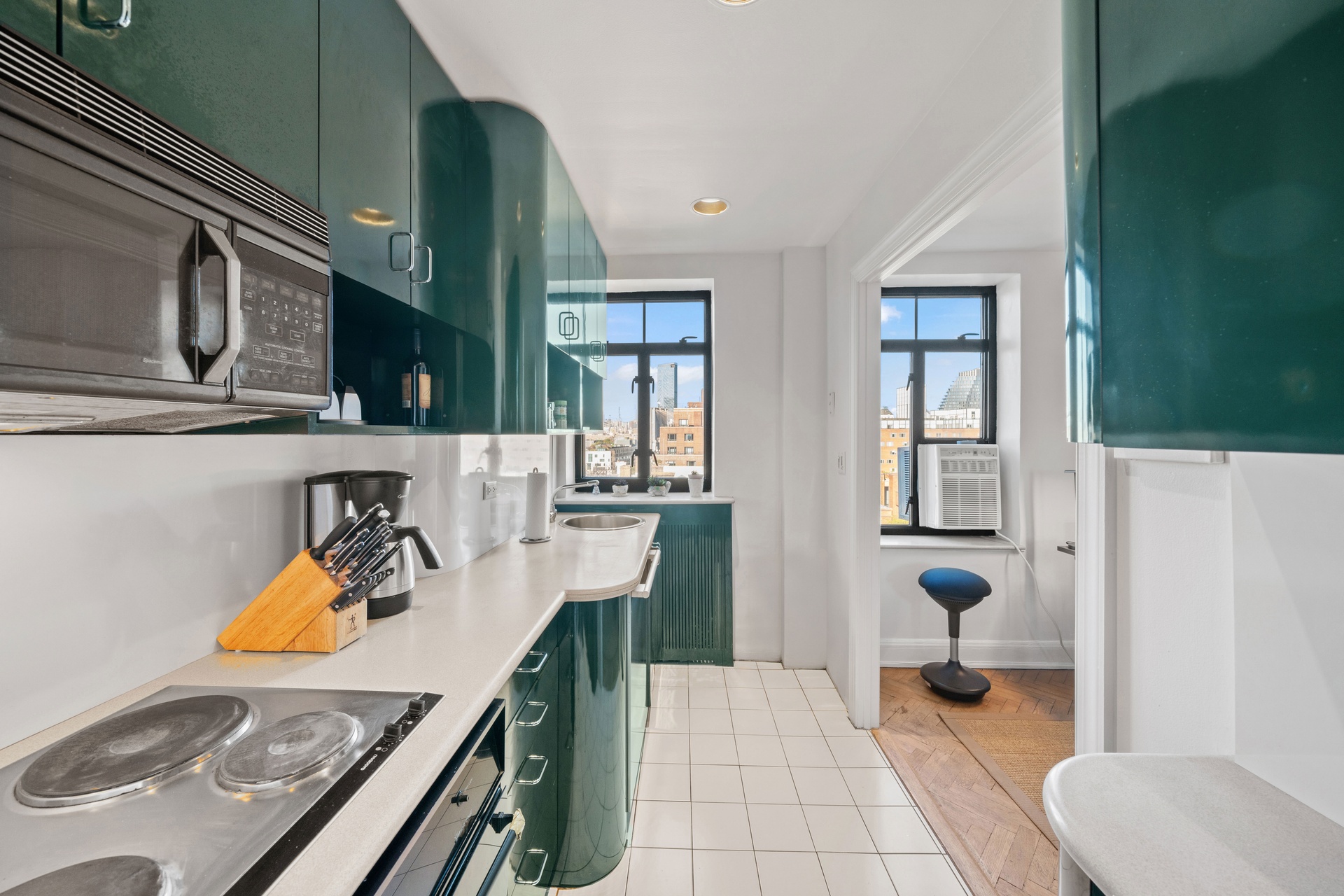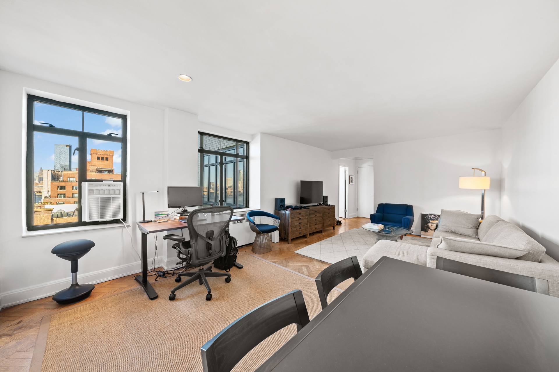 The spacious living room features warm hardwood floors, elegant moldings, and abundant natural light—perfect for relaxing or entertaining with a view. The kitchen is outfitted with sleek cabinetry, stainless steel appliances, and generous counter space, opening seamlessly to a dining area ideal for hosting dinner parties.