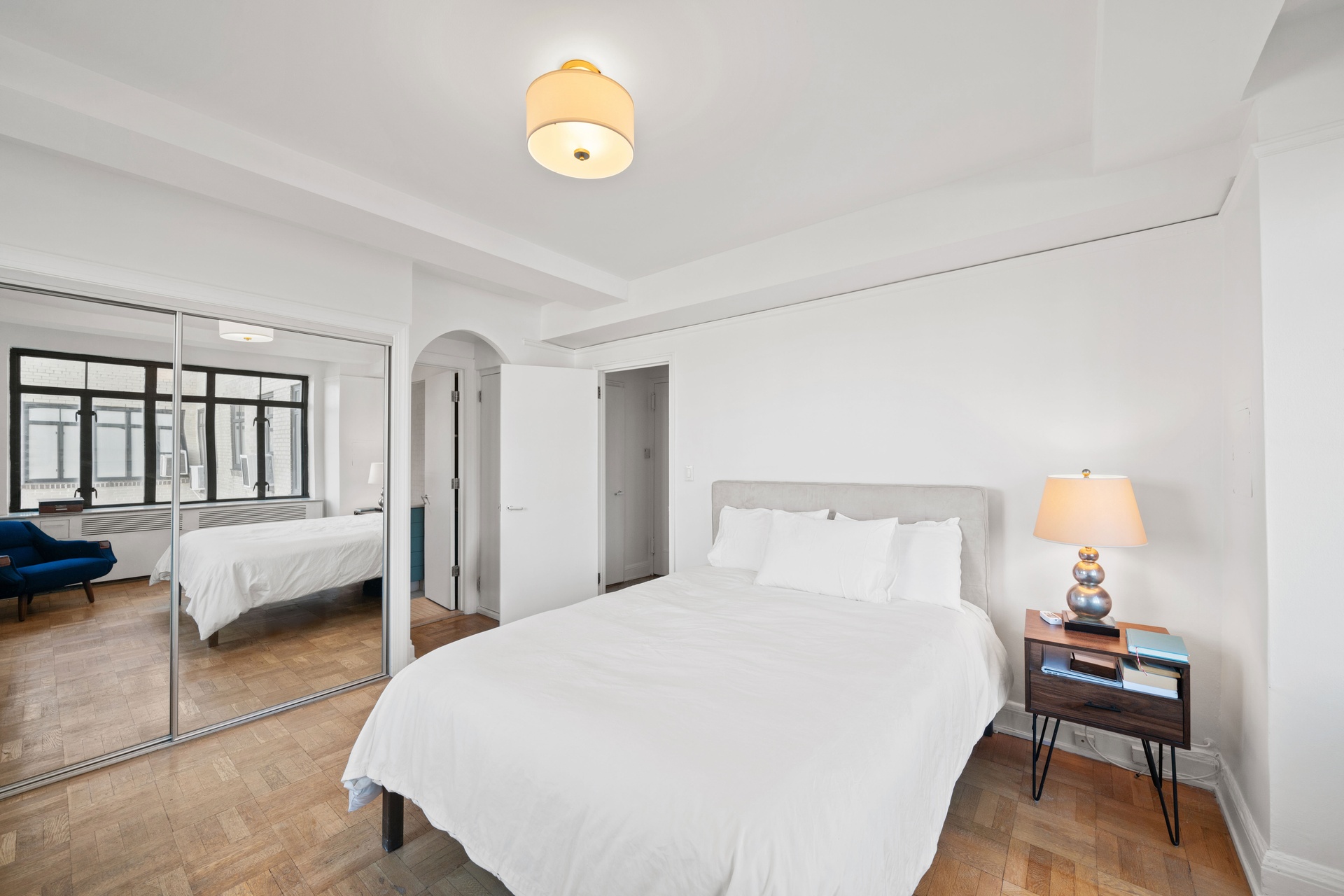 The bedroom comfortably fits a queen bed and offers both tranquility and skyline vistas, while the renovated bathroom combines clean lines with timeless finishes.