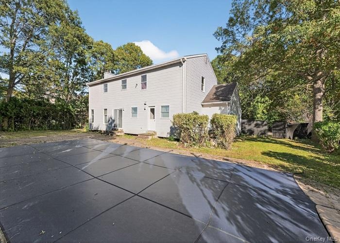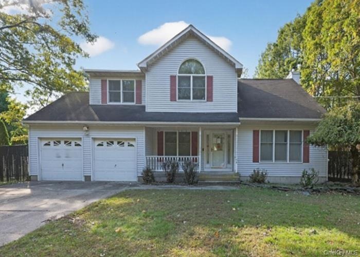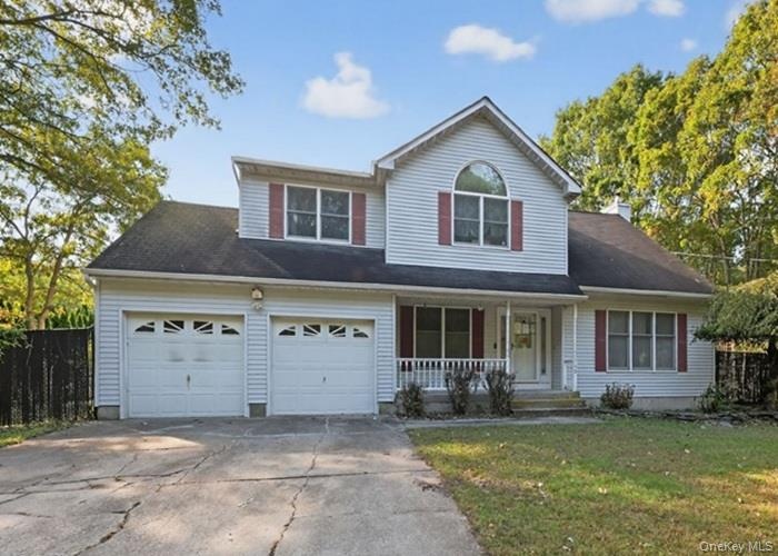 Traditional-style home featuring covered porch, driveway, and a chimney