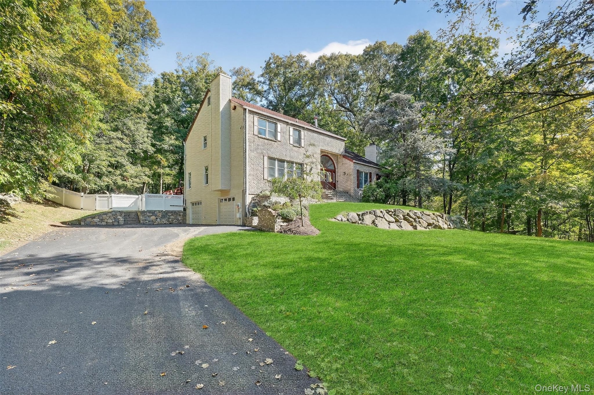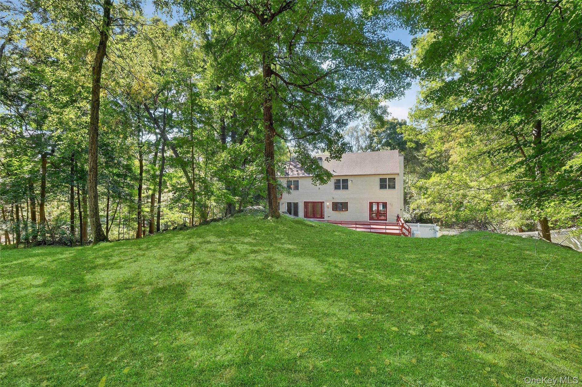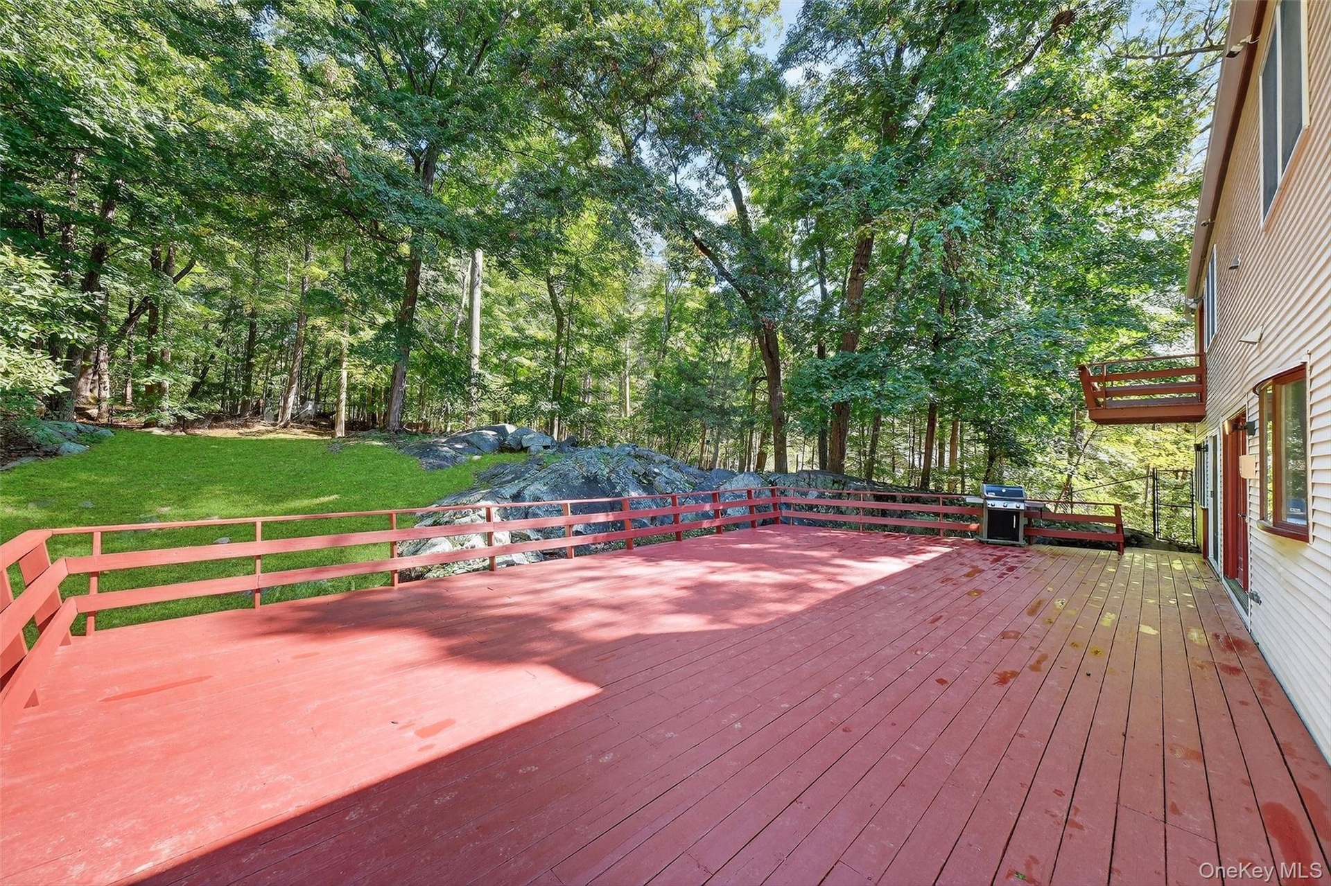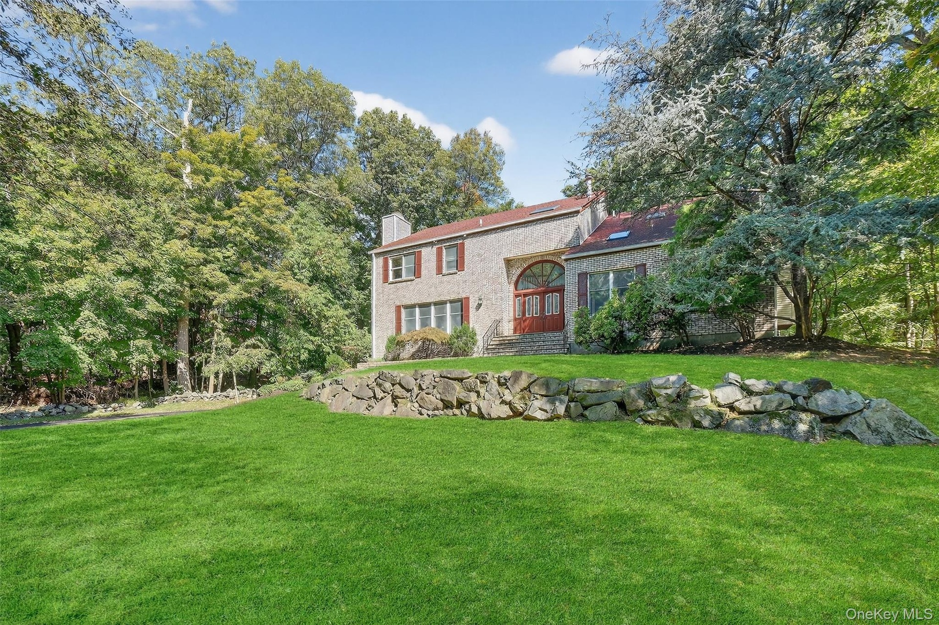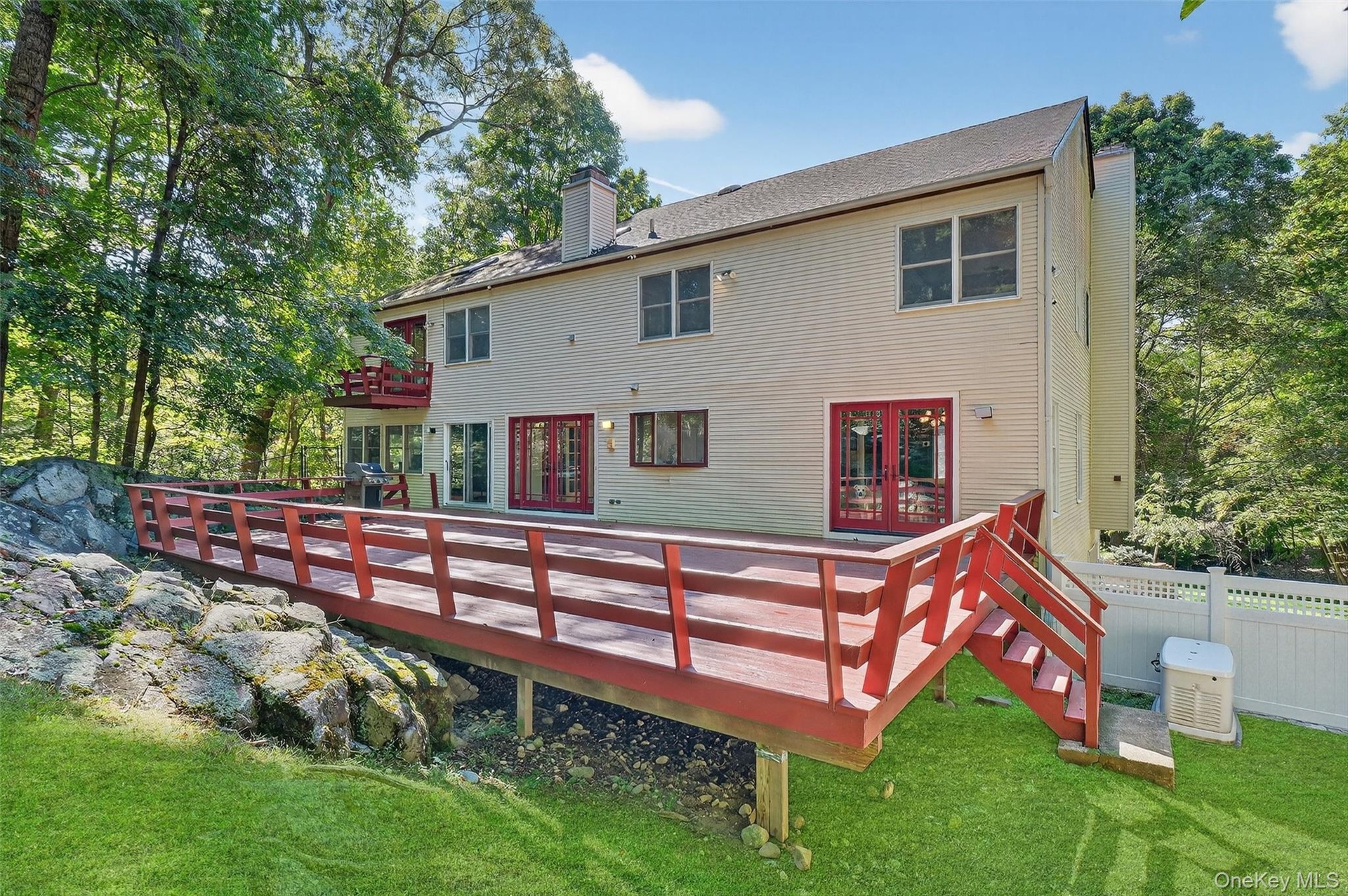 This impressive 3,748 sq. ft. contemporary home is set on 3.2 wooded acres, offering the perfect blend of neighborhood living and total privacy. The main level welcomes you with a spacious entry foyer, family room with skylights, custom windows, and a striking stone wood-burning fireplace. A step-down living room with fireplace and a step-up formal dining room with French doors to an oversized deck provide wonderful flow for entertaining. The expansive kitchen features a gas cooktop island, double Wolf wall ovens, microwave, stainless steel refrigerator, butler’s pantry, and large dining area with French doors to the deck. A private home office with deck access, den, full bath, and laundry complete the main floor. Upstairs, the enormous primary suite boasts a fireplace, skylight, Juliet balcony, two walk-in closets, and a luxurious bath with jetted tub, shower, double sinks, and bidet. Three additional spacious bedrooms share a beautifully updated full bath with custom tile shower. A large open balcony overlooks the entry foyer. Additional features include a full unfinished basement, 2-car garage, fenced yard with 4 access points, new doors, central vacuum, whole-house natural gas generator with automatic switchover, new driveway, and new central air conditioning. Surrounded by mature trees and just 3 miles to Metro-North, this home combines comfort, updates, and convenience in a serene setting. Enjoy year-round activities along the Hudson River, including concerts, the scenic River Walk, golf, hiking, biking, fine dining, shopping, and live theater.