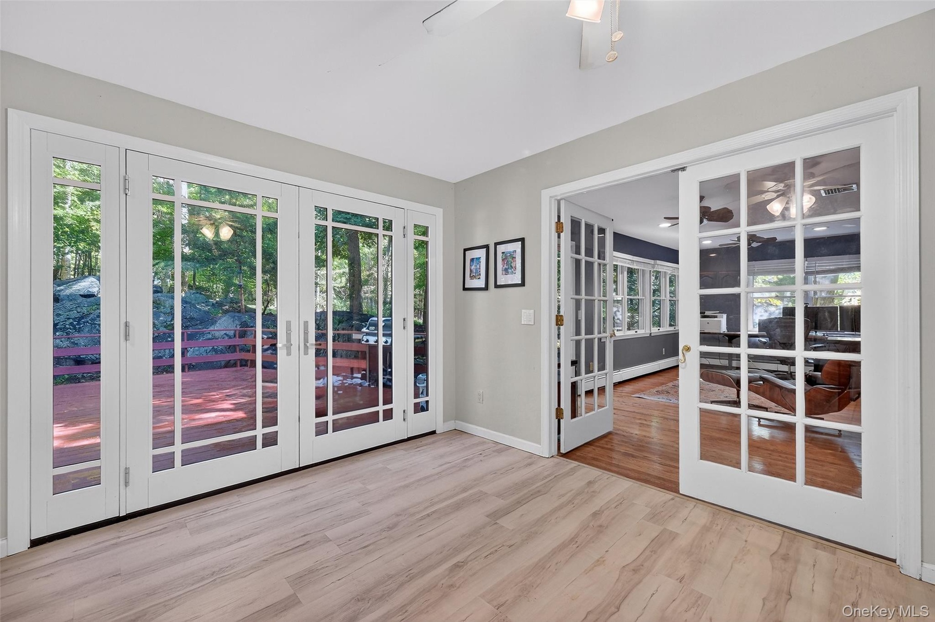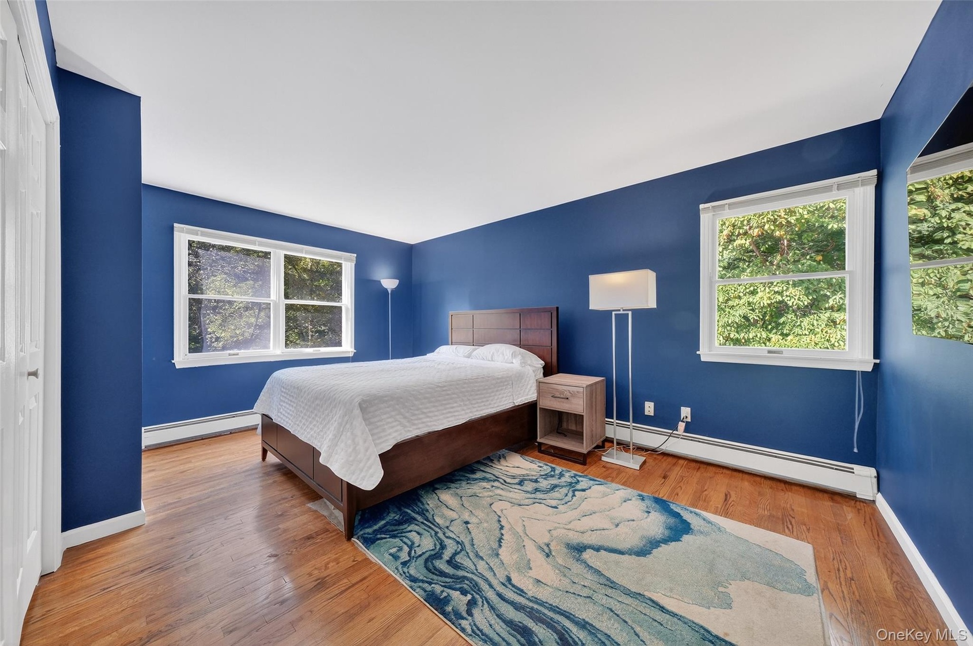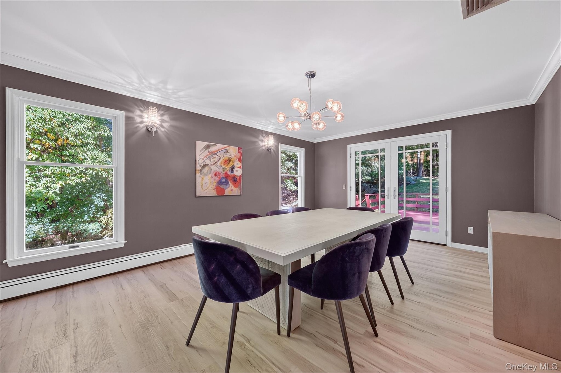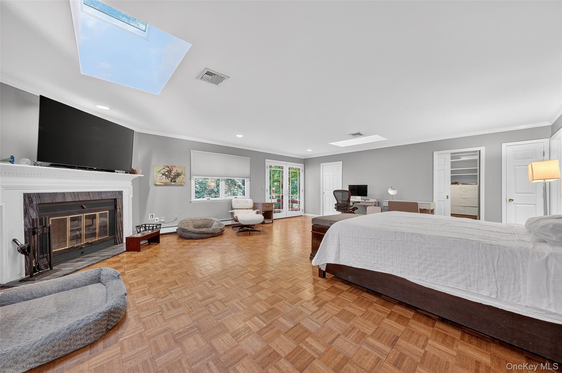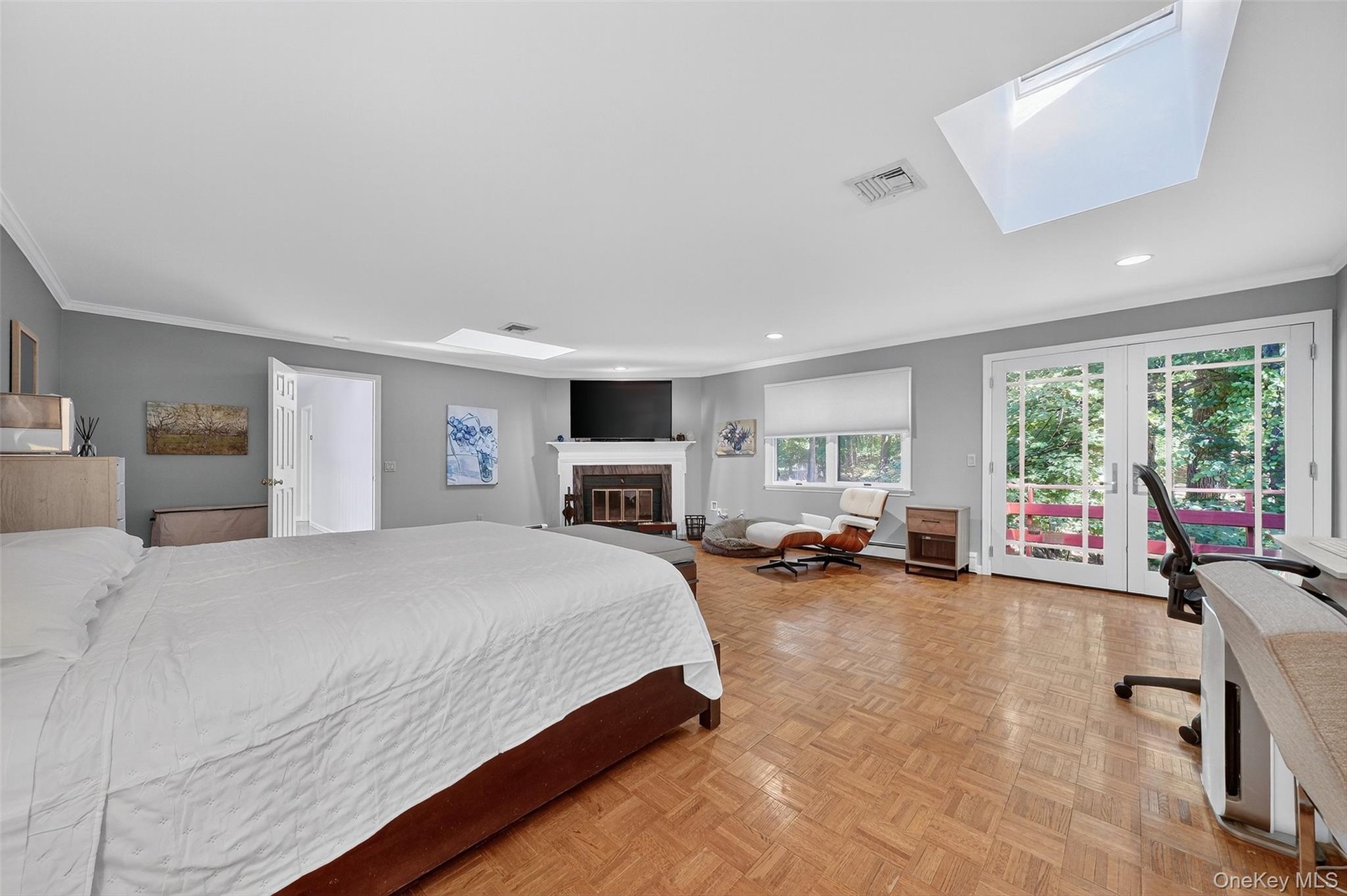 This impressive 3,748 sq. ft. contemporary home is set on 3.2 wooded acres, offering the perfect blend of neighborhood living and total privacy. The main level welcomes you with a spacious entry foyer, family room with skylights, custom windows, and a striking stone wood-burning fireplace. A step-down living room with fireplace and a step-up formal dining room with French doors to an oversized deck provide wonderful flow for entertaining. The expansive kitchen features a gas cooktop island, double Wolf wall ovens, microwave, stainless steel refrigerator, butler’s pantry, and large dining area with French doors to the deck. A private home office with deck access, den, full bath, and laundry complete the main floor. Upstairs, the enormous primary suite boasts a fireplace, skylight, Juliet balcony, two walk-in closets, and a luxurious bath with jetted tub, shower, double sinks, and bidet. Three additional spacious bedrooms share a beautifully updated full bath with custom tile shower. A large open balcony overlooks the entry foyer. Additional features include a full unfinished basement, 2-car garage, fenced yard with 4 access points, new doors, central vacuum, whole-house natural gas generator with automatic switchover, new driveway, and new central air conditioning. Surrounded by mature trees and just 3 miles to Metro-North, this home combines comfort, updates, and convenience in a serene setting. Enjoy year-round activities along the Hudson River, including concerts, the scenic River Walk, golf, hiking, biking, fine dining, shopping, and live theater.