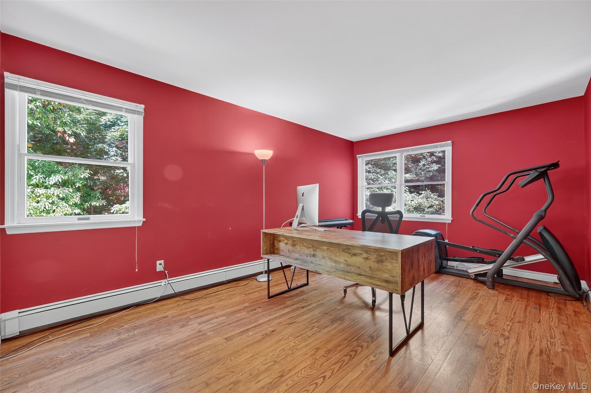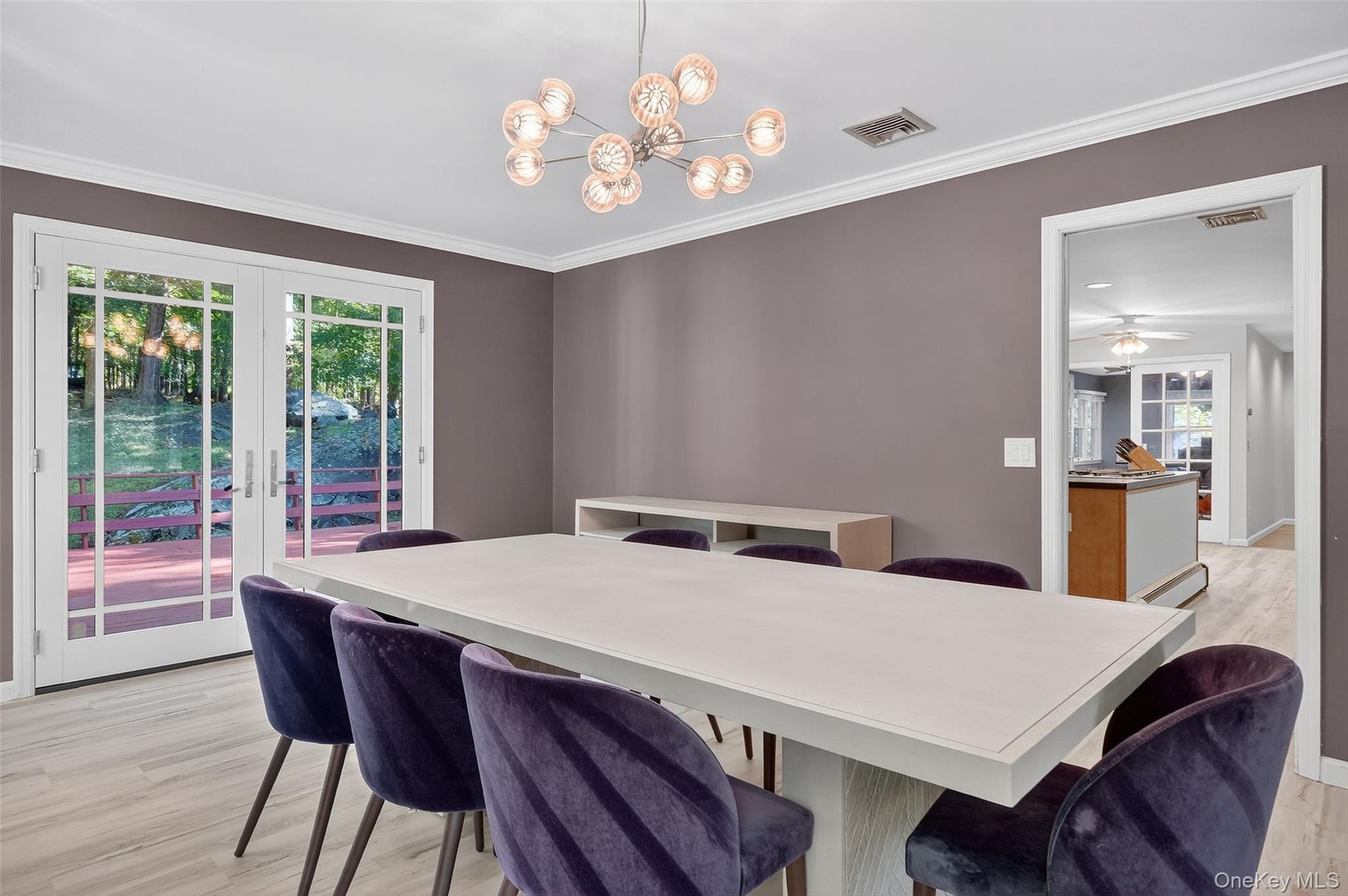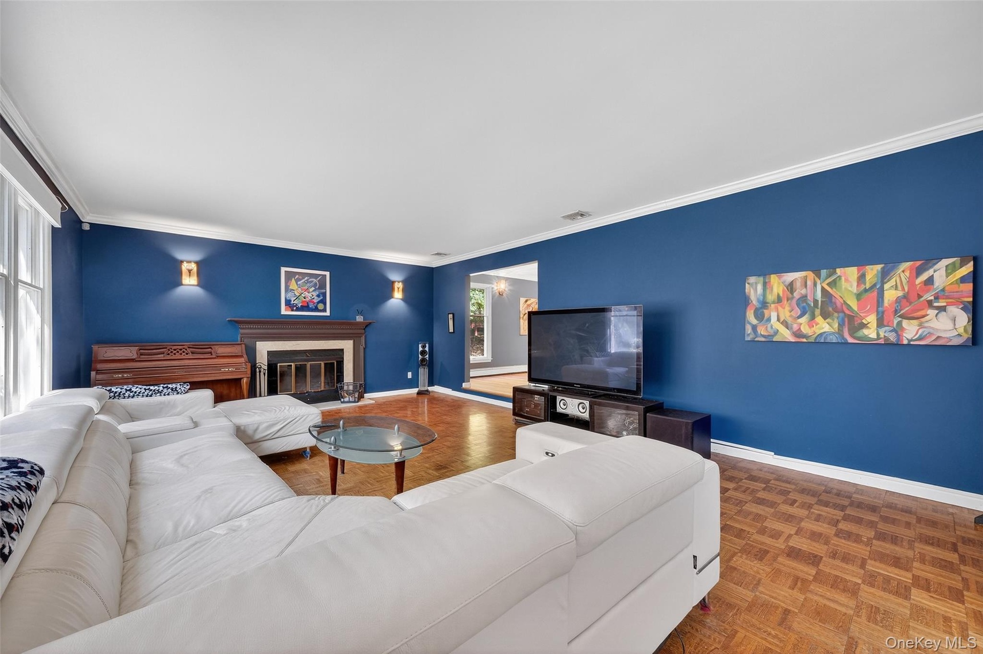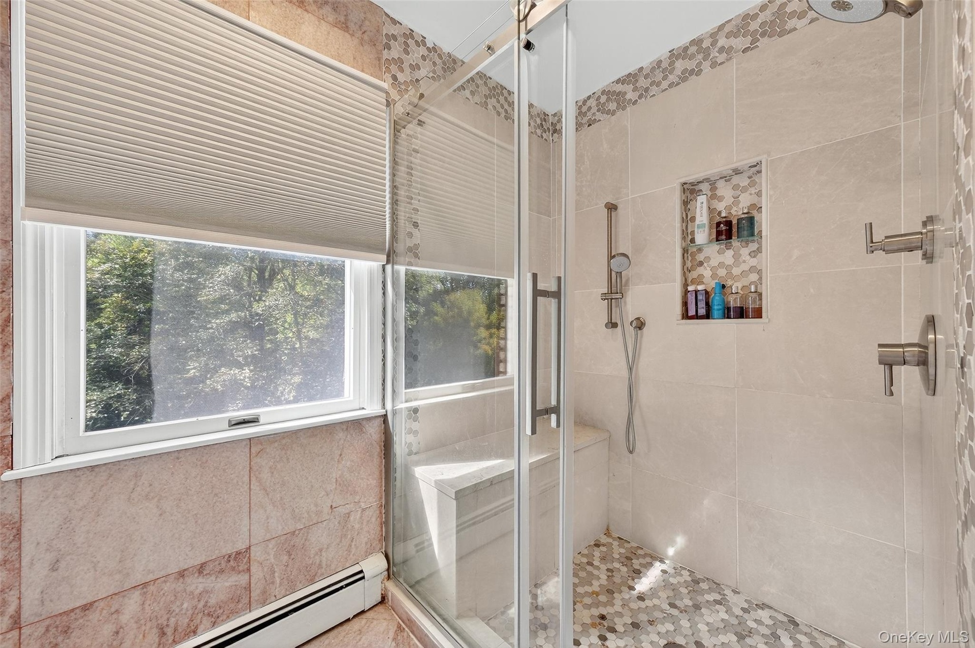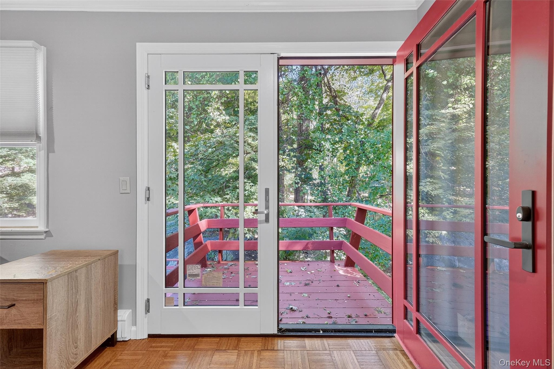 This impressive 3,748 sq. ft. contemporary home is set on 3.2 wooded acres, offering the perfect blend of neighborhood living and total privacy. The main level welcomes you with a spacious entry foyer, family room with skylights, custom windows, and a striking stone wood-burning fireplace. A step-down living room with fireplace and a step-up formal dining room with French doors to an oversized deck provide wonderful flow for entertaining. The expansive kitchen features a gas cooktop island, double Wolf wall ovens, microwave, stainless steel refrigerator, butler’s pantry, and large dining area with French doors to the deck. A private home office with deck access, den, full bath, and laundry complete the main floor. Upstairs, the enormous primary suite boasts a fireplace, skylight, Juliet balcony, two walk-in closets, and a luxurious bath with jetted tub, shower, double sinks, and bidet. Three additional spacious bedrooms share a beautifully updated full bath with custom tile shower. A large open balcony overlooks the entry foyer. Additional features include a full unfinished basement, 2-car garage, fenced yard with 4 access points, new doors, central vacuum, whole-house natural gas generator with automatic switchover, new driveway, and new central air conditioning. Surrounded by mature trees and just 3 miles to Metro-North, this home combines comfort, updates, and convenience in a serene setting. Enjoy year-round activities along the Hudson River, including concerts, the scenic River Walk, golf, hiking, biking, fine dining, shopping, and live theater.