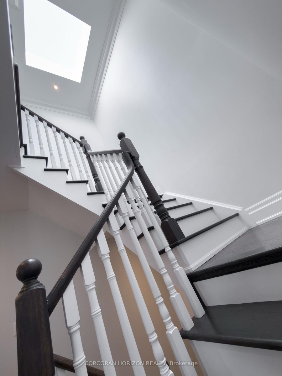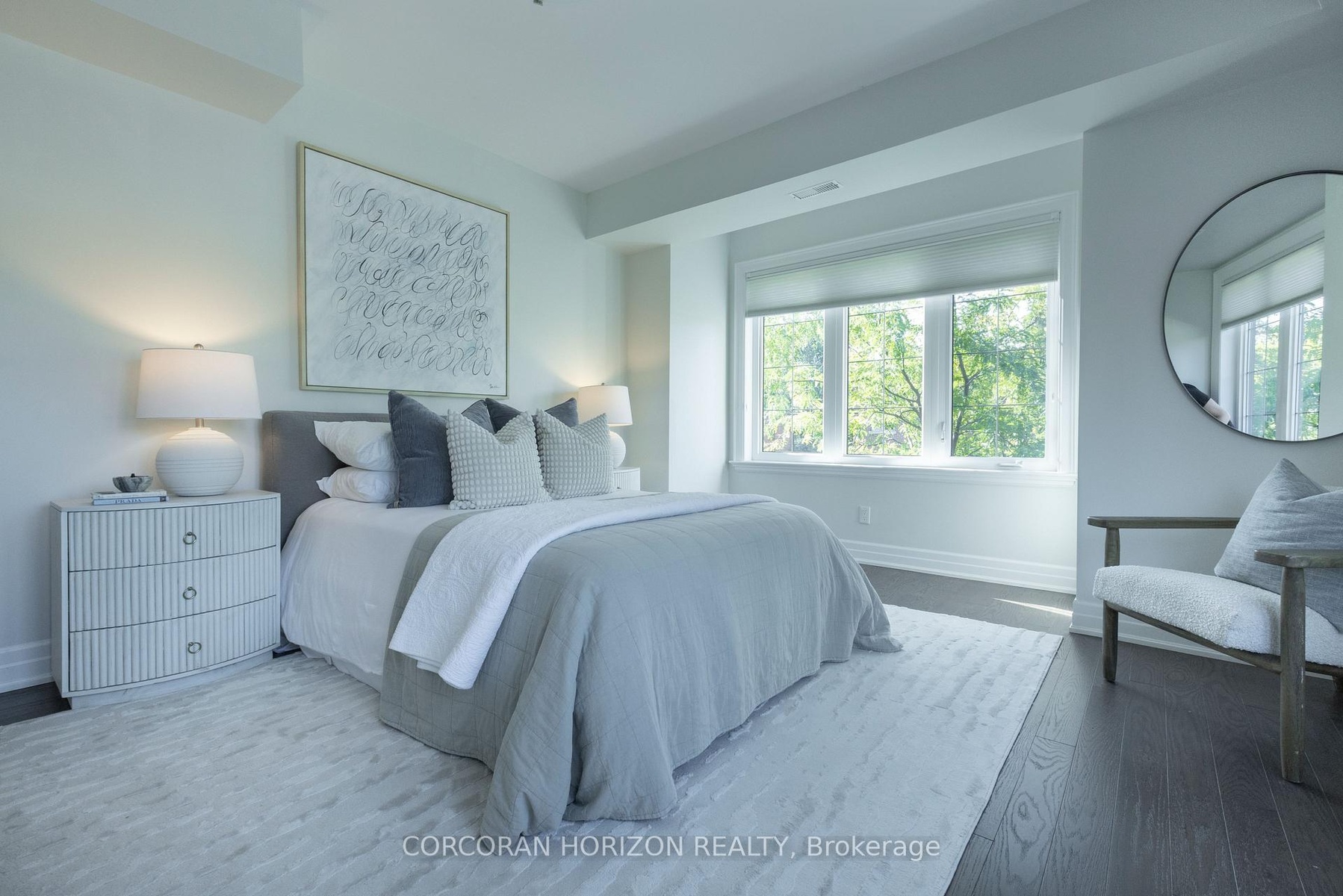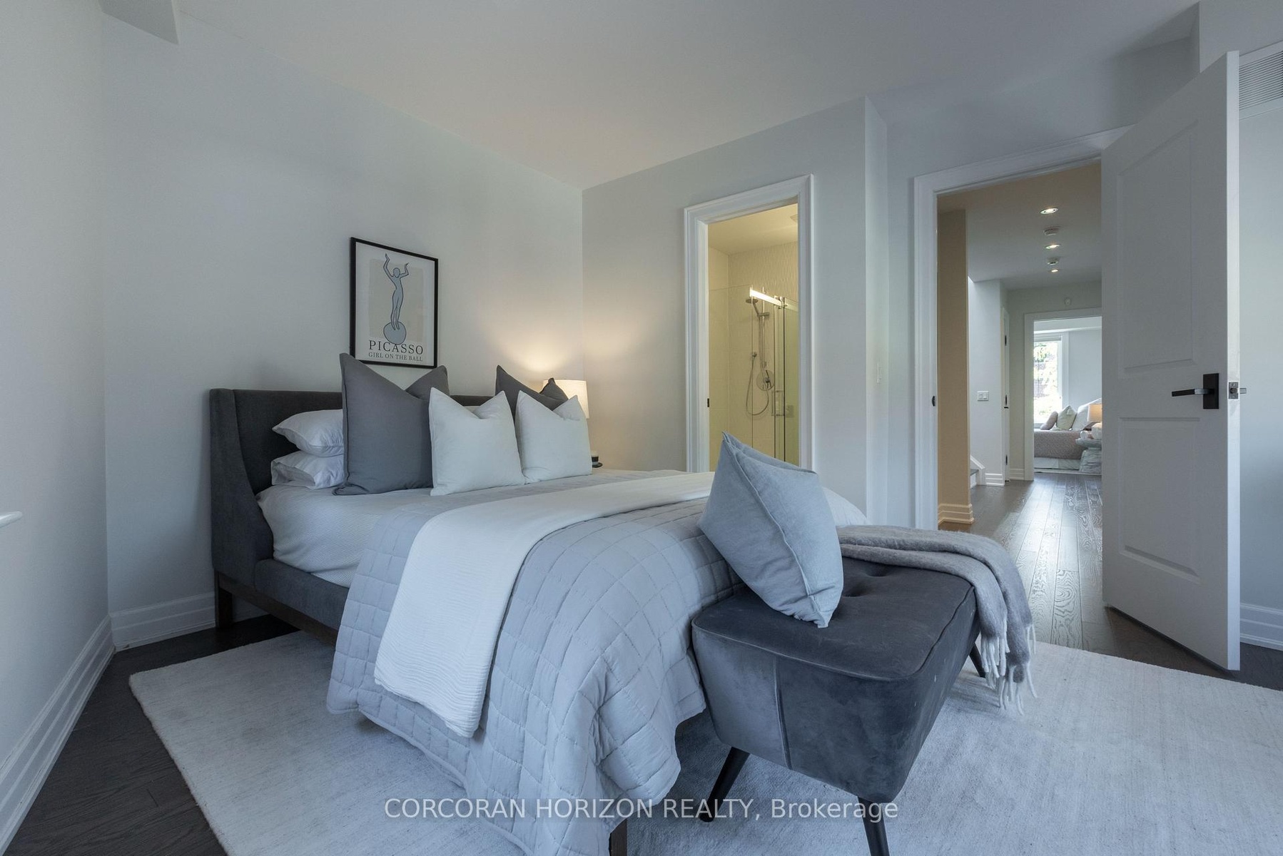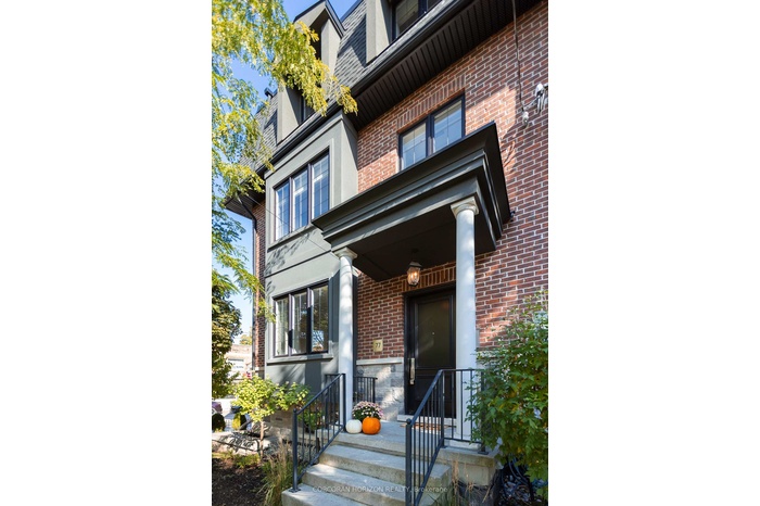 Elegant End-Unit Freehold Townhome in Prime Leaside. Perfectly positioned across from Trace Manes Park, the Leaside Library, and the Community Centre, this stunning end-unit freehold townhome offers over four levels of impeccably designed living in one of Toronto's most coveted neighbourhoods. Steps to the boutiques, cafés, and restaurants of Bayview Avenue, this home combines timeless sophistication with the ease of modern, low-maintenance living-ideal for professionals or families seeking space, style, and convenience. The open-concept main floor is bright, elegant, and exceptionally functional. The chef's kitchen features Thermador stainless steel appliances, a gas range, a massive granite centre island, a Parisian-style banquette for morning coffee or casual dining and French doors opening onto the deck. Thoughtfully designed custom built-ins throughout the kitchen, dining, and living areas offer abundant concealed storage while maintaining a clean, contemporary aesthetic. The marble gas fireplace anchors the main floor in warmth and charm. A chic powder room completes the main level. Upstairs, the second floor features three bright, spacious bedrooms, one with a modern 3-piece ensuite. The large family bath with double marble vanity, a full laundry room and two linen closets round out this level. The third floor is devoted to the luxurious primary suite, with two walk-in closets, a serene den or office, and a spa-inspired ensuite with two marble vanities, a glass shower and freestanding tub. Over 900sf of luxury all to yourself! The finished lower level includes a large recreation room, generous storage areas, and an immaculate 1.5-car garage equipped with a 240V EV charging outlet, built-in bicycle racks, and automatic door. No more maintenance, landscaping & snow-removal included in low monthly fee. Beautifully appointed, intelligently designed, and located in the heart of Leaside, this home truly offers it all!