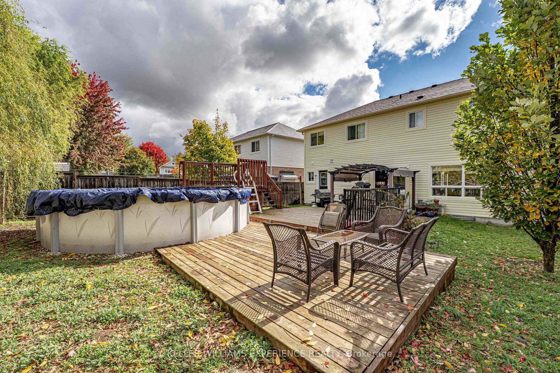 Welcome to this perfect family home offering space, style, and comfort throughout! The main floor features a huge eat-in kitchen with ceramic tile, a large island, and a walkout to the back patio - ideal for family meals and entertaining. The open-concept dining area showcases beautiful hardwood floors and flows seamlessly into a cozy yet bright living room with 9-foot ceilings. Convenient inside entry from the double-car garage adds everyday practicality. Upstairs, you'll find four massive bedrooms, including a spacious primary suite complete with a full ensuite featuring a relaxing soaker tub and separate corner shower. The upper-level laundry adds extra convenience for busy family life. The finished basement provides even more living space with both a family room and a recreation area, plus plenty of storage. Outside, enjoy the large fenced yard with an above-ground pool - perfect for summer fun! Located within walking distance to parks, trails, and a school bus stop, and just a short drive to all amenities, Base Borden, Alliston, and Barrie this home truly has it all.