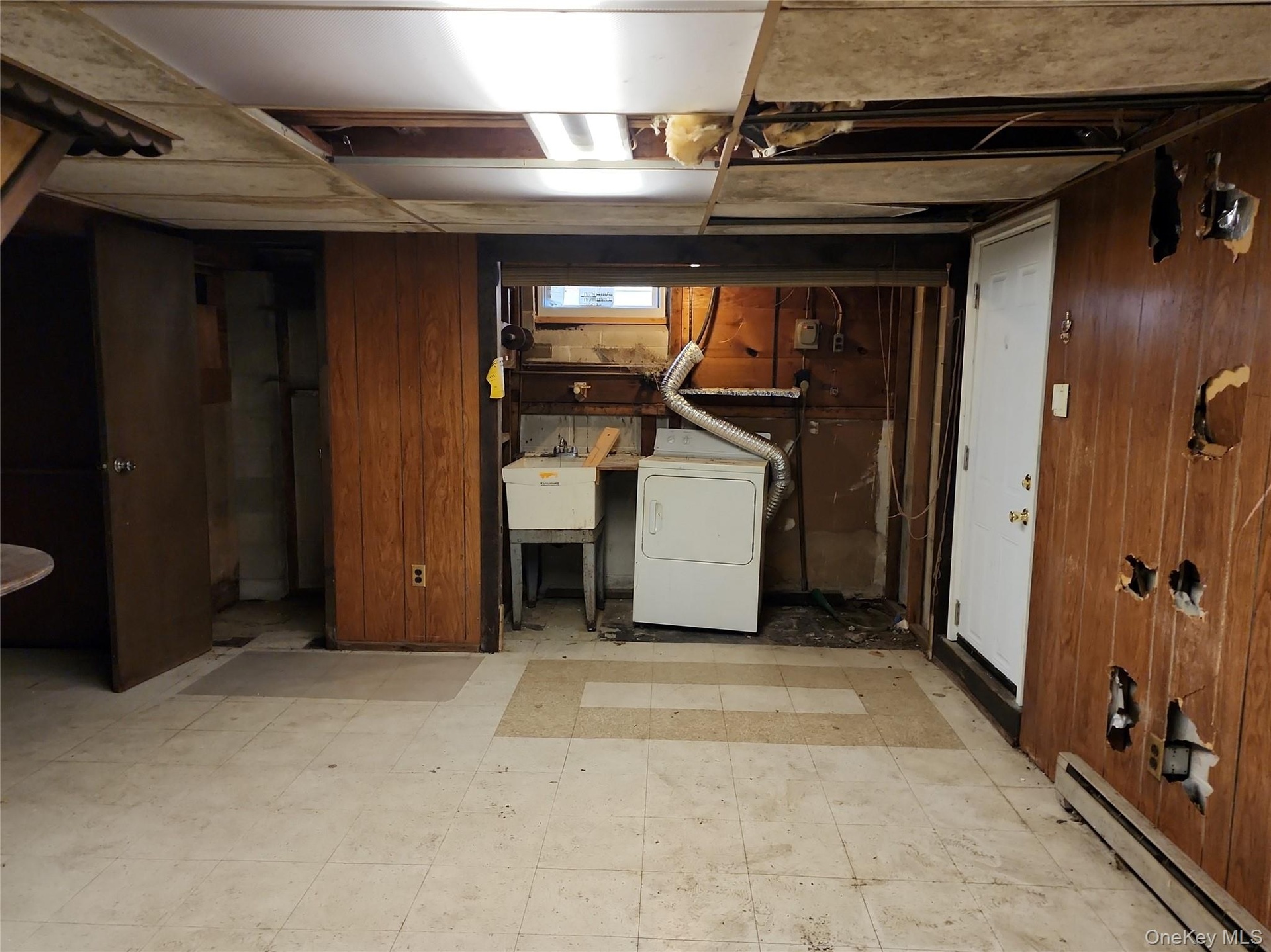 - Below grade area with a baseboard heating unit, light flooring, wood walls, and washer / clothes dryer