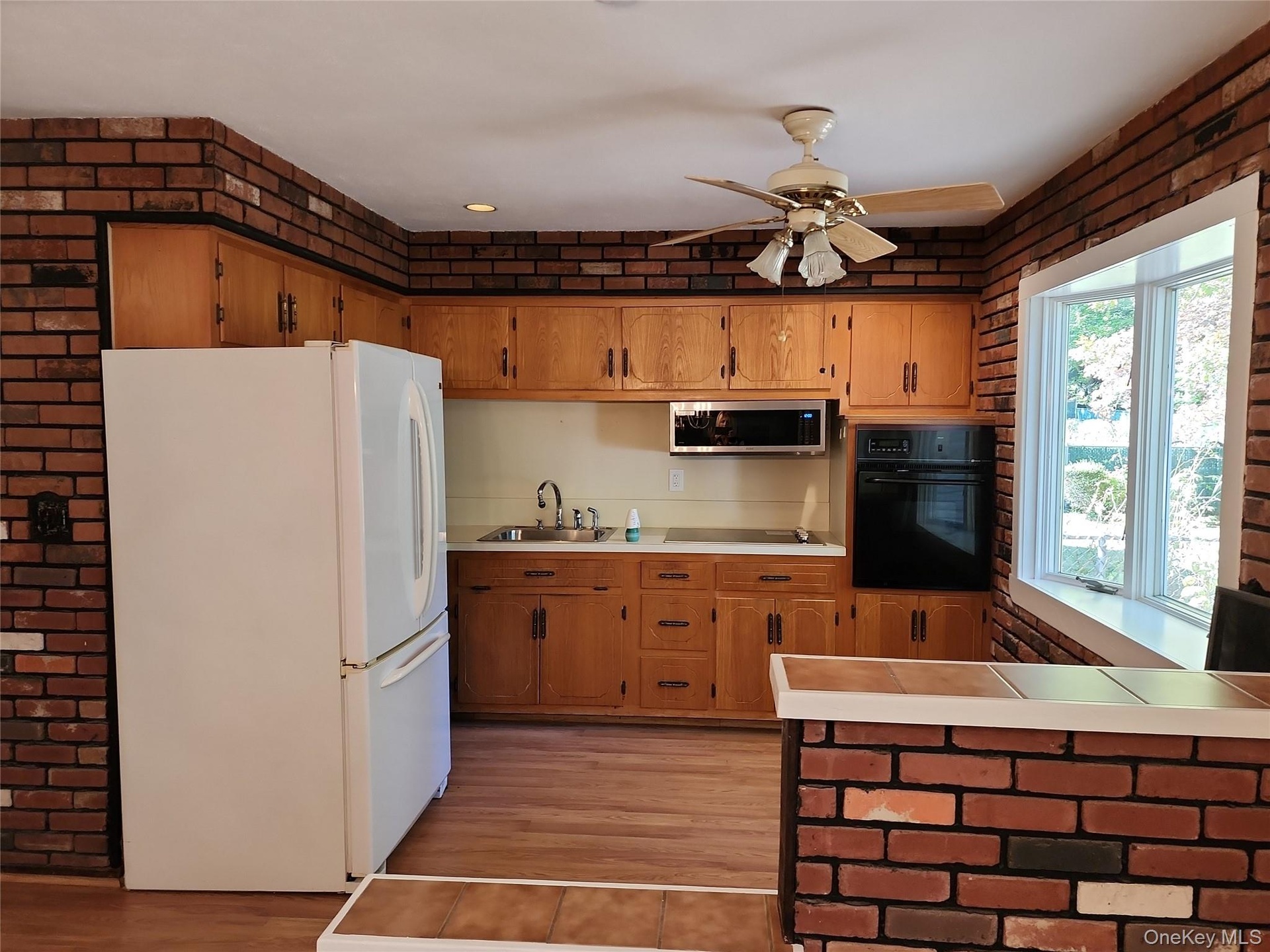- Kitchen with brick wall, black appliances, tile countertops, brown cabinetry, and light wood-type flooring