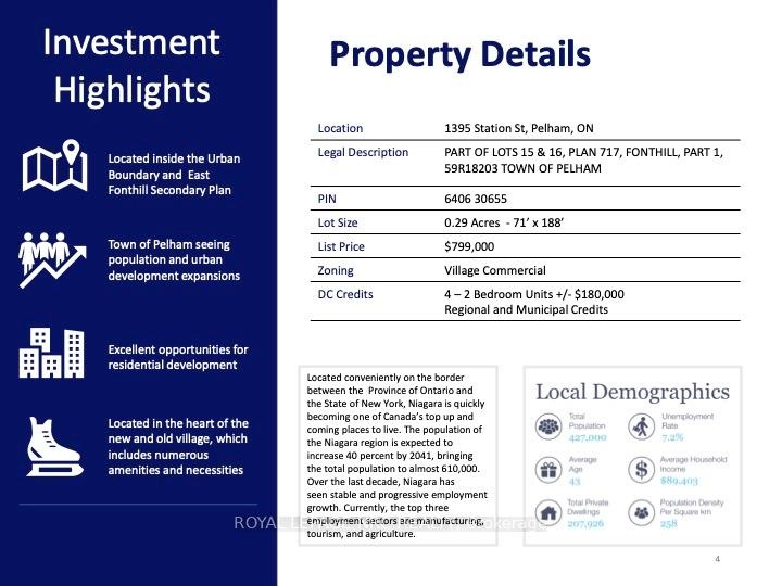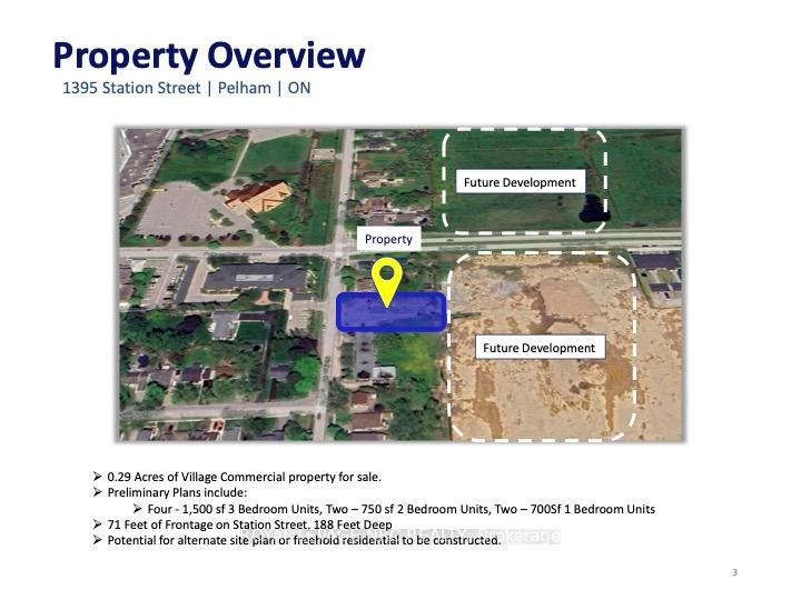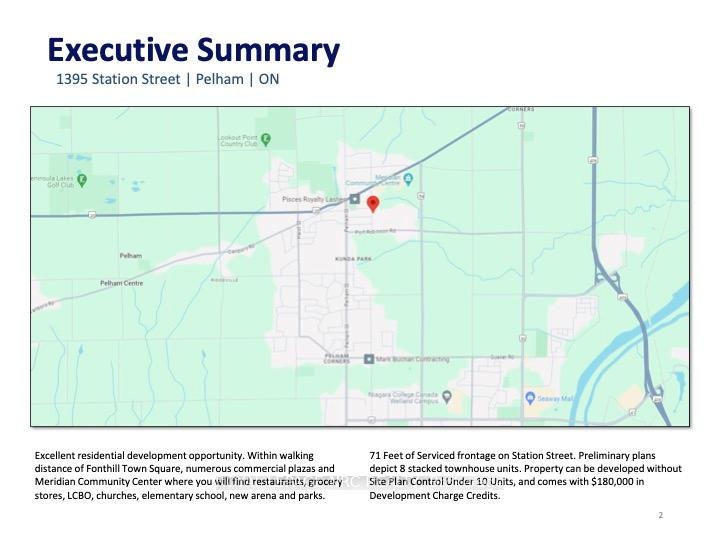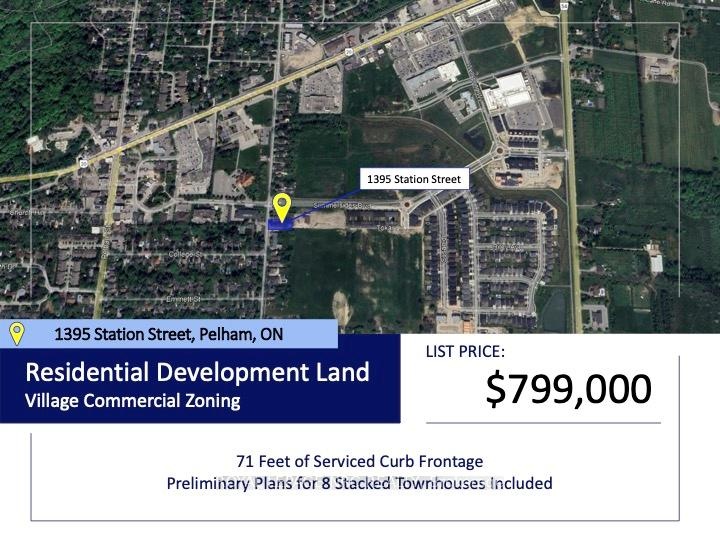 Excellent small-scale development opportunity in the heart of Fonthill. This 0.29-acre property offers 71' of serviced frontage and includes $180,000 in development charge credits. With fewer than 10 units, the site can proceed without site plan control, offering a streamlined approval process for builders and developers. Preliminary concept plans show 8 stacked townhouse units, with potential for alternate layouts or freehold residential development. Zoned Village Commercial, the property allows for a wide variety of permitted uses, including: apartment dwellings, townhouses, bakery, restaurant, retail, offices, hotel, microbrewery, cultural use, live-work units, and short-term accommodation, among others. Ideally located within walking distance to Fonthill Town Square, shopping plazas, restaurants, grocery stores, LCBO, schools, churches, parks, and the Meridian Community Centre with its new arena and recreation facilities.