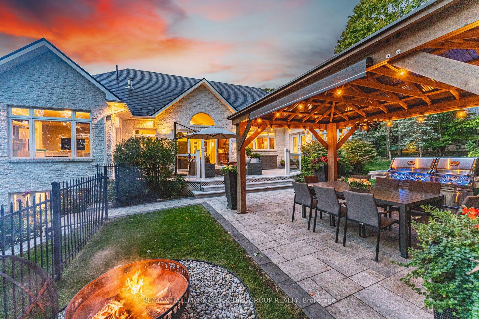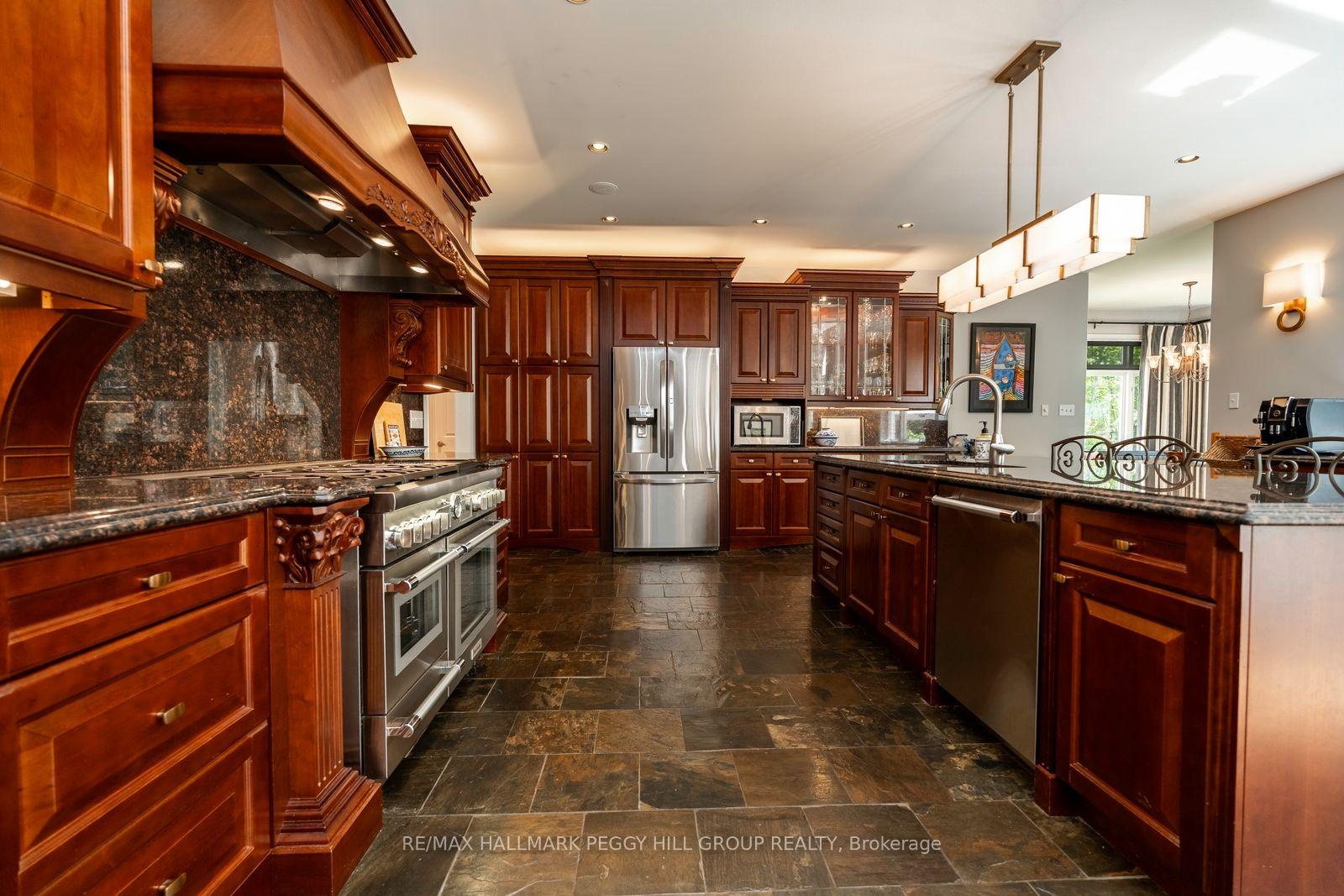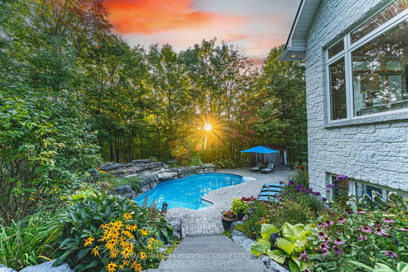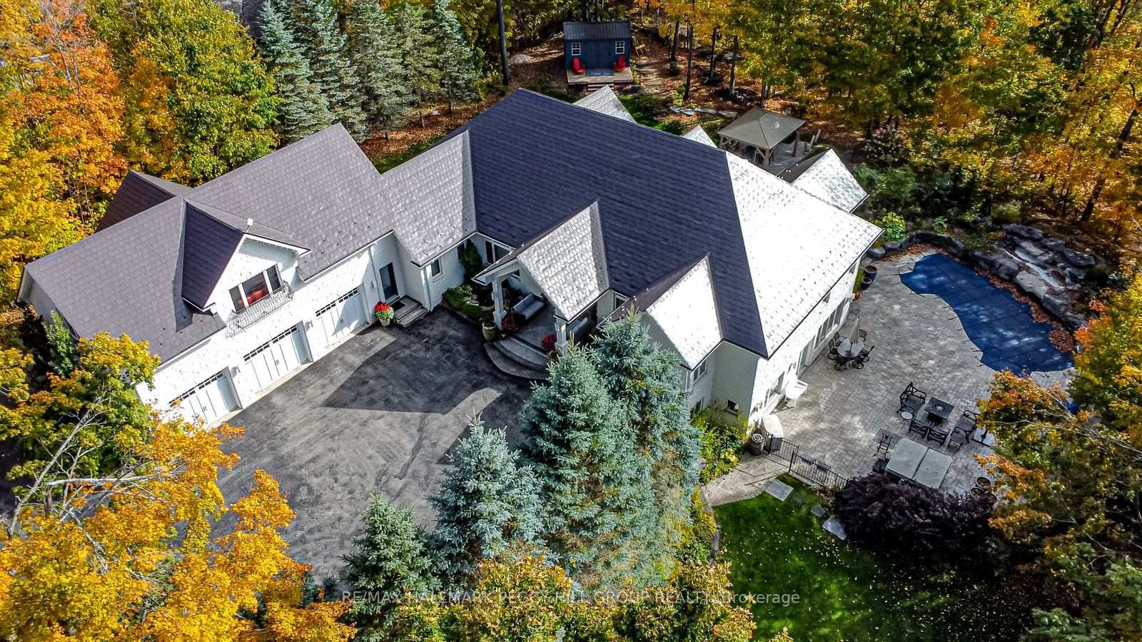 8,000 + SQ FT ESTATE ON 1.33 ACRES WITH RESORT STYLE BACKYARD, POOL, HOT TUB, TRIPLE CAR GARAGE & ADDITIONAL LIVING QUARTERS! Situated in one of Oro-Medonte's most prestigious enclaves, this bungalow offers over 8,000 sq ft on 1.33 acres of landscaped grounds with a stately stone exterior. A long driveway provides parking for 16, complemented by a heated 3-car garage with a lift for 4 car capacity and an EV charger. Soaring ceilings, refined craftsmanship and designer finishes define the home. The chef's kitchen impresses with solid wood cabinetry, a massive island, premium appliances, including a $24k Thermador range, while a breakfast nook captures serene forest views. A dining room with a custom-built-in cabinet is perfect for entertaining, and the living room features a stone fireplace and walkout. The primary offers 2 walk-in closets, a walkout to the pool and an ensuite with heated floors, soaker tub, and glass-walled shower. 2 additional bedrooms share a 4-piece bath, with a powder room, laundry and mudroom completing the level. The walkout basement boasts 3 additional bedrooms, including one with a semi-ensuite 4-piece bath, a 2-piece bath, a spacious den/craft room, and a rec room featuring a double-sided fireplace, wet bar, pool table, and games area, and a walkout to the backyard. Above the garage, a private living area with a separate entrance includes a kitchen, living and dining space, bedroom, laundry hookups, and independent heating/cooling. The backyard presents an inground saltwater pool with a waterfall, hot tub, pool house, gazebo, patio, and an 8-zone irrigation system. Upgrades include an aluminum roof (2018), 2 furnaces and 2 A/C units (2022), a generator (2022), Phantom Screens, powered window coverings, a Sonos sound system, wired security, high-end lighting, a striking glass and hardwood staircase and a 9' x 14' sliding glass wall. Minutes to golf, skiing and Lake Simcoe, less than 15 minutes to Barrie and approx. 1 hour to Pearson Airport.