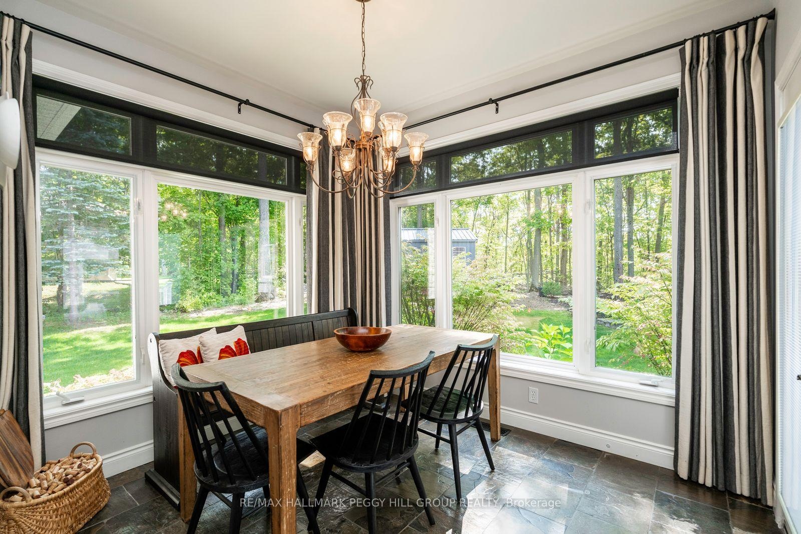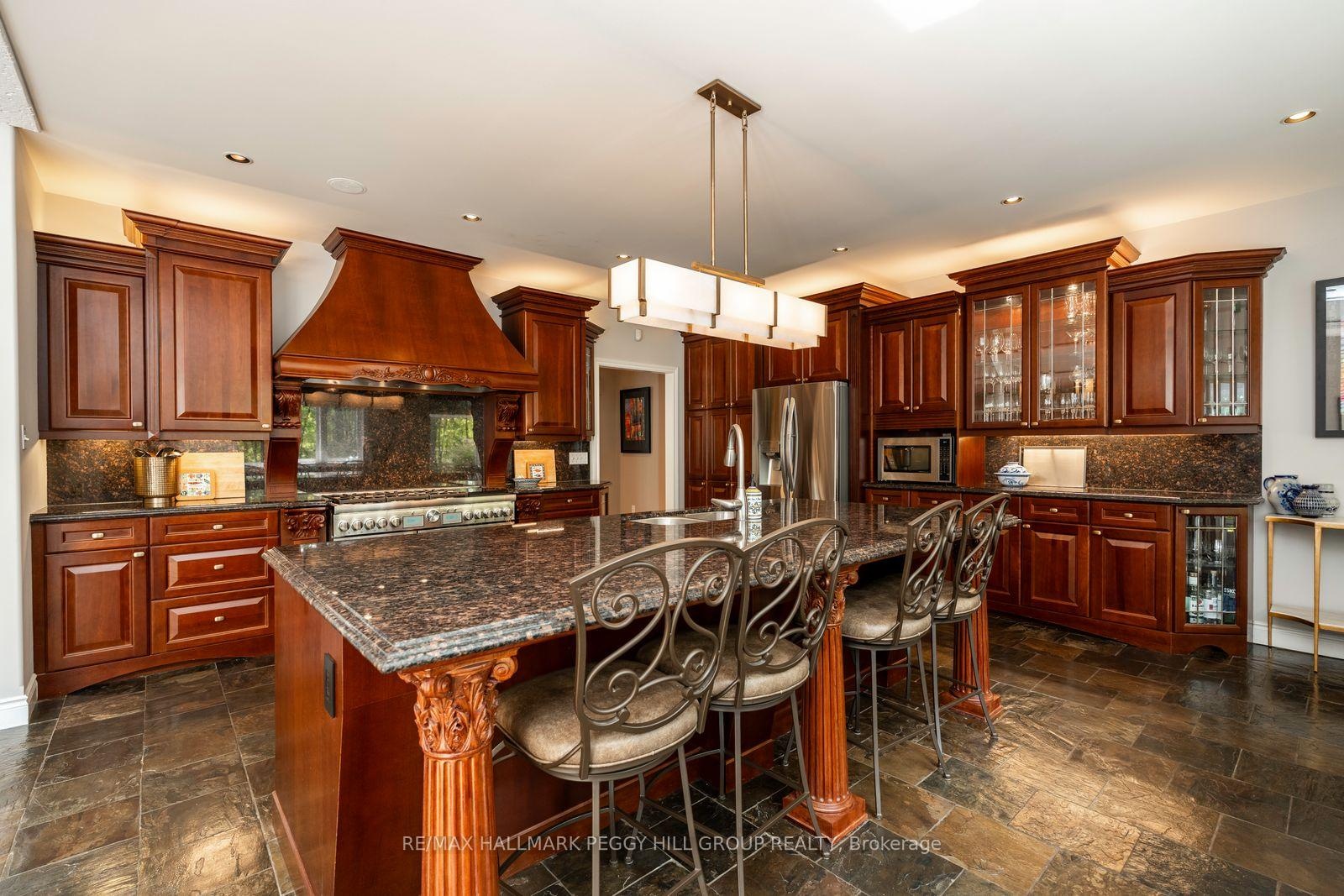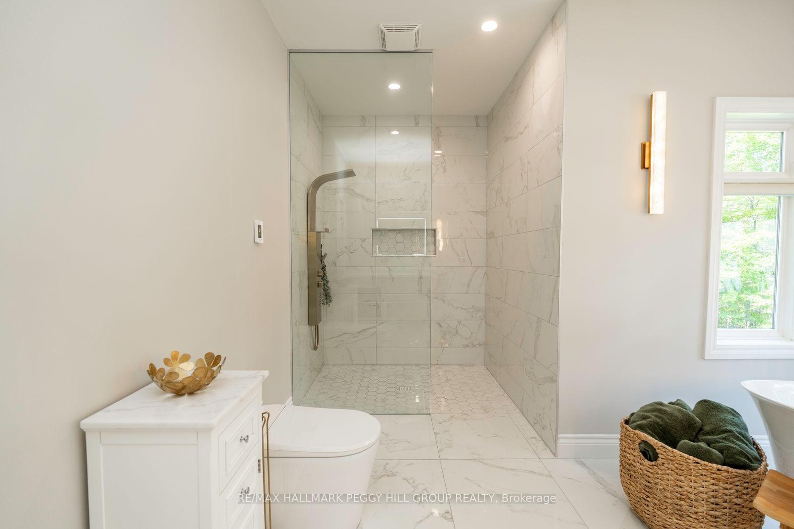 8,000 + SQ FT ESTATE ON 1.33 ACRES WITH RESORT STYLE BACKYARD, POOL, HOT TUB, TRIPLE CAR GARAGE & ADDITIONAL LIVING QUARTERS! Situated in one of Oro-Medonte's most prestigious enclaves, this bungalow offers over 8,000 sq ft on 1.33 acres of landscaped grounds with a stately stone exterior. A long driveway provides parking for 16, complemented by a heated 3-car garage with a lift for 4 car capacity and an EV charger. Soaring ceilings, refined craftsmanship and designer finishes define the home. The chef's kitchen impresses with solid wood cabinetry, a massive island, premium appliances, including a $24k Thermador range, while a breakfast nook captures serene forest views. A dining room with a custom-built-in cabinet is perfect for entertaining, and the living room features a stone fireplace and walkout. The primary offers 2 walk-in closets, a walkout to the pool and an ensuite with heated floors, soaker tub, and glass-walled shower. 2 additional bedrooms share a 4-piece bath, with a powder room, laundry and mudroom completing the level. The walkout basement boasts 3 additional bedrooms, including one with a semi-ensuite 4-piece bath, a 2-piece bath, a spacious den/craft room, and a rec room featuring a double-sided fireplace, wet bar, pool table, and games area, and a walkout to the backyard. Above the garage, a private living area with a separate entrance includes a kitchen, living and dining space, bedroom, laundry hookups, and independent heating/cooling. The backyard presents an inground saltwater pool with a waterfall, hot tub, pool house, gazebo, patio, and an 8-zone irrigation system. Upgrades include an aluminum roof (2018), 2 furnaces and 2 A/C units (2022), a generator (2022), Phantom Screens, powered window coverings, a Sonos sound system, wired security, high-end lighting, a striking glass and hardwood staircase and a 9' x 14' sliding glass wall. Minutes to golf, skiing and Lake Simcoe, less than 15 minutes to Barrie and approx. 1 hour to Pearson Airport.