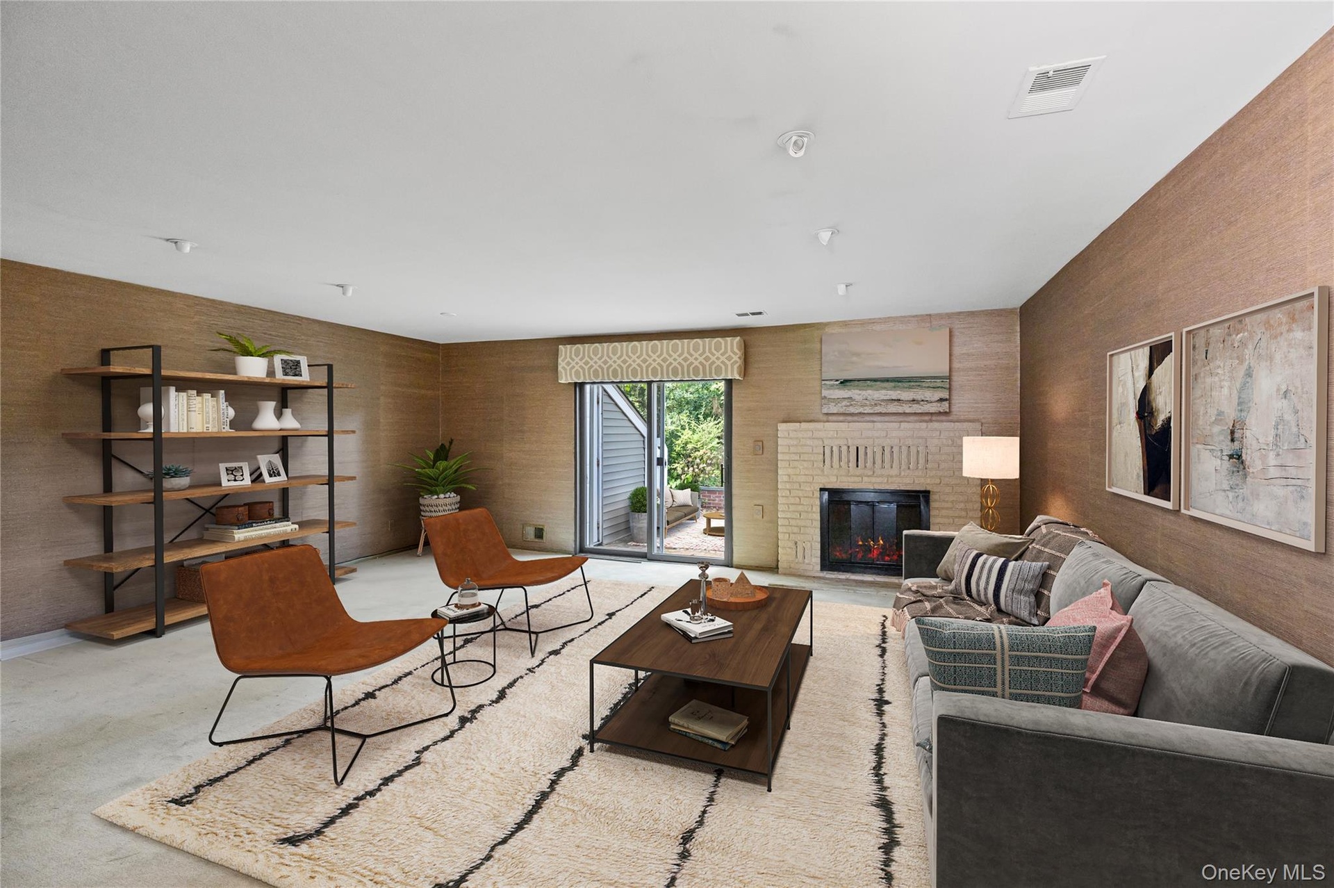 - Unfurnished living room featuring a brick fireplace and carpet flooring