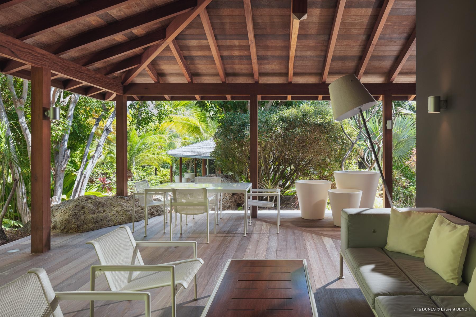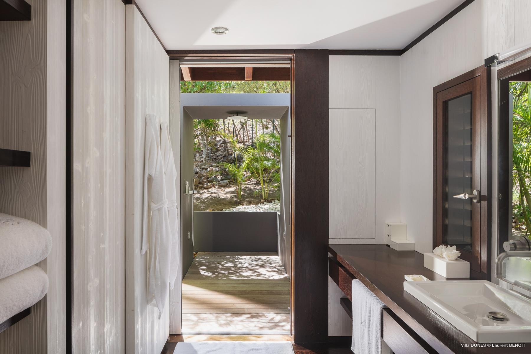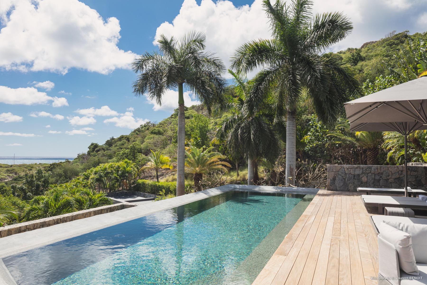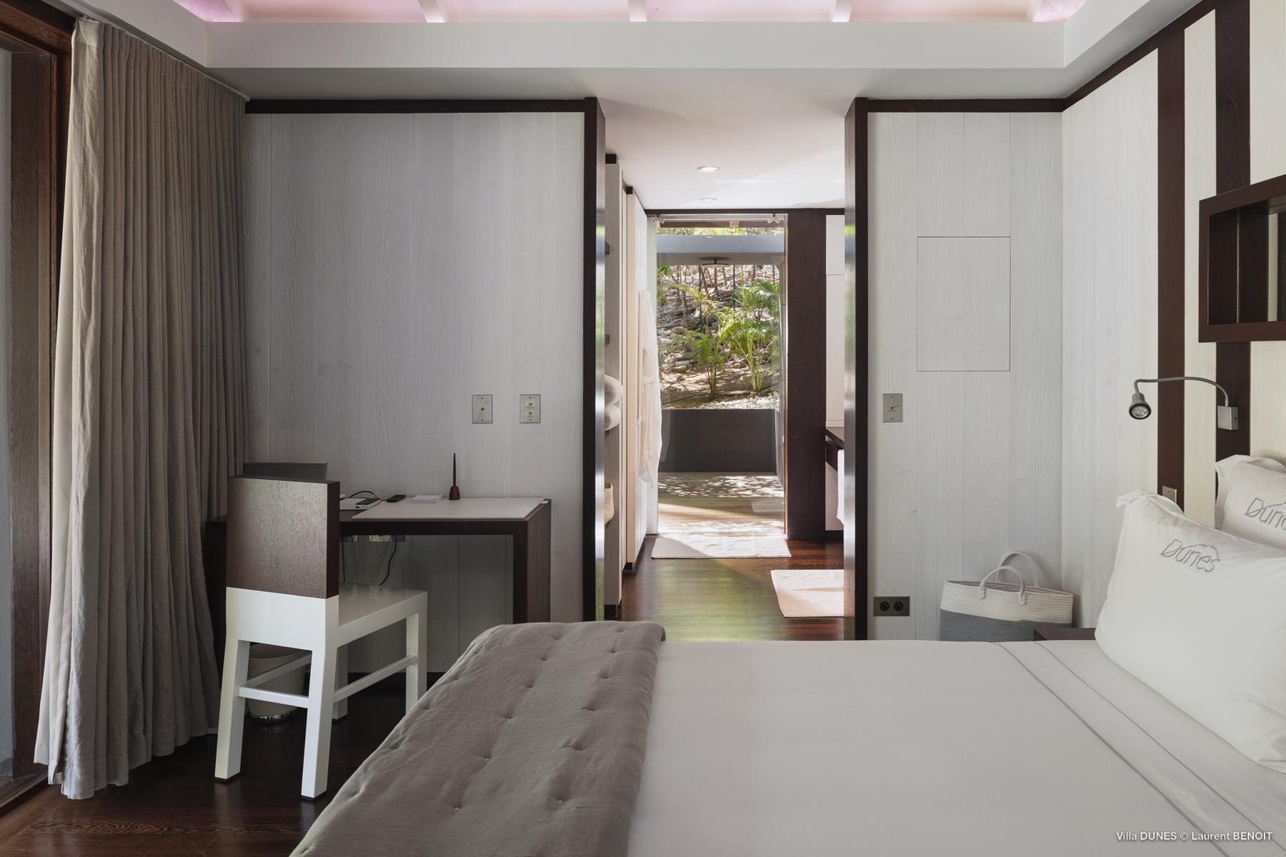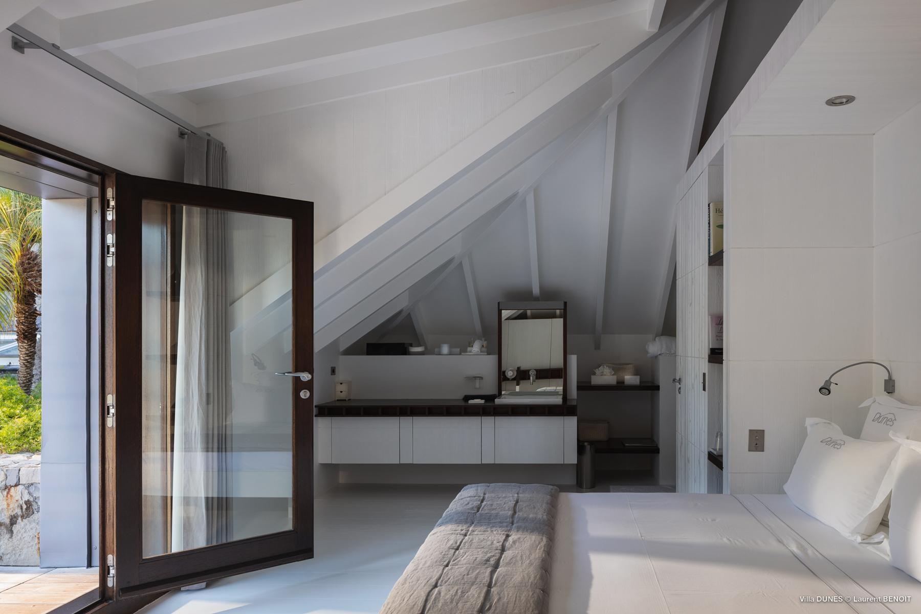 On the first floor, you will find another large bedroom overlooking Saline bay and on each side of it, two other bedrooms opened onto the lush tropical garden.