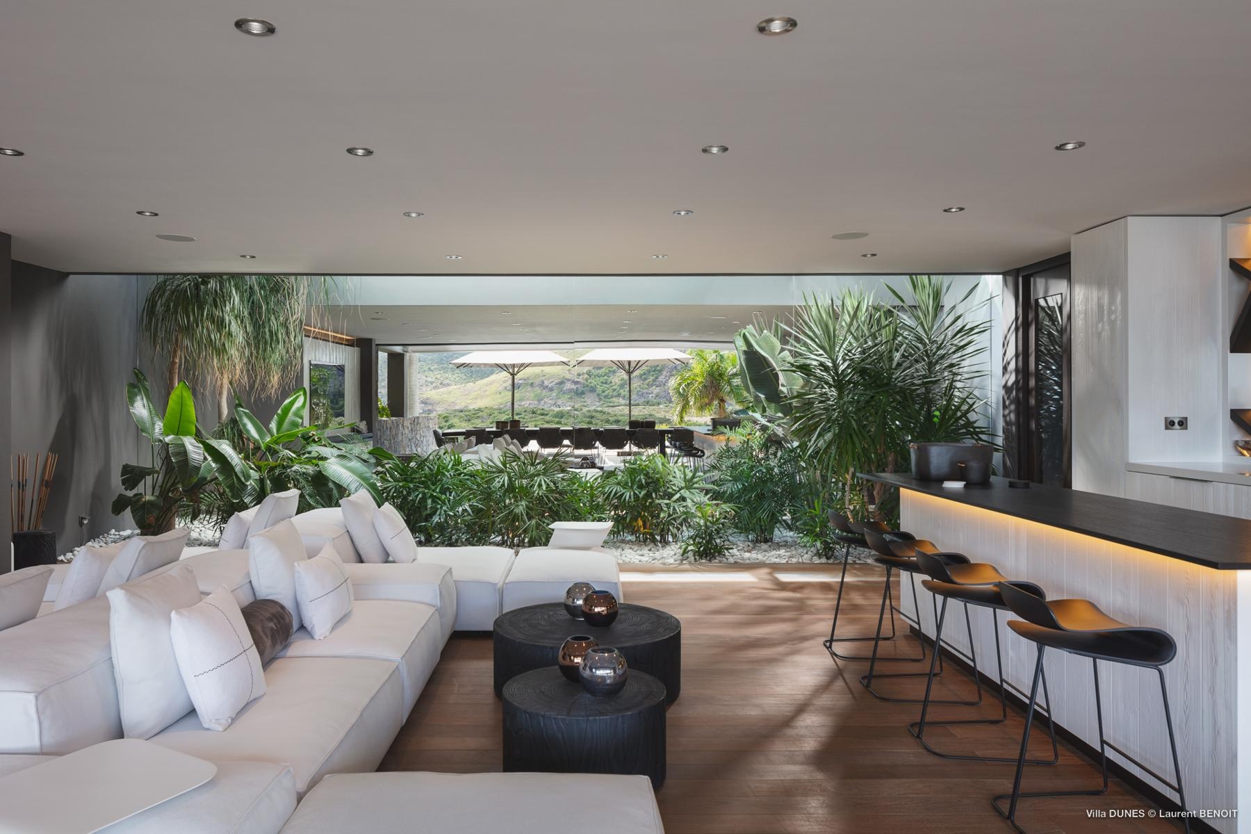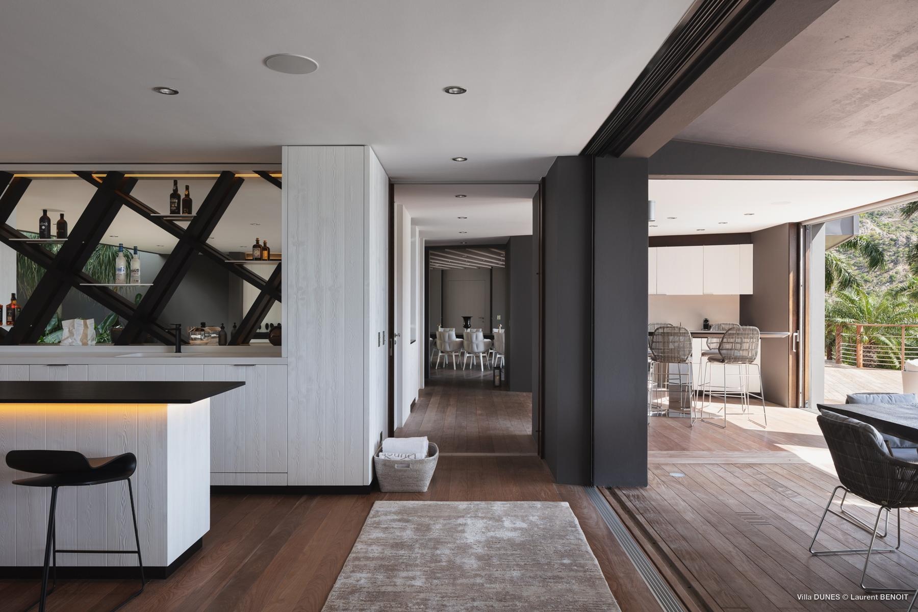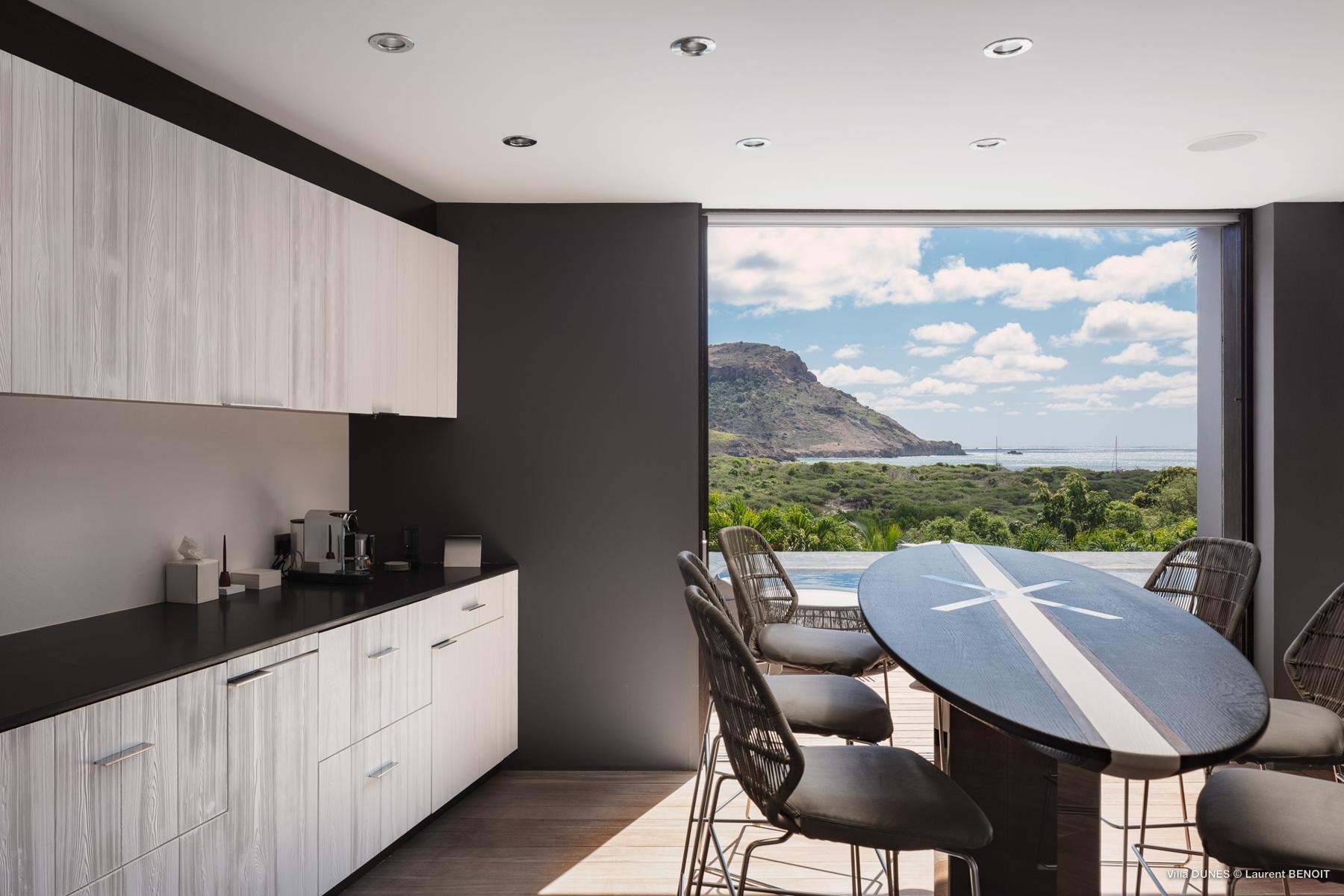 On the pool level, you will find the master bedroom overlooking the sea, a large living opened onto a spacious deck, a dining room opened on both side of the garden and the terrace with the view. There are two kitchens, one opened onto the living and terrace and the other one with the air-conditioning, perfect for a chef.