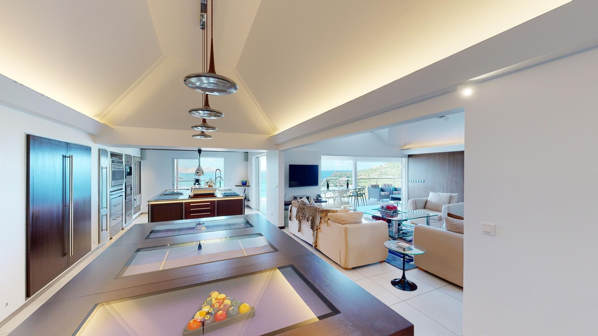 Pass a little bridge over a fountain with water lily and enter in a full air conditioned roomy living room, with large sofas, a billiard table, a fantastic gourmet kitchen perfect for a "chef at the villa" and a spacious outside covered terrace with extra sofas.
