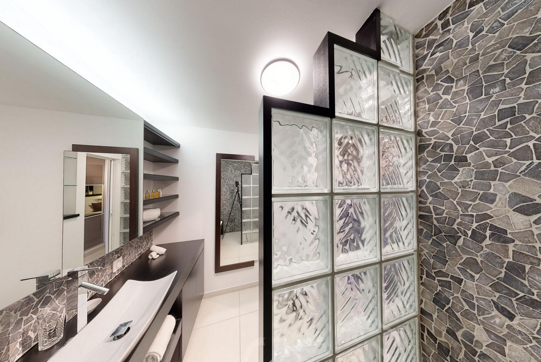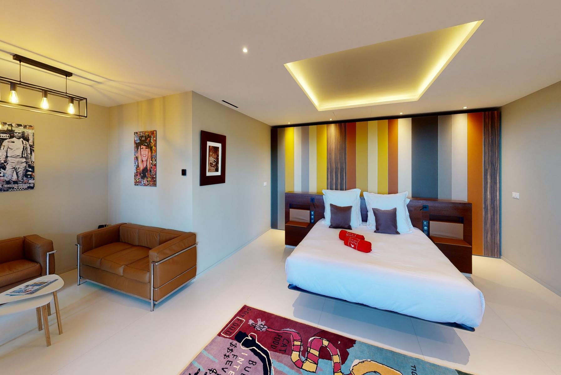 On the pool floor you will find a bar, a fitness room with a massage table, a bedroom with ensuite bathroom and a bungalow with its own small kitchen and living room.