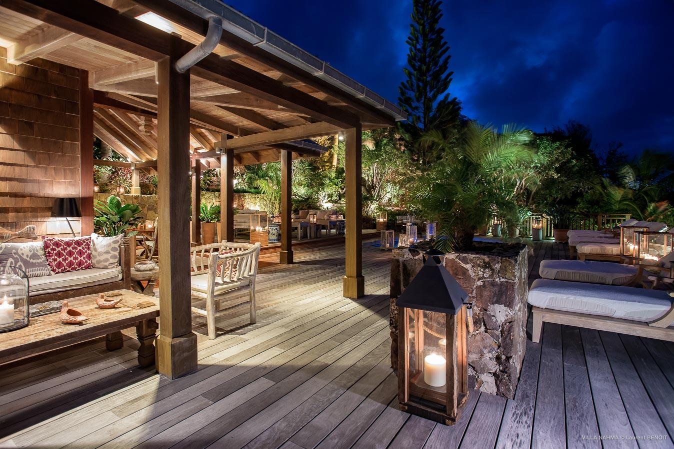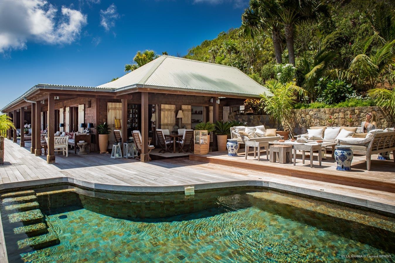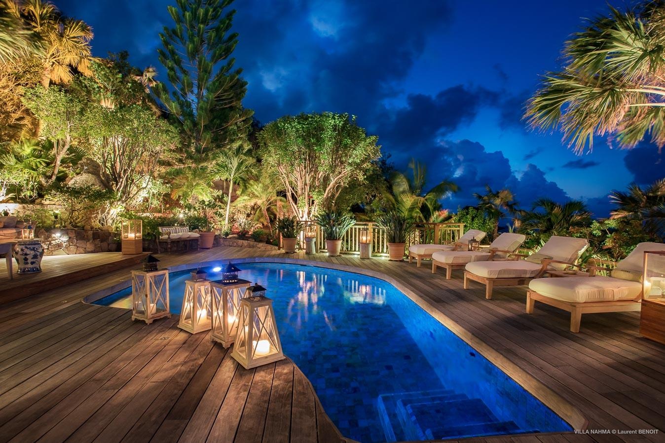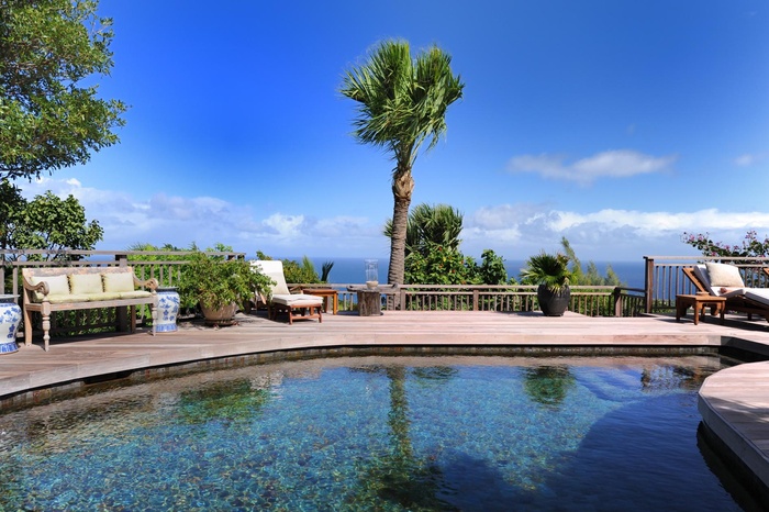 The heated lava stone pool is at the end of the long deck overlooking the sea.