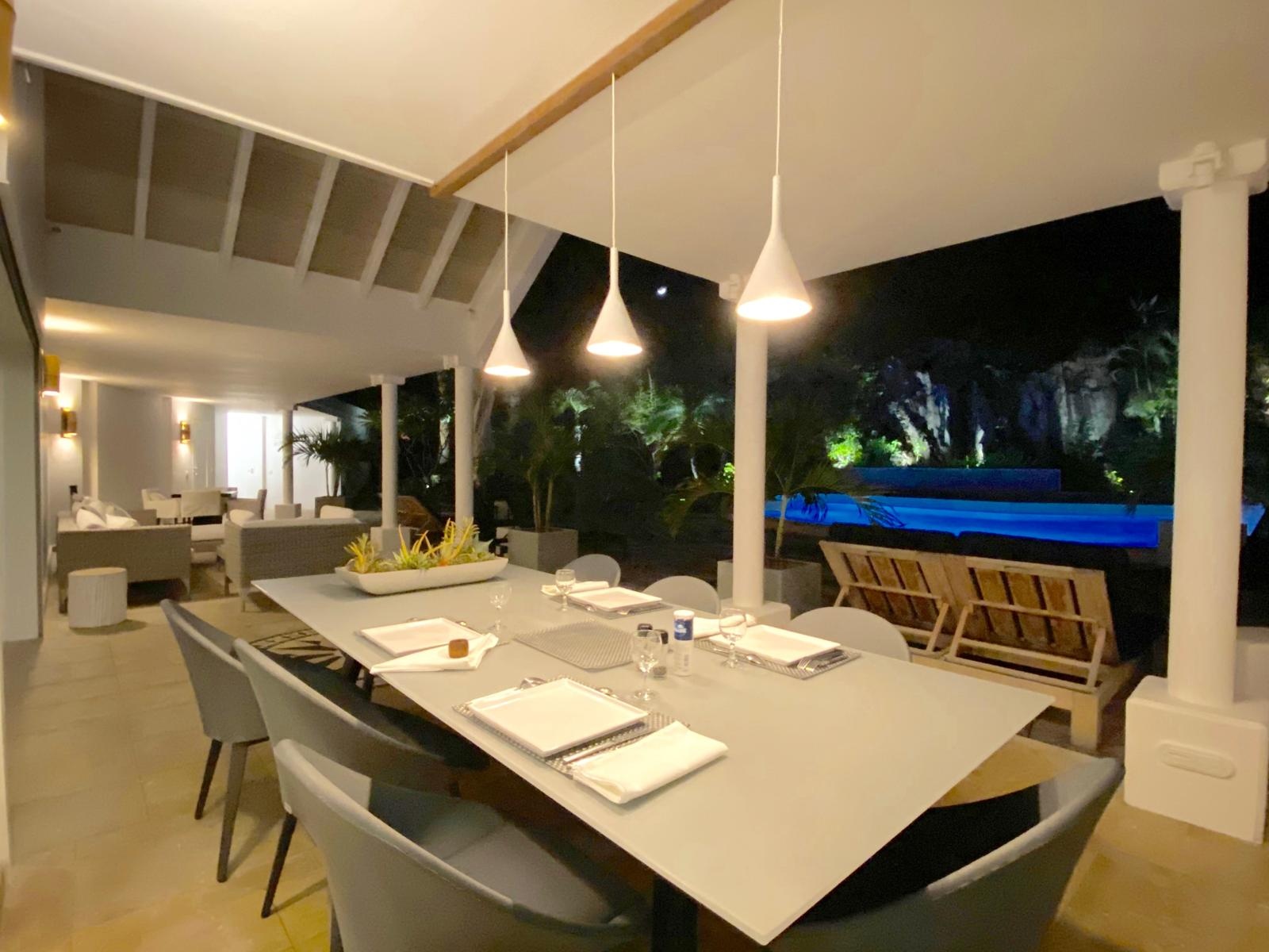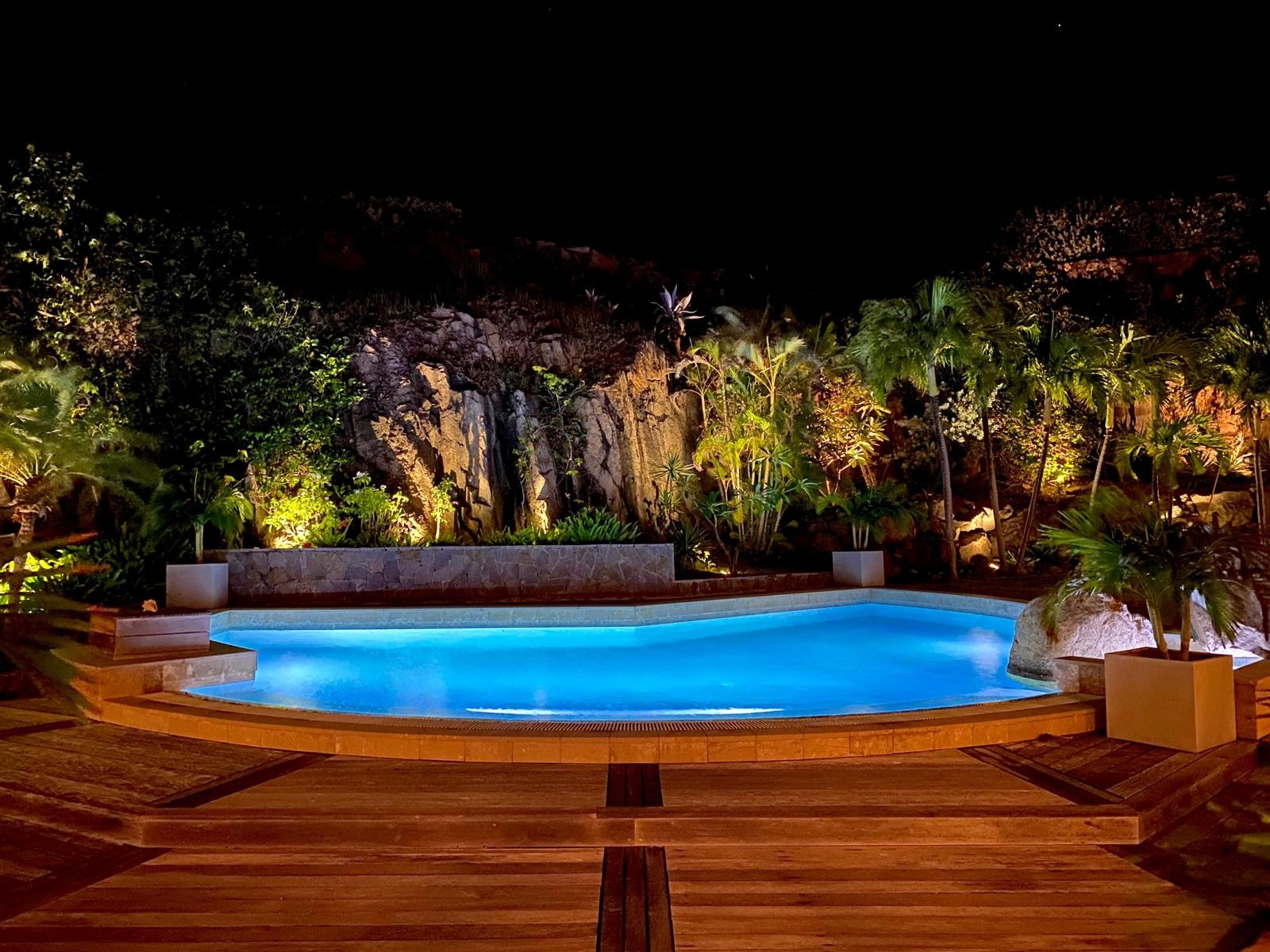 The lush tropical garden with its bright colours is magnificent. At night, it lights up and the magic occurs.