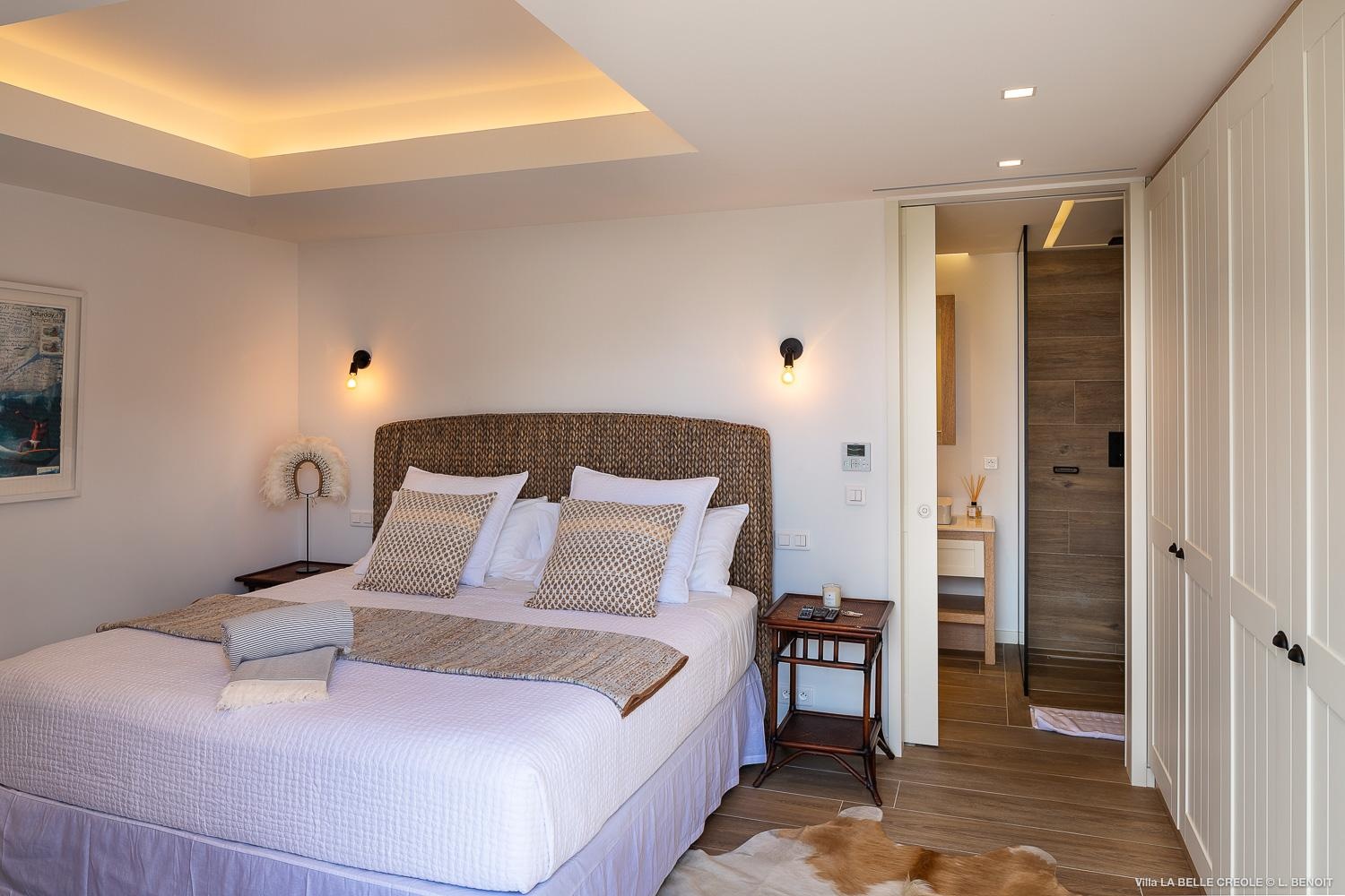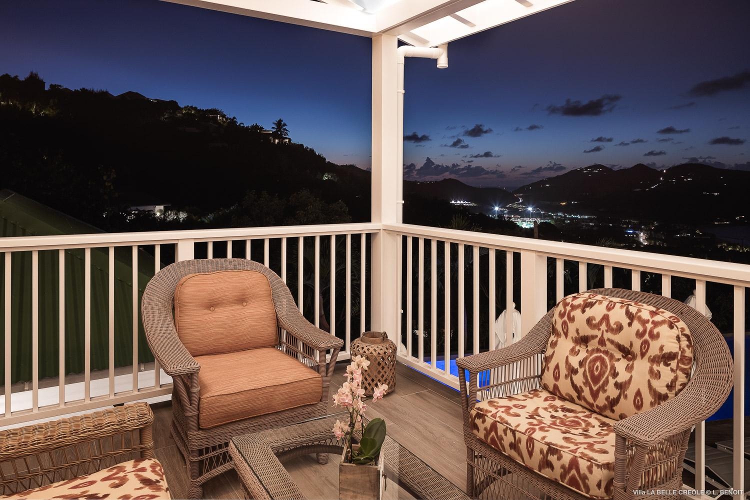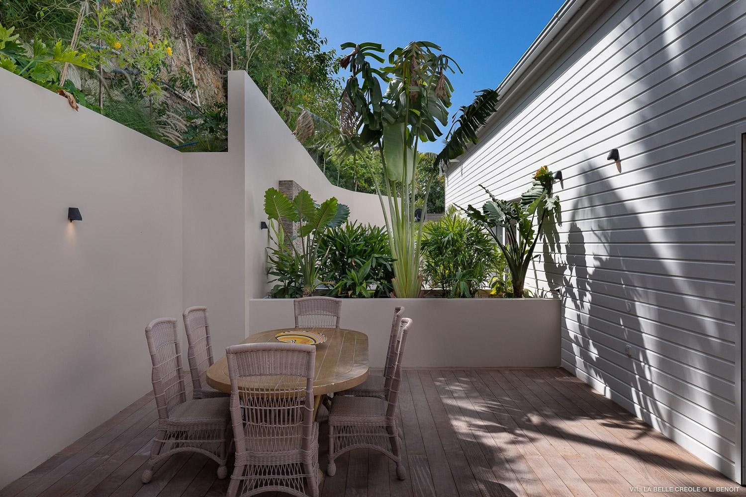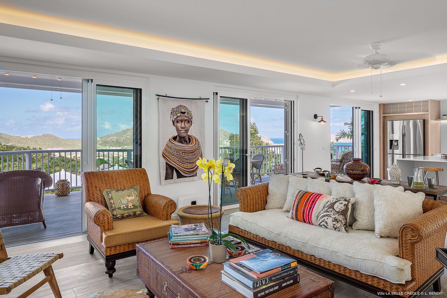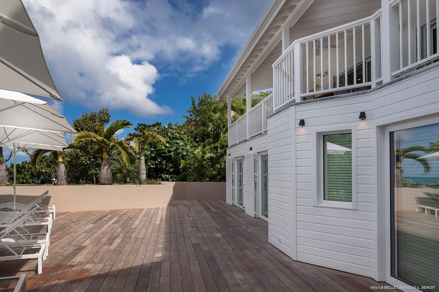 The decoration is mixing wood floor, terracotta, white colonial furniture, dark exotic wood with white sofas and white ceiling that gives a Caribbean and a Colonial atmosphere.