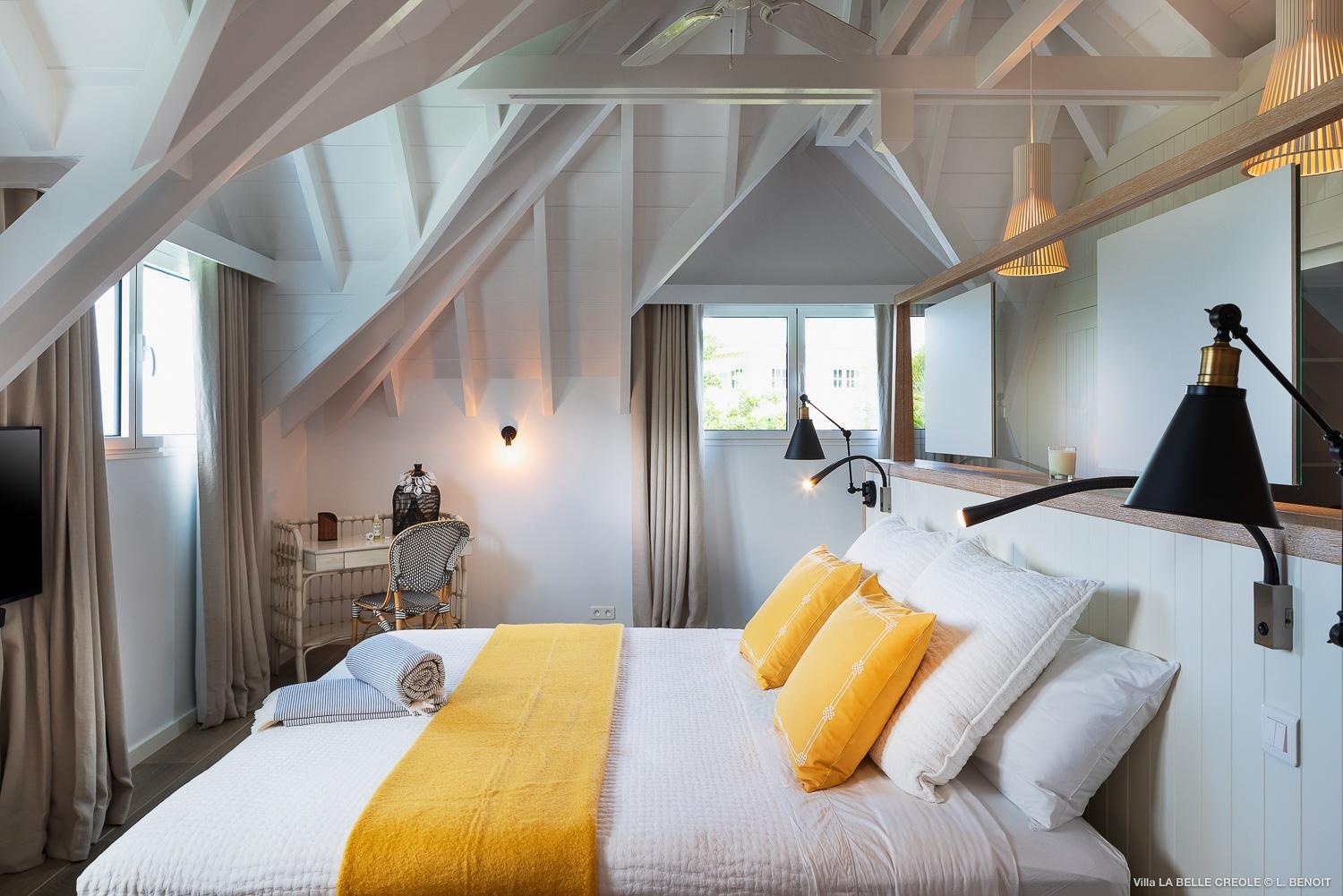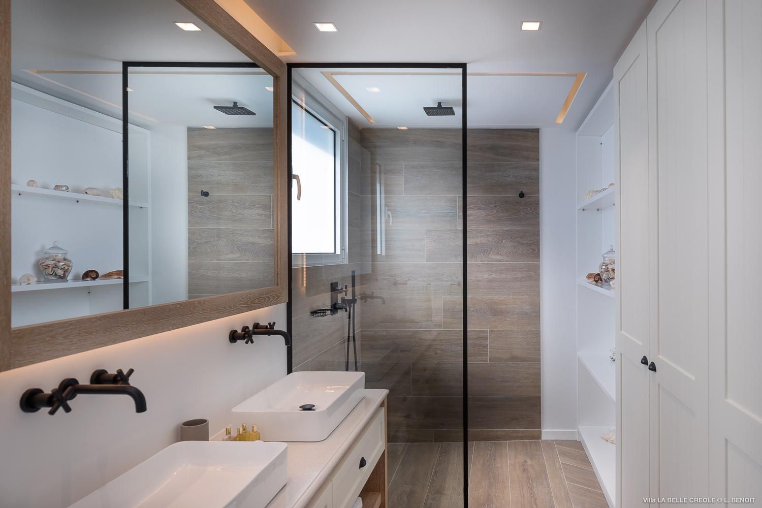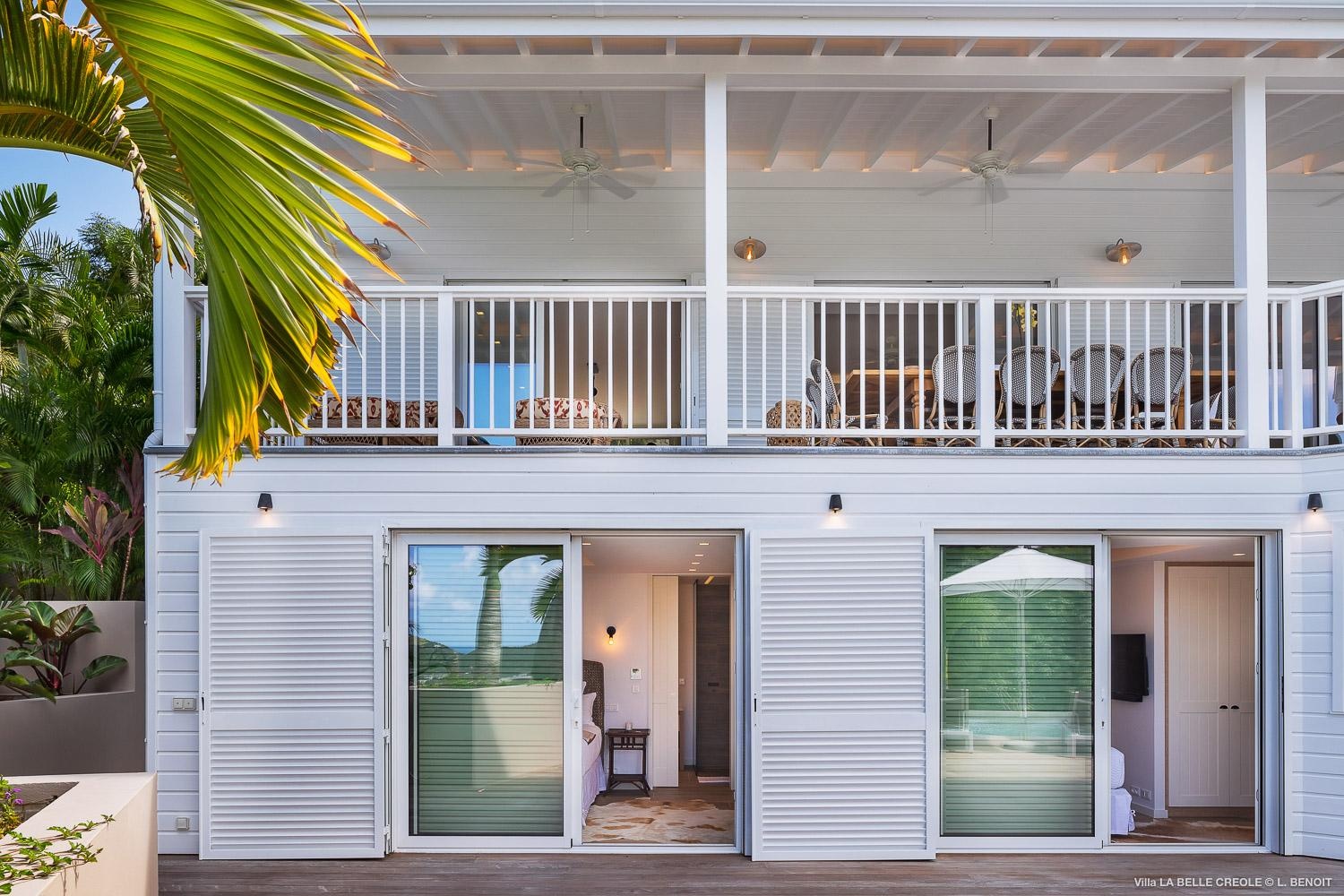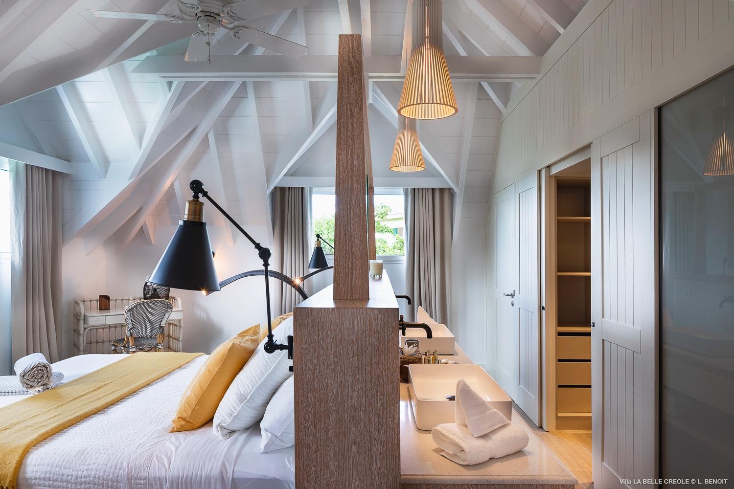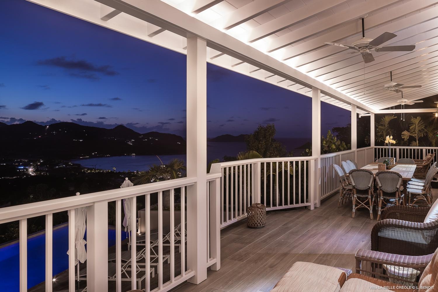 The decoration is mixing wood floor, terracotta, white colonial furniture, dark exotic wood with white sofas and white ceiling that gives a Caribbean and a Colonial atmosphere.