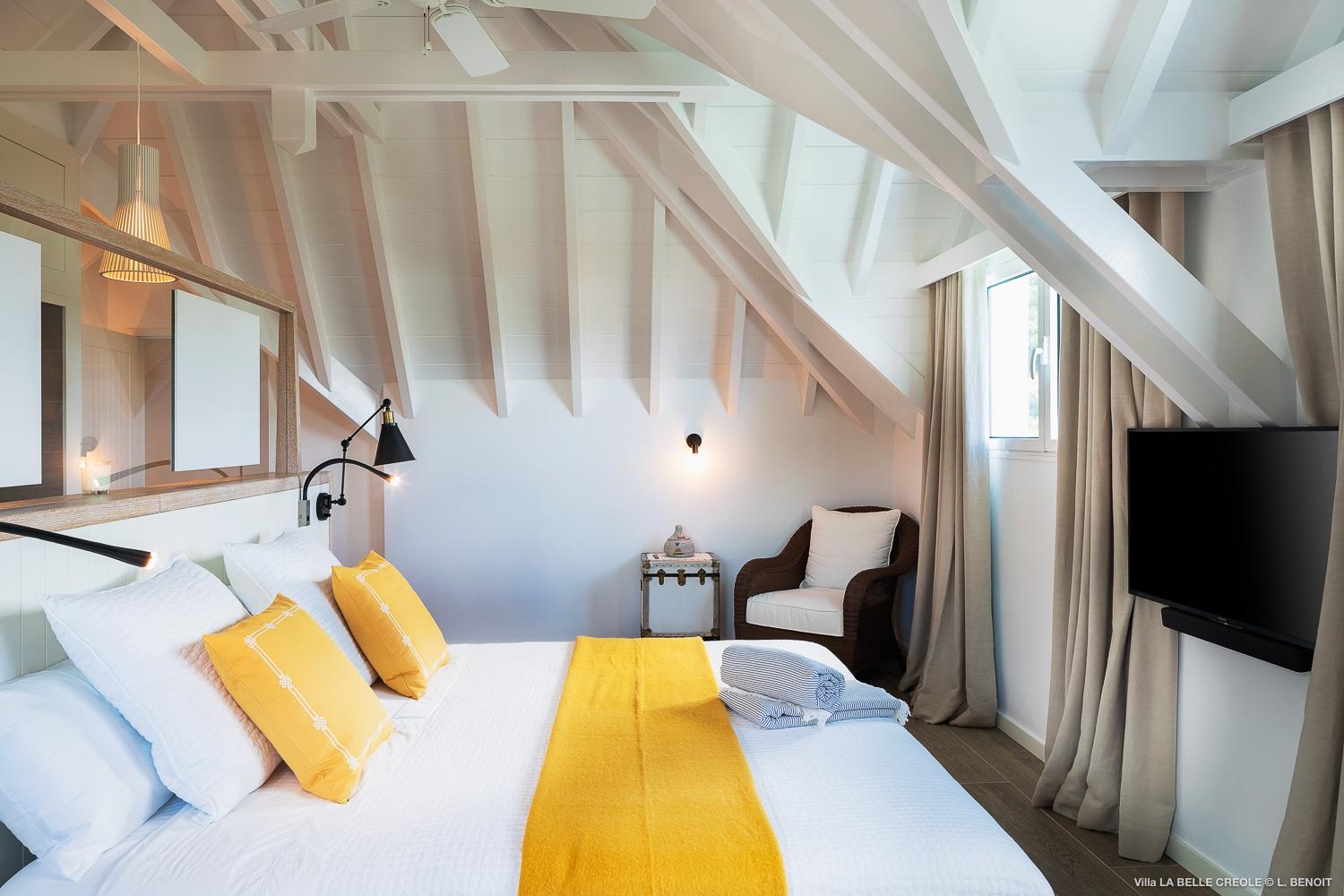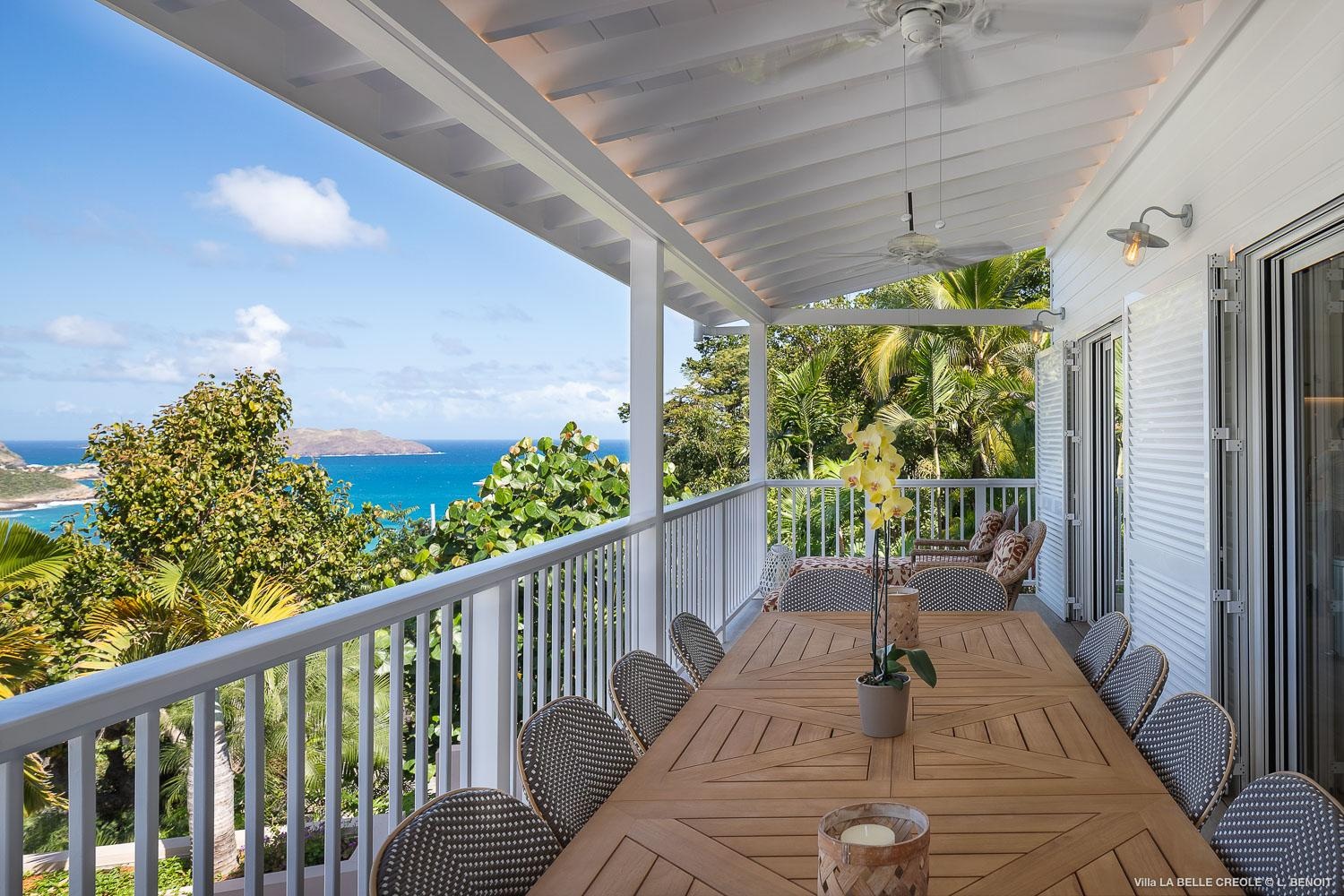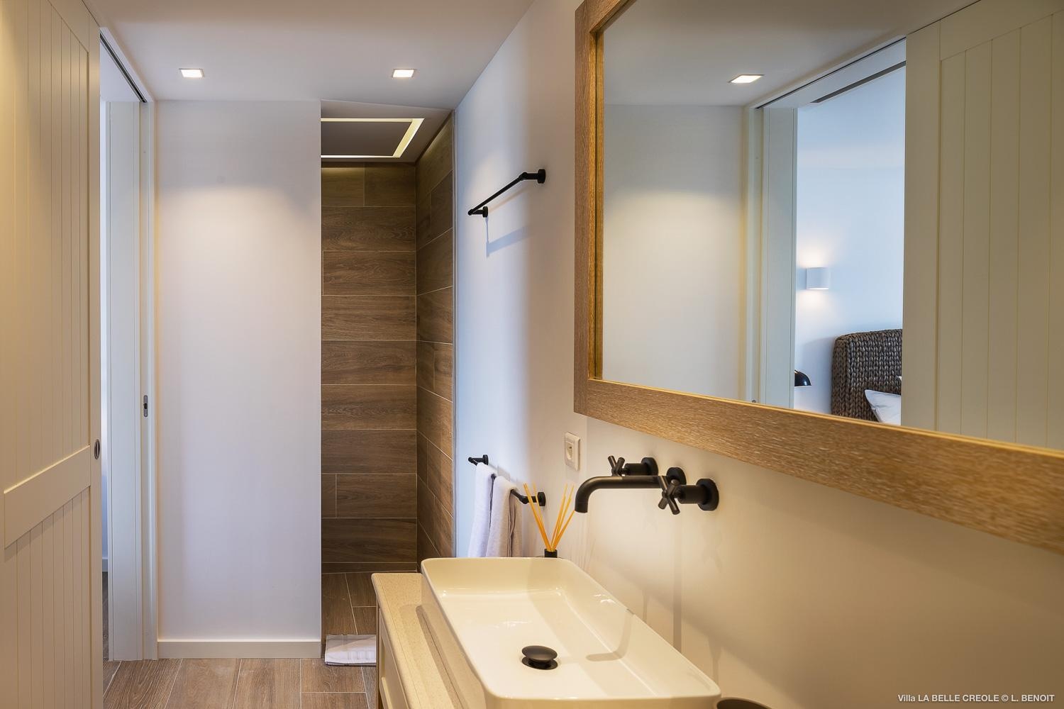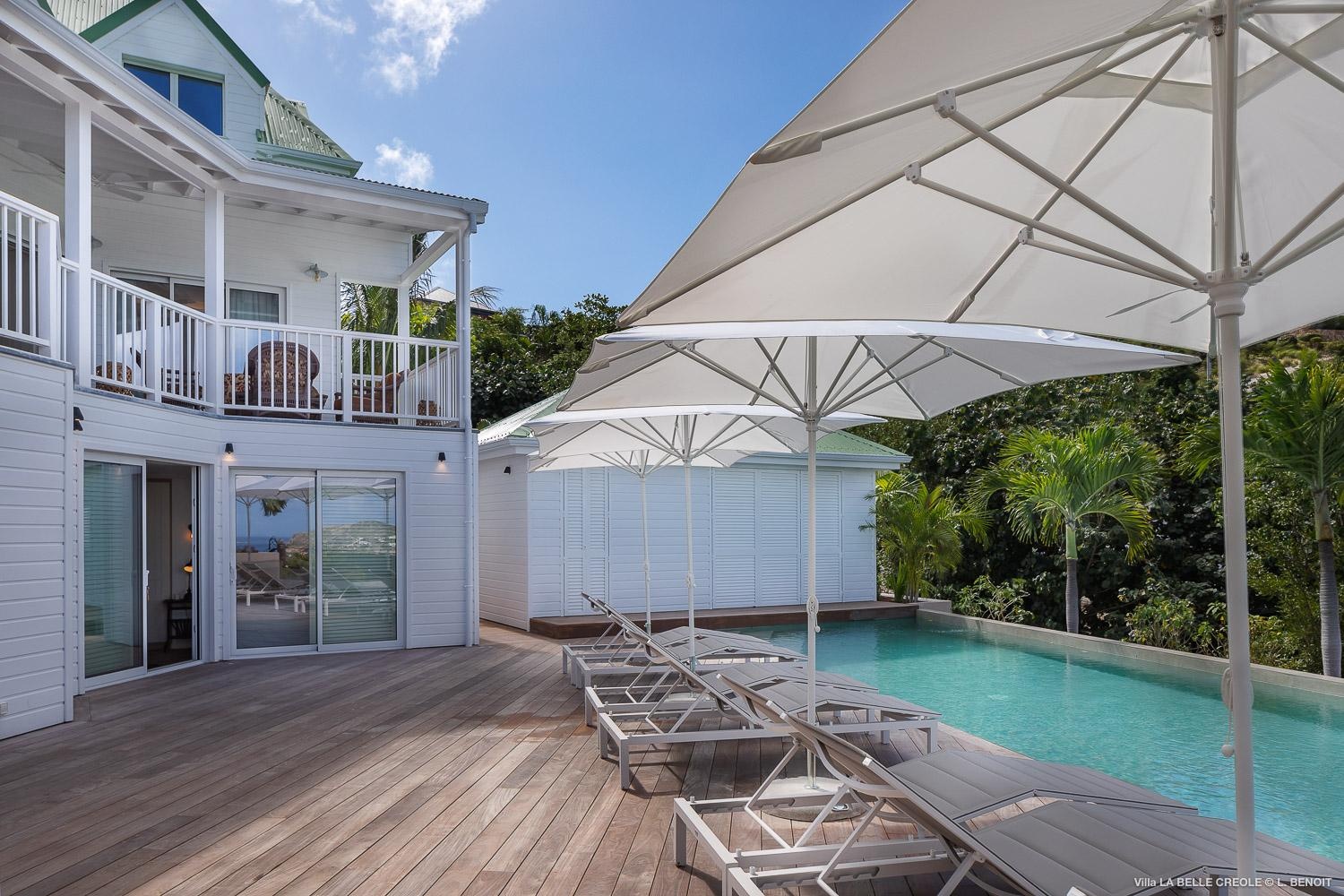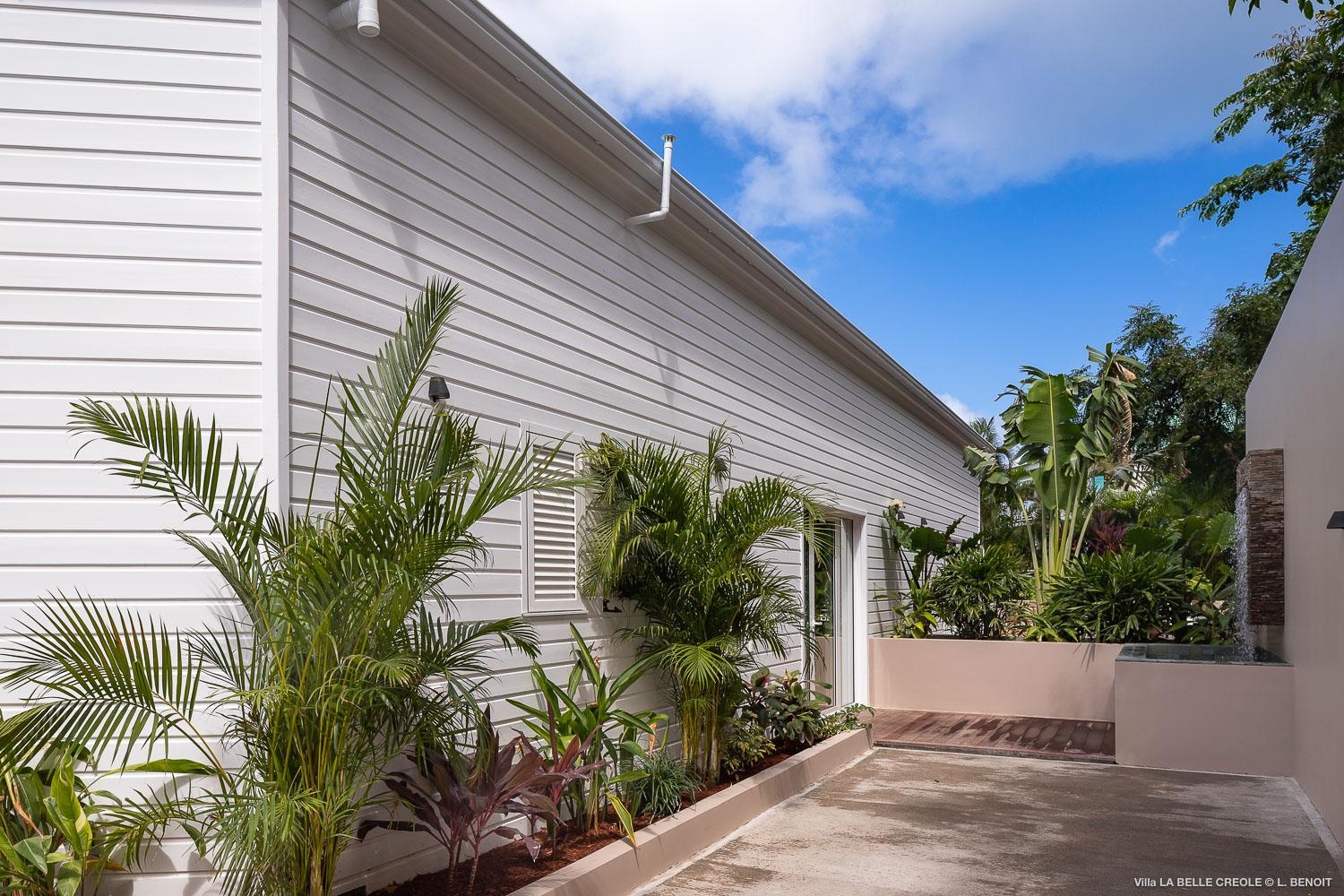 The decoration is mixing wood floor, terracotta, white colonial furniture, dark exotic wood with white sofas and white ceiling that gives a Caribbean and a Colonial atmosphere.