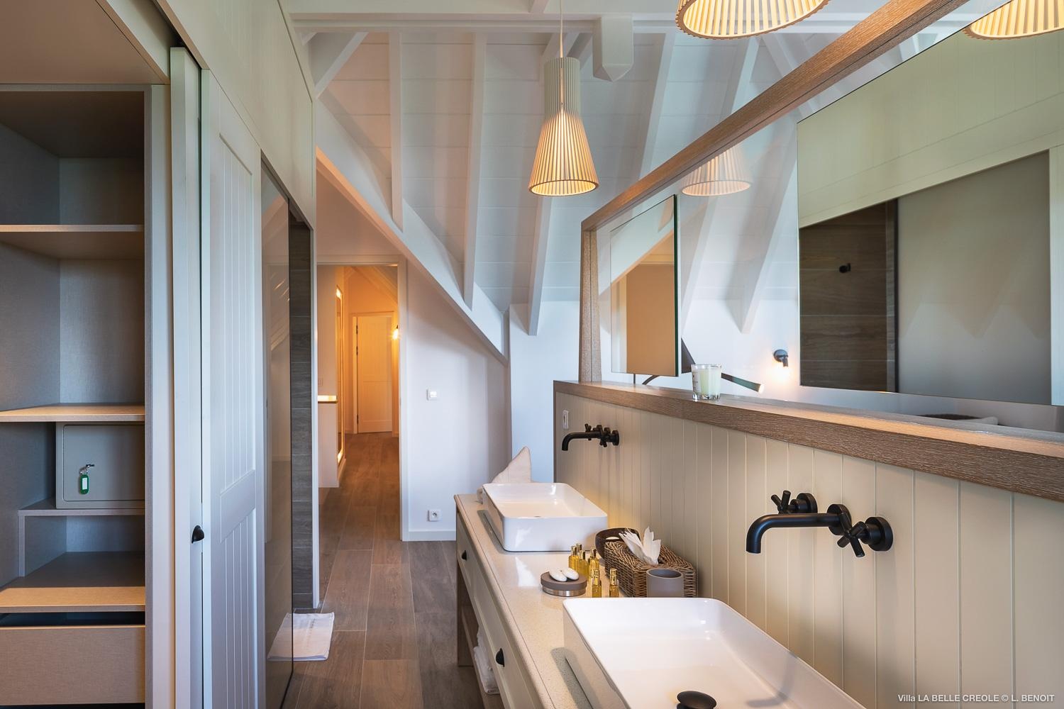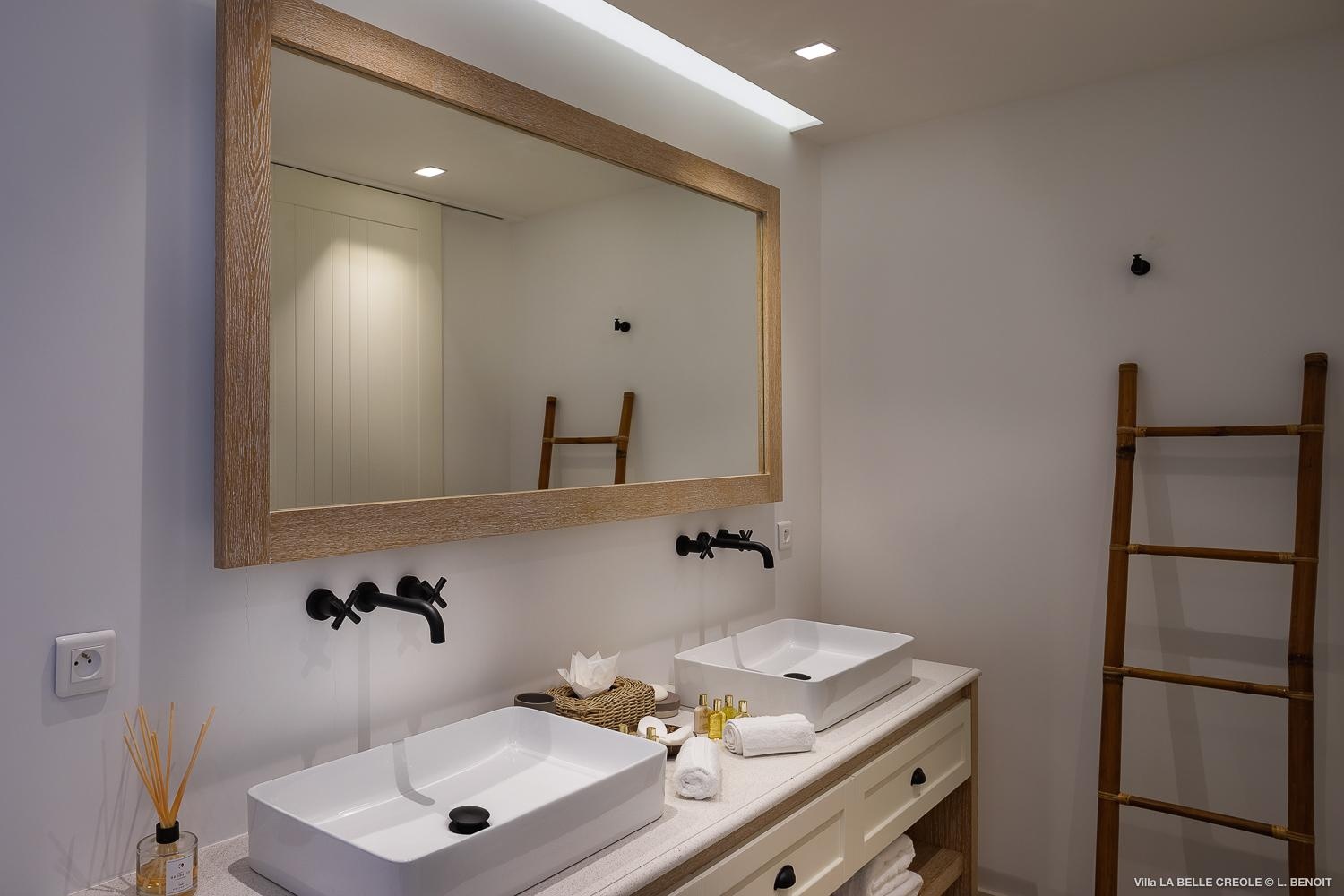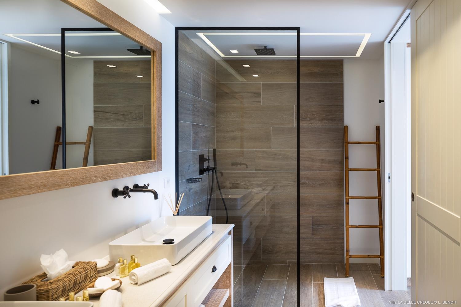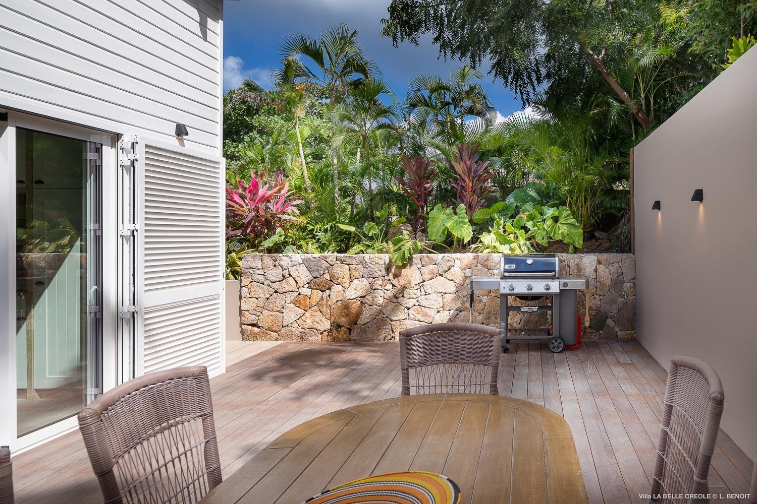 The decoration is mixing wood floor, terracotta, white colonial furniture, dark exotic wood with white sofas and white ceiling that gives a Caribbean and a Colonial atmosphere.