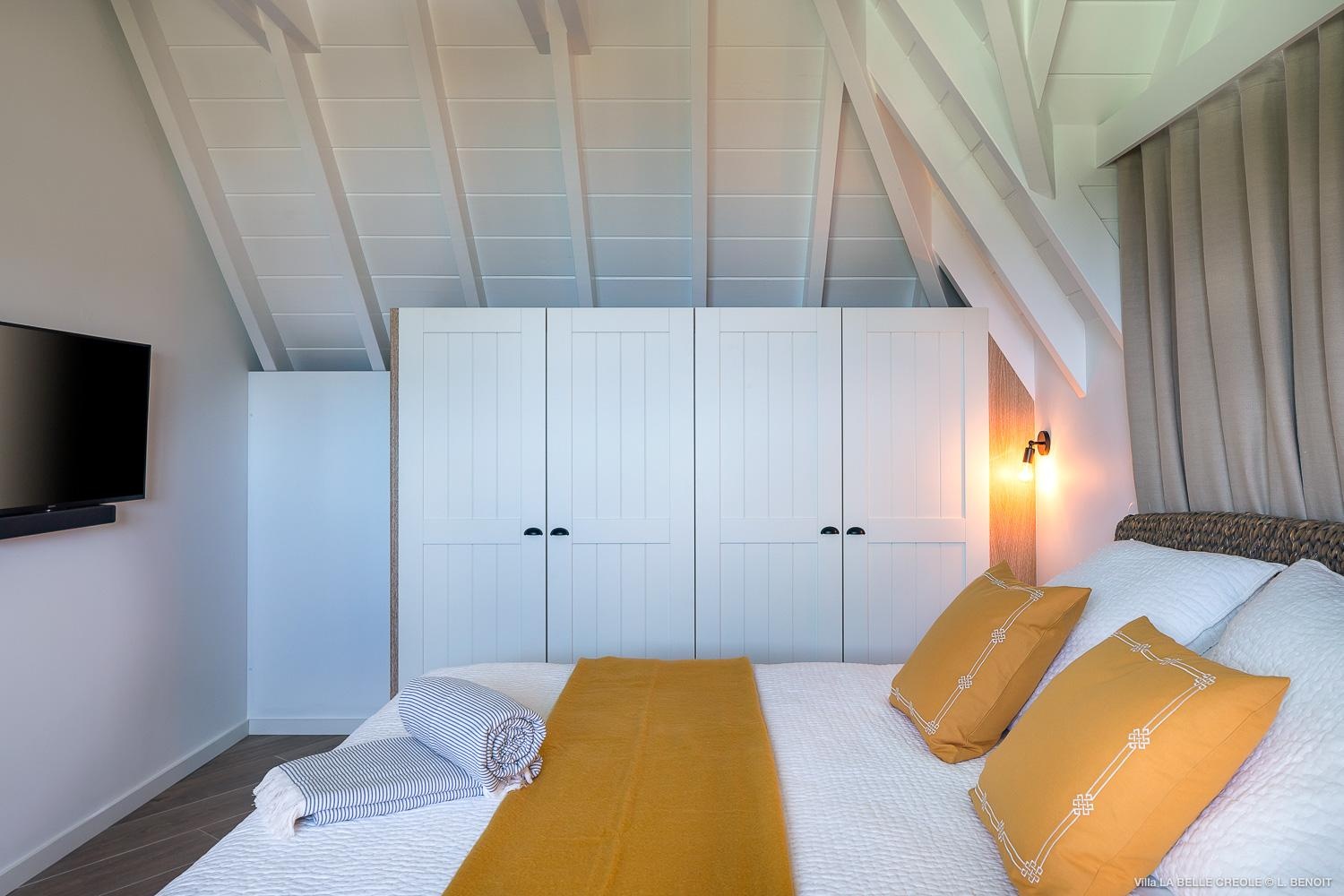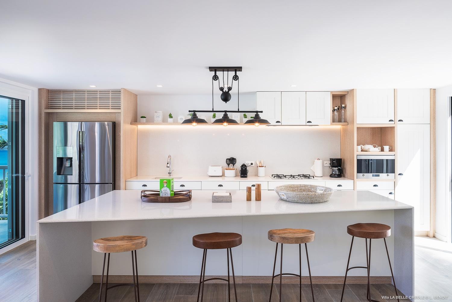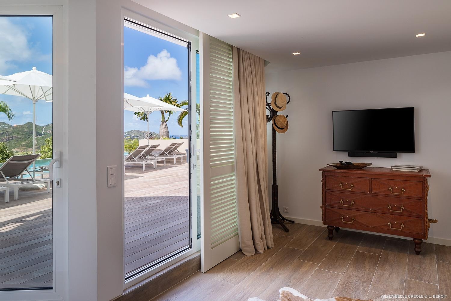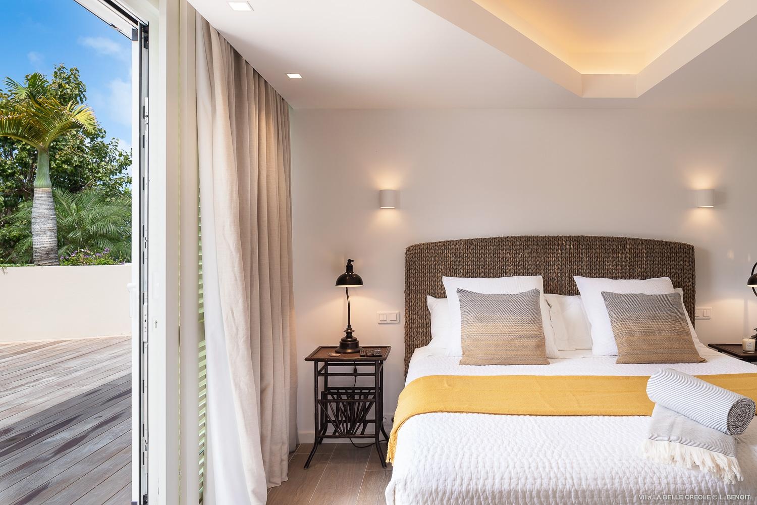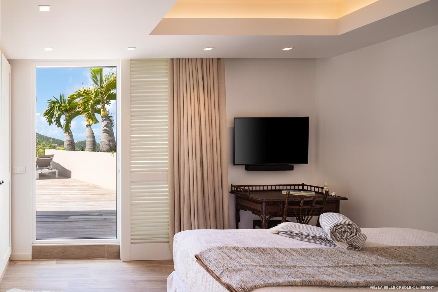 The decoration is mixing wood floor, terracotta, white colonial furniture, dark exotic wood with white sofas and white ceiling that gives a Caribbean and a Colonial atmosphere.