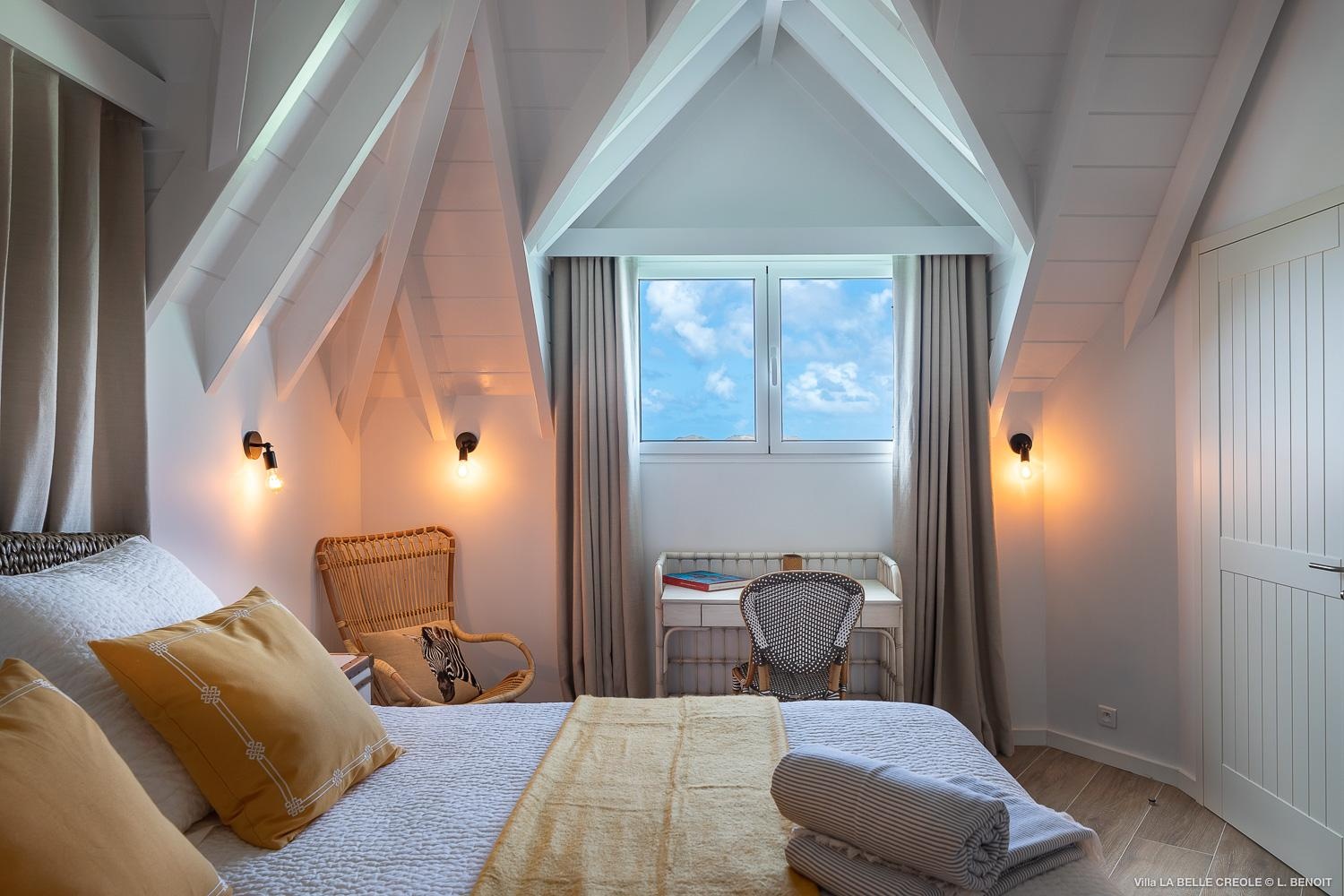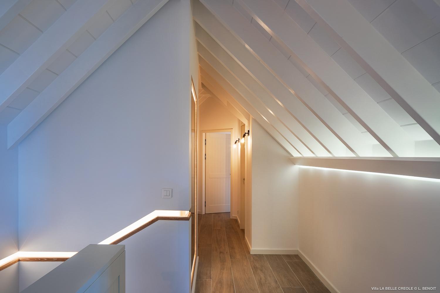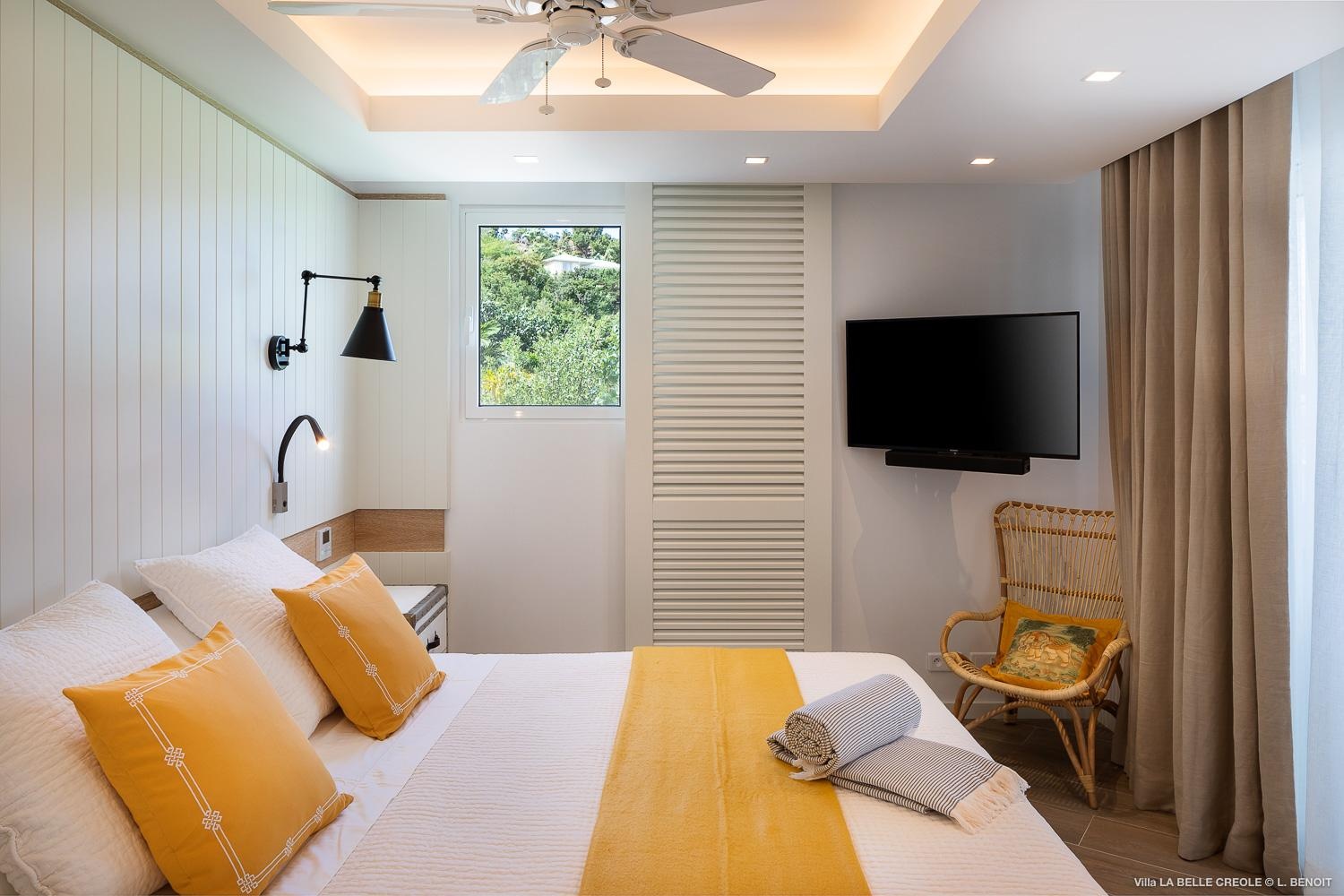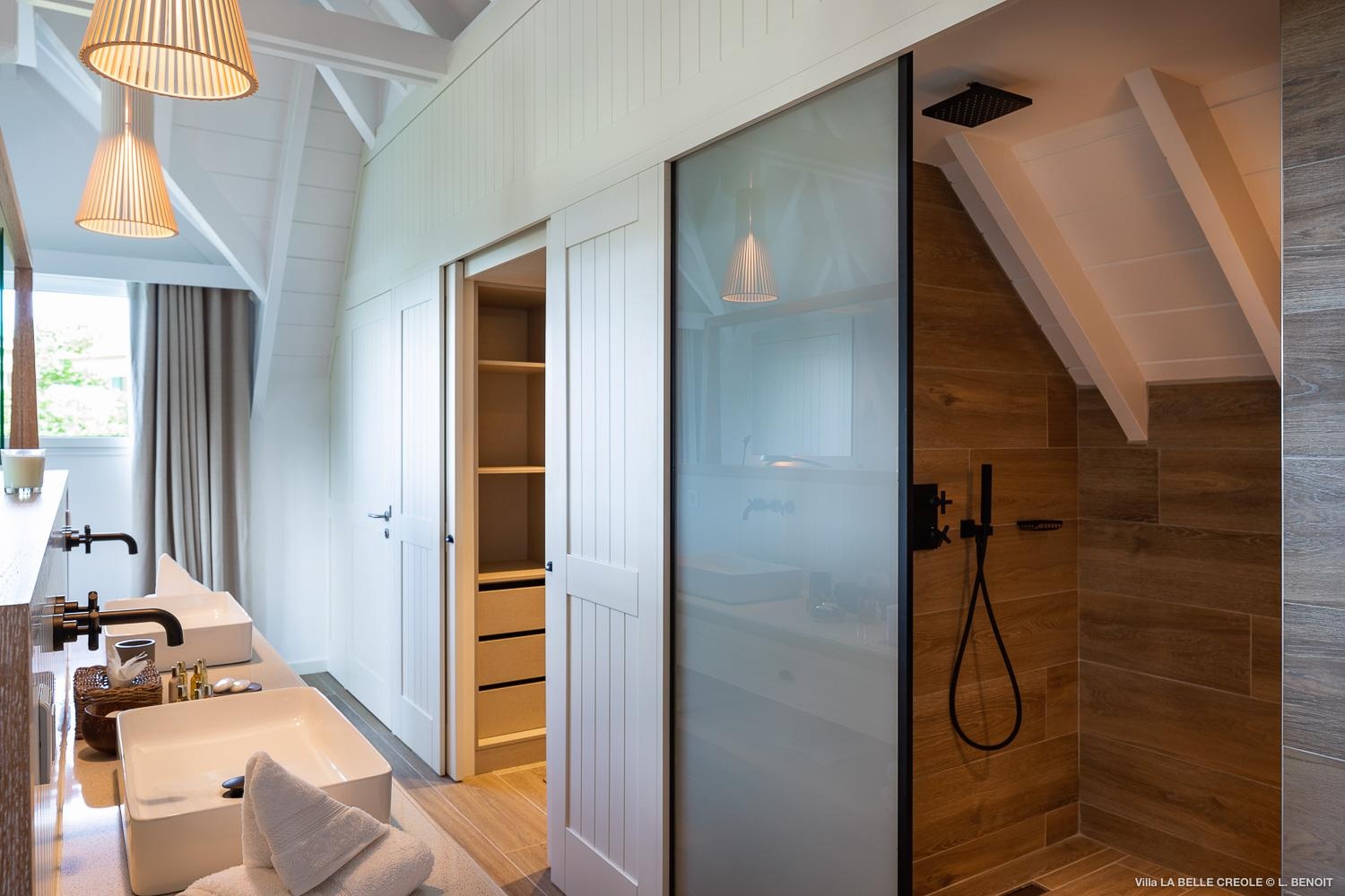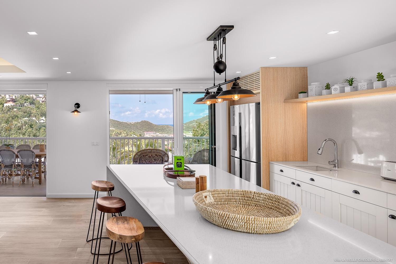 The decoration is mixing wood floor, terracotta, white colonial furniture, dark exotic wood with white sofas and white ceiling that gives a Caribbean and a Colonial atmosphere.