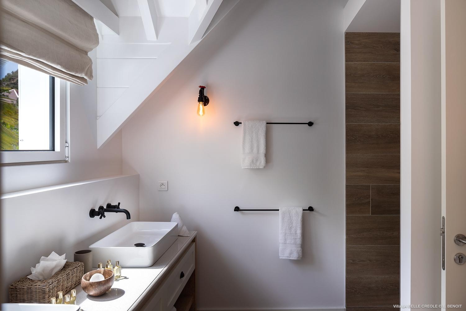 The villa is built on three levels. On the pool one are three bedrooms, on the first floor you will find the living and the kitchen and on the upper level, three bedrooms, two of them are sharing a bathroom.