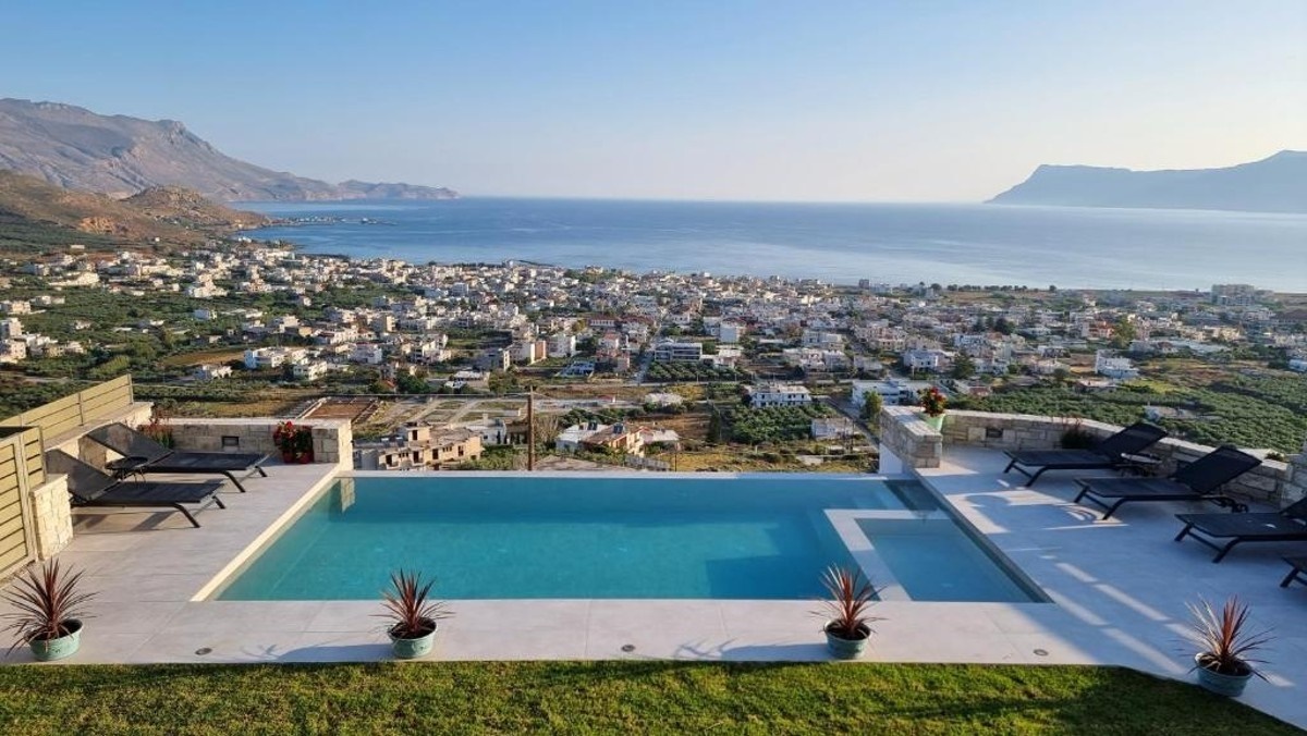 This palatial villa is built on one of the best locations in the municipality of Kissamos. The property offers spectacular views over the surrounding hills, the deep blue sea, and the city of Kissamos. The villa is only a 5-minute drive from the town, which has all kinds of shops, services, and amenities including schools, banks, supermarkets, cafes, restaurants, and more.