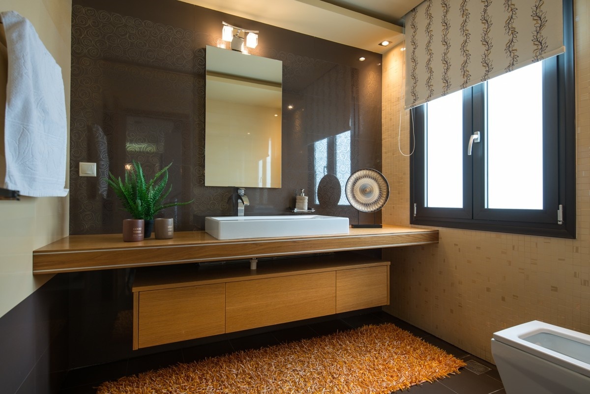 An internal staircase connects the floors. There is also a provision for the installation of an elevator which will connect all three levels. The upper floor consists of three bedrooms, each one with a closet and patio door to its balcony. The master bedroom has a walk-in closet and an en-suite bathroom. There is also a large attic with cupboards that can be used for storage, as a guesthouse, or as a playroom. The large bathroom on the floor also has a shower and a laundry chute. The basement is approximately 180 sqm and is consisted of a huge garage with an electric door, an open-plan kitchen, a living area, a bedroom, a bathroom, and a laundry room.