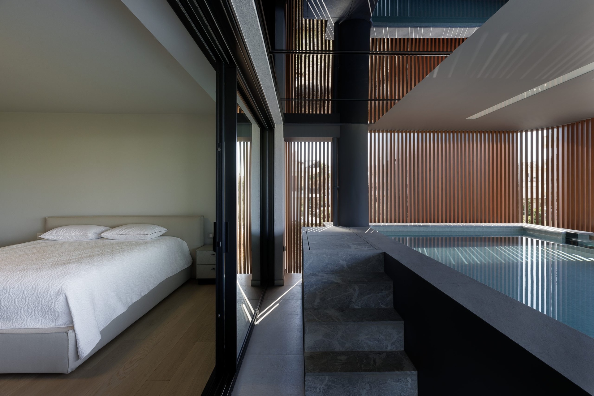 Walking through the upper living room, you enter the grand master suite — a private domain with balconies and direct access to the roof garden. Overlooking the swimming pool and the sea beyond, it crowns the residence with space, privacy, and distinction.