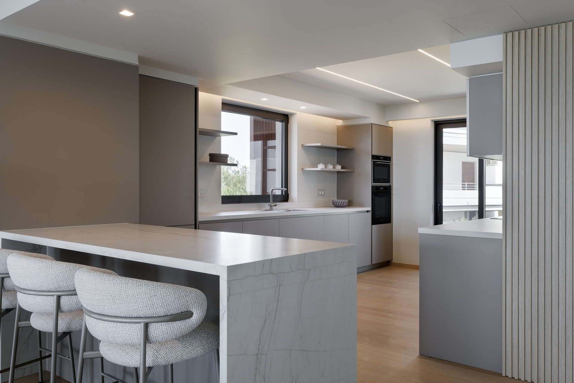 Sophisticated yet highly functional, the kitchen is finished with sleek materials and a smart layout. A small adjoining balcony adds a practical extension, enhancing light, air, and everyday ease