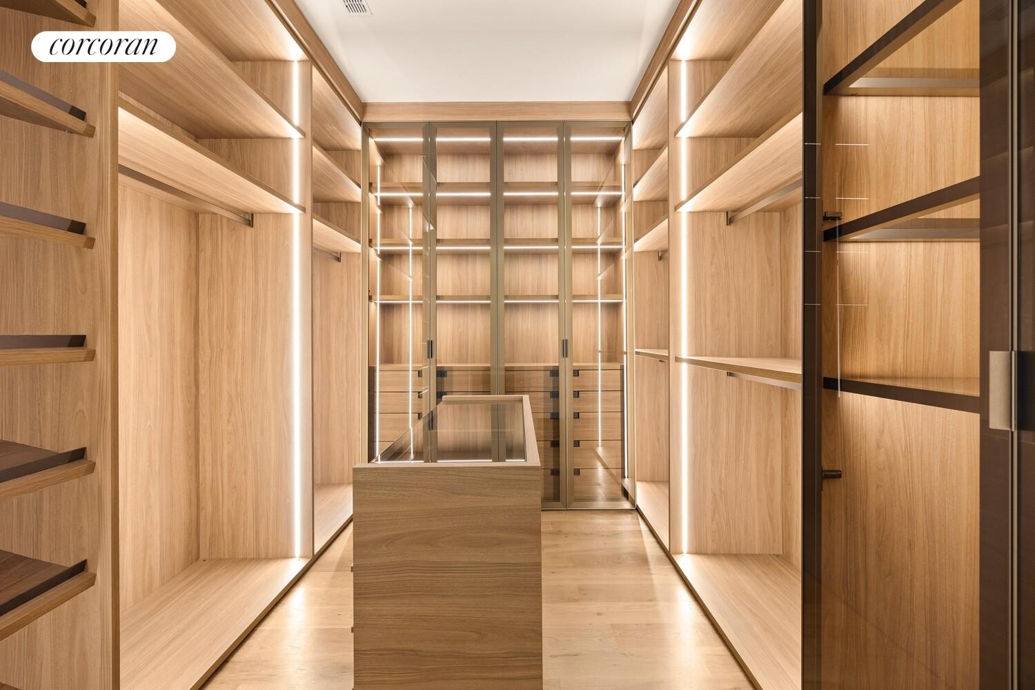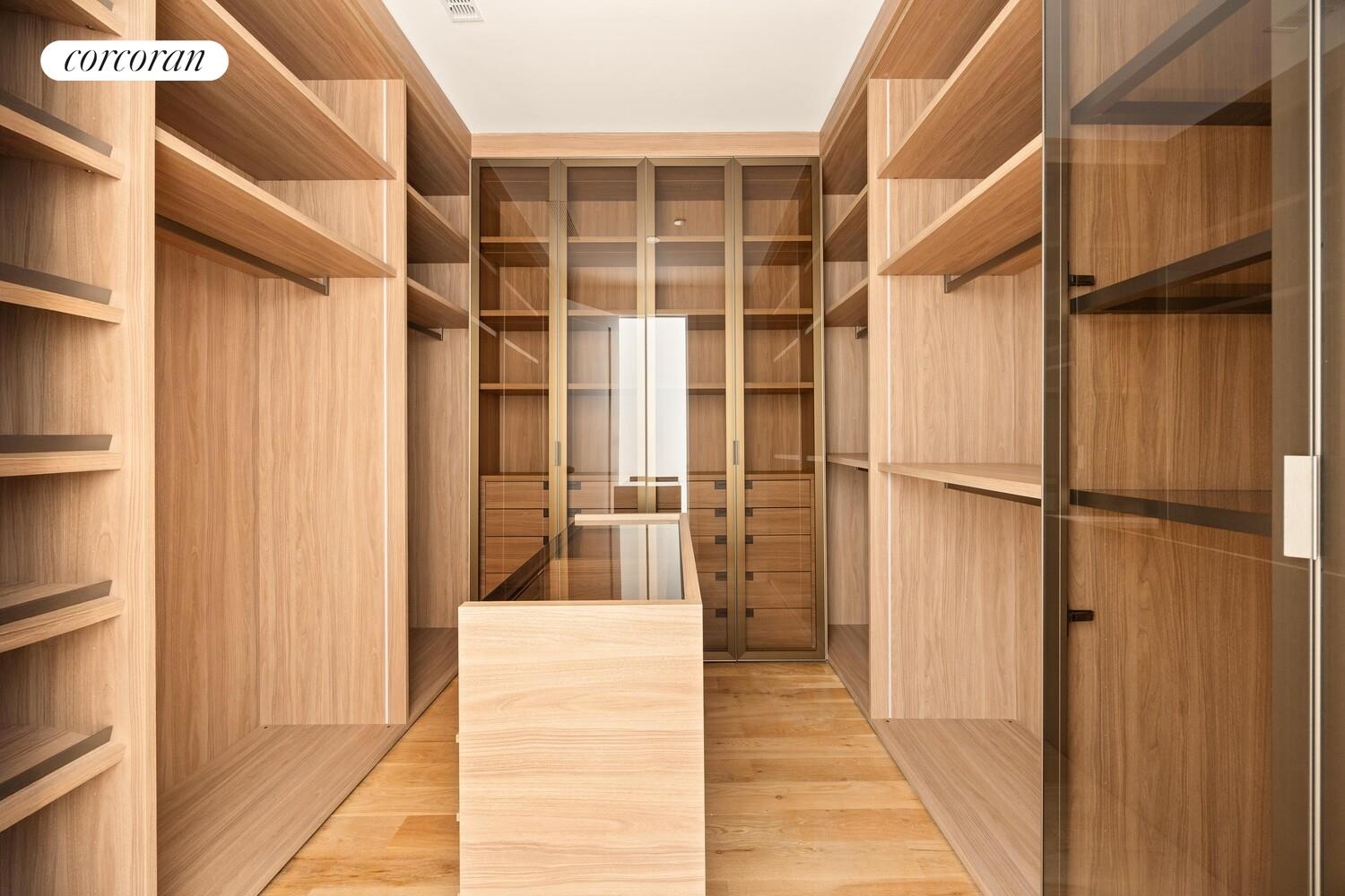 The second floor is dedicated entirely to a spacious and multi-functional primary suite. The oversized bedroom features seven floor-to-ceiling windows across three exposures, flooding the space with natural light. A separate office or bonus room/nursery adds versatility, while the showstopping walk-in closet offers extensive custom storage with integrated lighting and a storage island. The spa-like windowed primary bathroom is a serene retreat, featuring a freestanding soaking tub, creamy Zellige tile, an extra-large glass shower, elegant brushed brass Kohler thermostatic fixtures, and a fluted wood double vanity topped with marble. The extra bonus on this floor is a windowed laundry room with full sized LG side-by-side washer and (vented) dryer, a deep sink, and abundant storage. The third and fourth floors offer four generously sized bedrooms-two per level-each with its own ensuite bathroom, custom vanity, and fully built-out custom closet. All bedrooms are notably wide, enhancing the home's sense of space and flexibility. A 2nd laundry closet is conveniently located on the top floor landing.