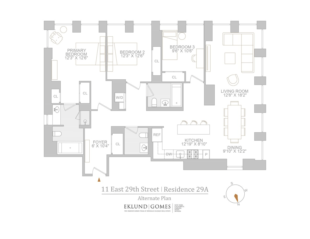 Eklund Gomes Team presents soaring luxury with iconic views, perched on the 29th floor of the coveted Sky House, this stunning two bedroom, two and a half bathroom corner residence offers panoramic, 360-degree views of New York's most iconic landmarks-including the Empire State Building, the Met Life Clock Tower, and both the East and Hudson Rivers. The unit boasts floor-to-ceiling windows and 11 foot ceilings flood the space with natural light, creating an airy, dramatic backdrop for luxury living.