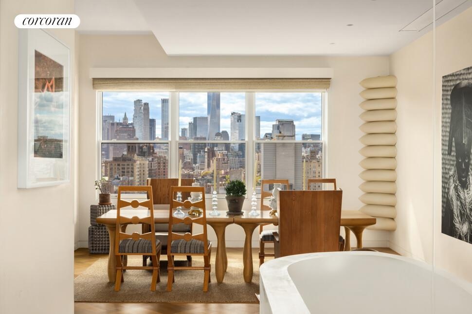 At the center of the home, a chef-caliber Vipp kitchen makes a bold statement with industrial elegance and refined functionality. Outfitted with Gaggenau appliances, a Miele double refrigerator, and a LanboPro wine fridge, it's the ideal setting for both casual meals and formal gatherings. Accordion-style NanaWall glass doors open seamlessly to the terrace, creating a private outdoor sanctuary for al fresco dining, entertaining, or simply enjoying the skyline.