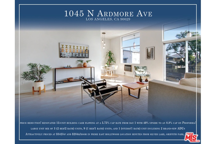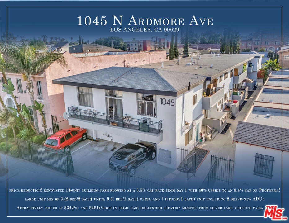 3rd Price Reduction! Renovated 13-unit building cash flowing at an amazing 5.75% Cap Rate from day 1 with 40% upside to an 8.8% Cap on Proforma! Attractively priced at only $329/SF and $273k/door with a large unit mix consisting of 3 (2bed/2bath) units, 9 spacious (1bed/1bath) units, and 1 (studio/1bath) unit. Majority of the units (7) have been renovated including 2 brand-new attached ADUs. Amenities include gated entry, communal laundry room, large balconies, large patios, as well as 9 parking spaces (4 of which have not been officially assigned and may be rented for additional income). Many units boast updated cabinets, flooring, lighting, bathrooms, and significant exterior improvements including soft-story retrofit. Prime East Hollywood location just minutes away from the Vermont/Santa Monica Metro station, Silverlake, Hollywood, West Hollywood as well as many hip neighborhood attractions, restaurants, bars, and shops such as Hollywood Walk of Fame, Griffith Observatory, Cara Hotel, Saffy's Restaurant, Courage Bagels, and many more.