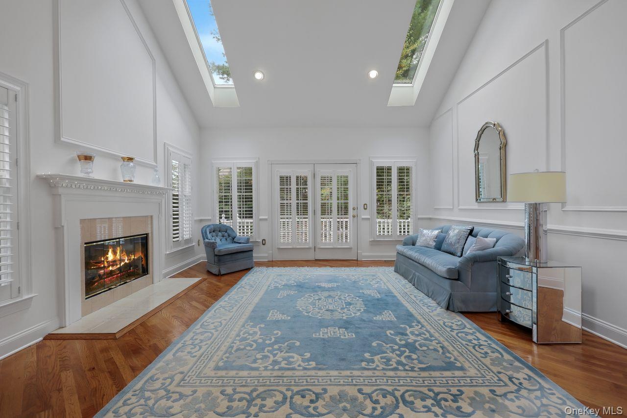 Inside, a sun-filled, open-concept layout greets you with soaring ceilings, skylights, and newly refinished hardwood floors that flow seamlessly throughout. The living and dining rooms are adorned with new plantation shutters, fresh interior paint, and elegant crown molding, creating an inviting and sophisticated atmosphere. The first-floor primary suite is a tranquil retreat, complete with a spa-inspired bath featuring a soaking tub, walk-in shower, and generous closet space.