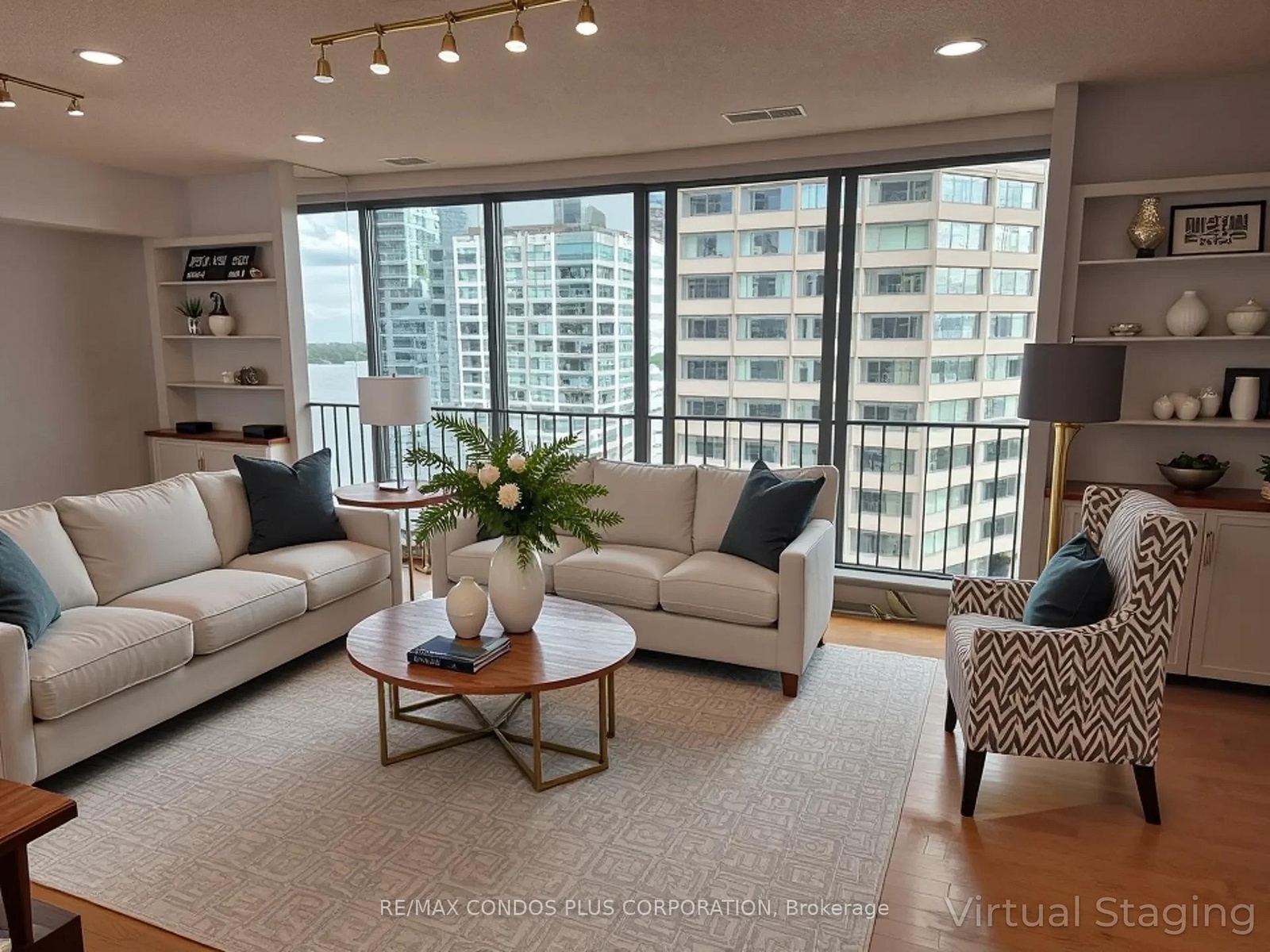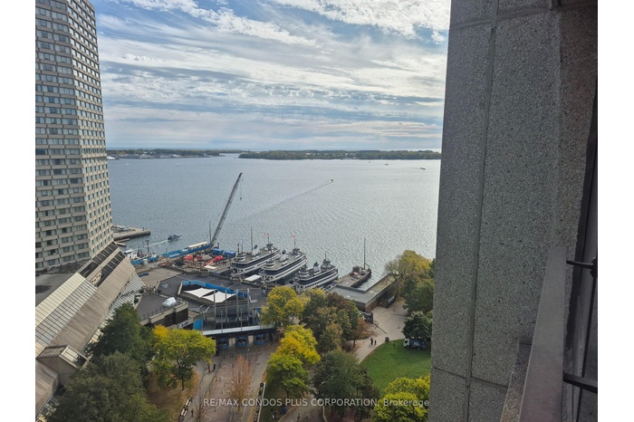 Waterfront Living! Freshly Painted and New Carpeting in Bedroom. This 2 level suite, over 1000 sq ft One (1) Bedroom with all utilities included - including Cable and Internet! Incredible building amenities include 24 hour concierge, 60 ft rooftop pool, huge garden terrace with BBQ's, fully equipped gym, sauna, squash court, private shuttle bus, visitors parking and guest suites at affordable prices. Superlative view of Lake Ontario and Toronto Islands. As per building bylaw this is a No Pets allowed building. Note - virtual staging is used in some photos