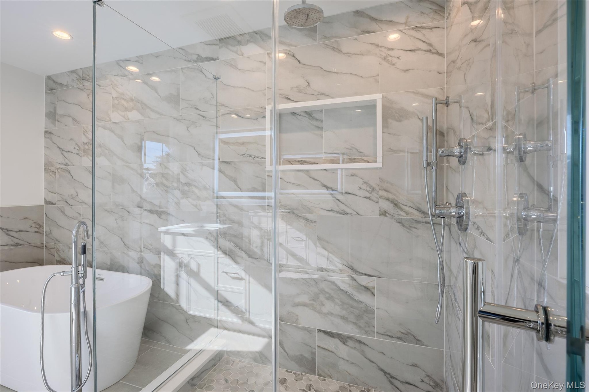 - Bathroom with a freestanding bath, tile walls, and a marble finish shower