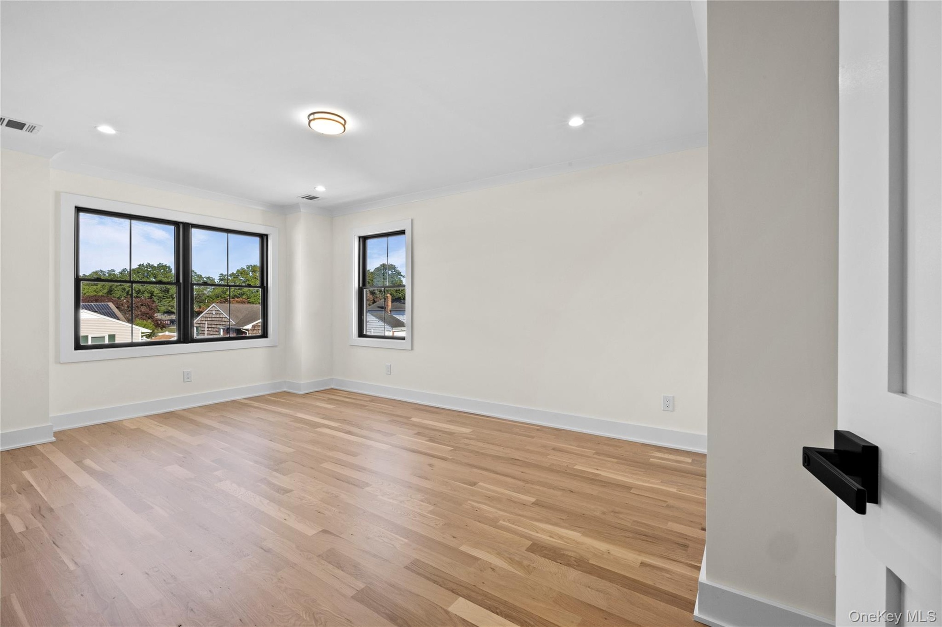 - Empty room featuring light wood-style floors, ornamental molding, and recessed lighting