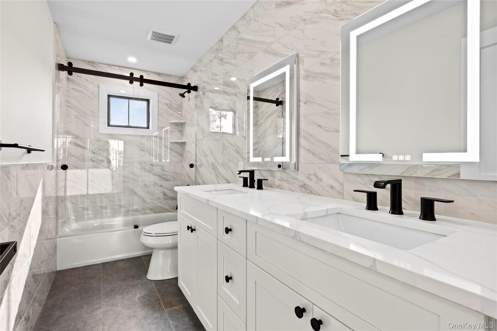 - Full bath featuring tile walls, a freestanding tub, healthy amount of natural light, double vanity, and a marble finish shower