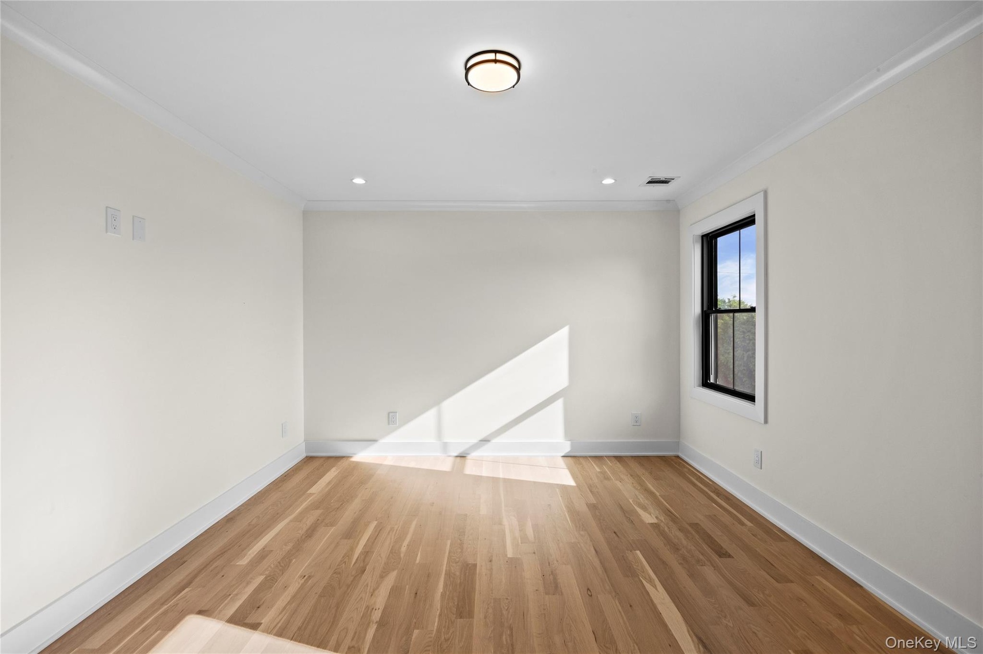- Unfurnished bedroom featuring ornamental molding, light wood-style floors, and recessed lighting